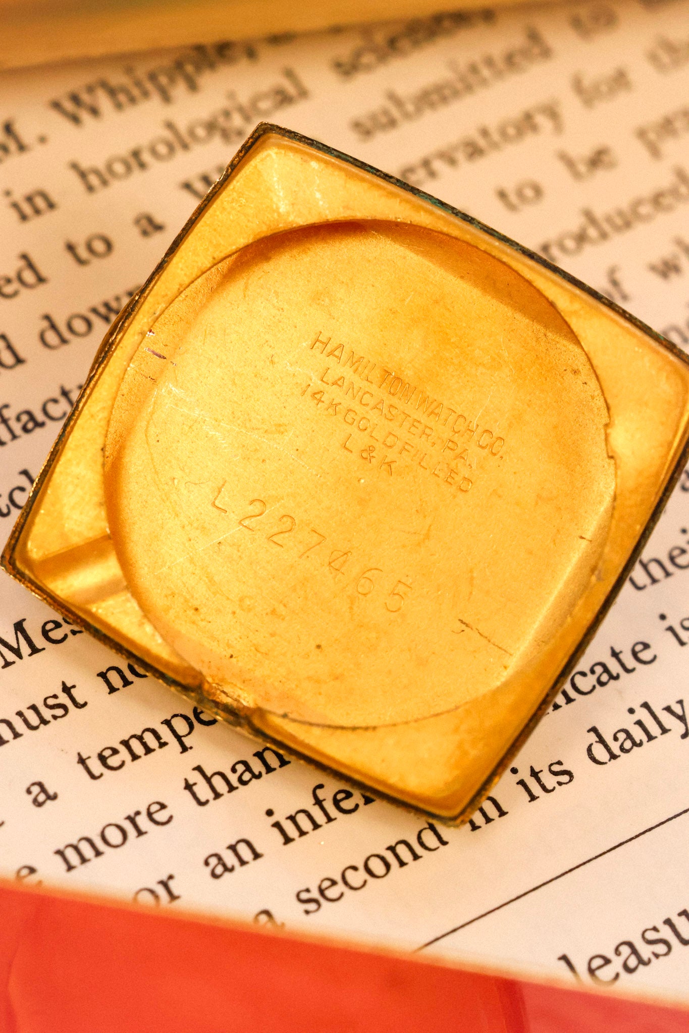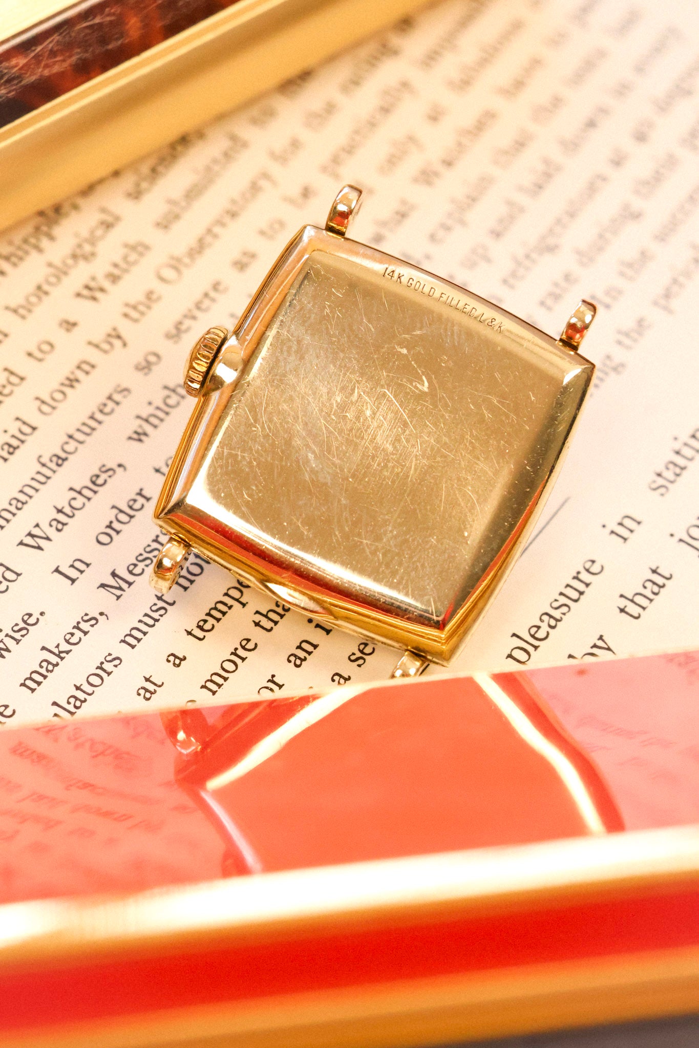 A marvelous piece of American watchmaking history! An original 1948 American made Hamilton Dyson with a 14K gold filled case, short distinct lugs, patina cream dial. The original alpha hands are sharp, applied indices. Comes with a lightly pre-loved aftermarket black croc grain leather strap.
