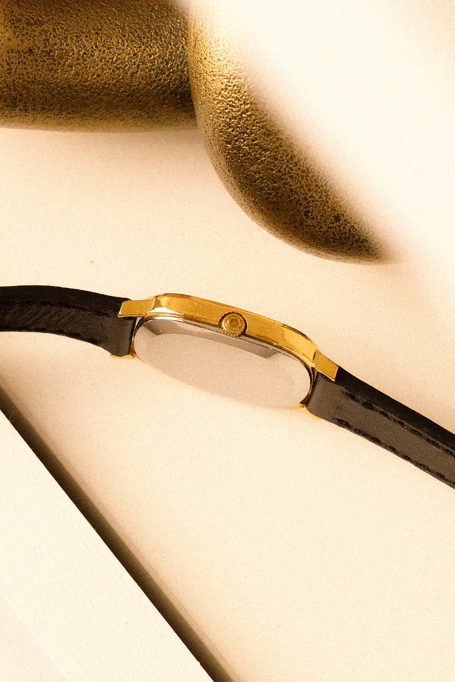 An absolutely stunning 1970s Omega De Ville featuring a gold plated ellipse case, golden dial, applied indices, elegant pencil hands, and original signed crown. Comes with a new aftermarket black leather strap. This piece is in excellent vintage condition and shows how beautifully preserved it has been for 50 years.