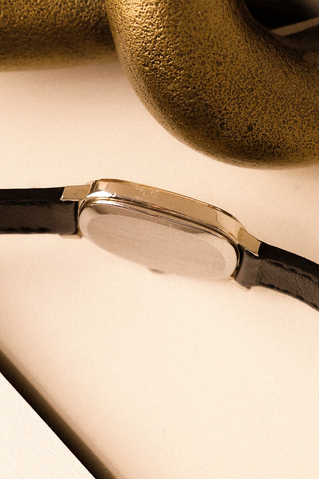 An absolutely stunning 1970s Omega De Ville featuring a steel ellipse case, white dial, printed Breguet-style numerals, elegant leaf hands, and original signed crown. Comes with a new aftermarket black leather strap. This piece is in excellent vintage condition and shows how beautifully preserved it has been for 50 years.