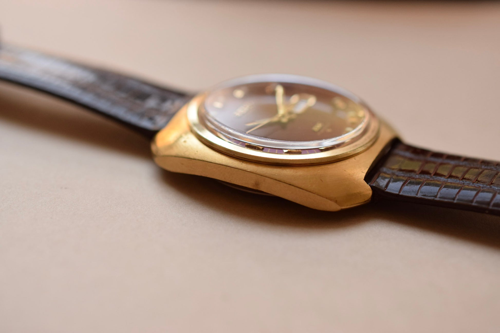 Classic Seiko with gold tone cushion case, deep crimson dial, applied lumed retro baton indices, lumed baton hands, day-date window at 3 o'clock, and acrylic crystal. Comes with a new old stock Seiko genuine lizard brown leather strap. This stunning piece was made in the Suwa factory.