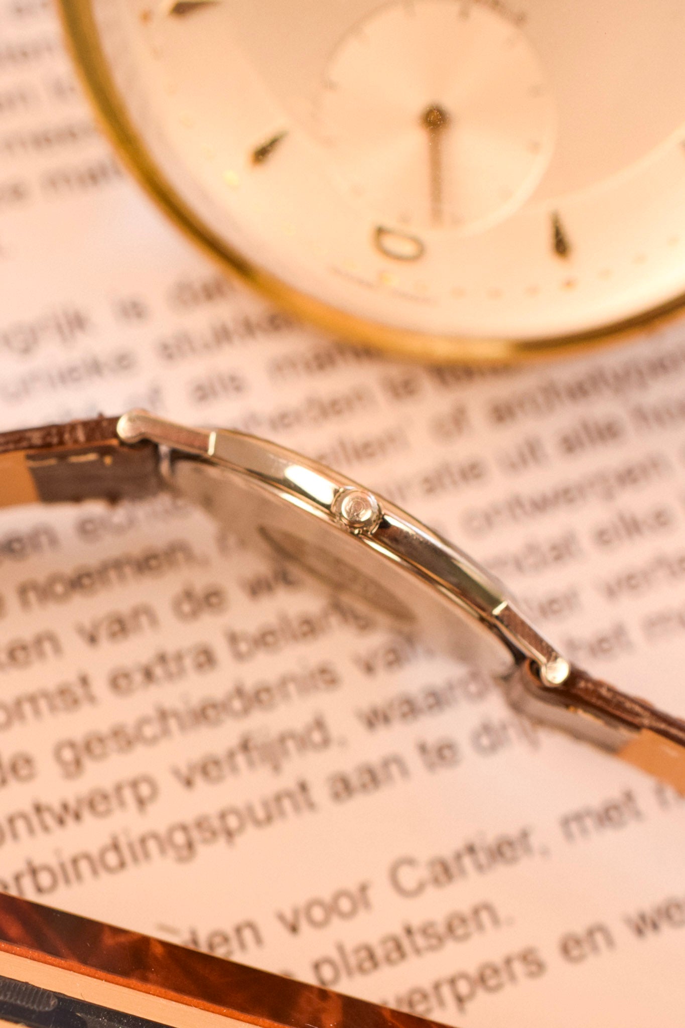 Classic Omega De Ville from the 80s with a minimalist aesthetic - featuring a slim steel case, silvery white dial, slim arrowhead applied markers, elegant leaf hands, original signed crown, and iconic De Ville Skyline insignia on the case back. Comes with a new aftermarket croc grain brown leather strap.