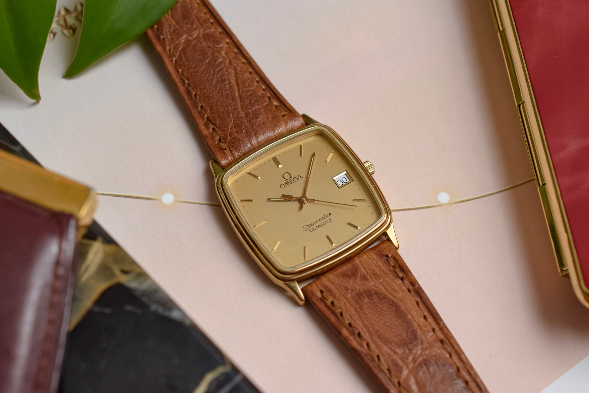 An absolutely stunning 1980s Omega Seamaster Monaco featuring a slim TV shaped gold plated case, champagne dial, applied indices, thin baton hands, date window, original signed crown, and the iconic hippocampus "Sea Horse" insignia on the caseback. Comes with a new old stock aftermarket croc grain brown leather strap.