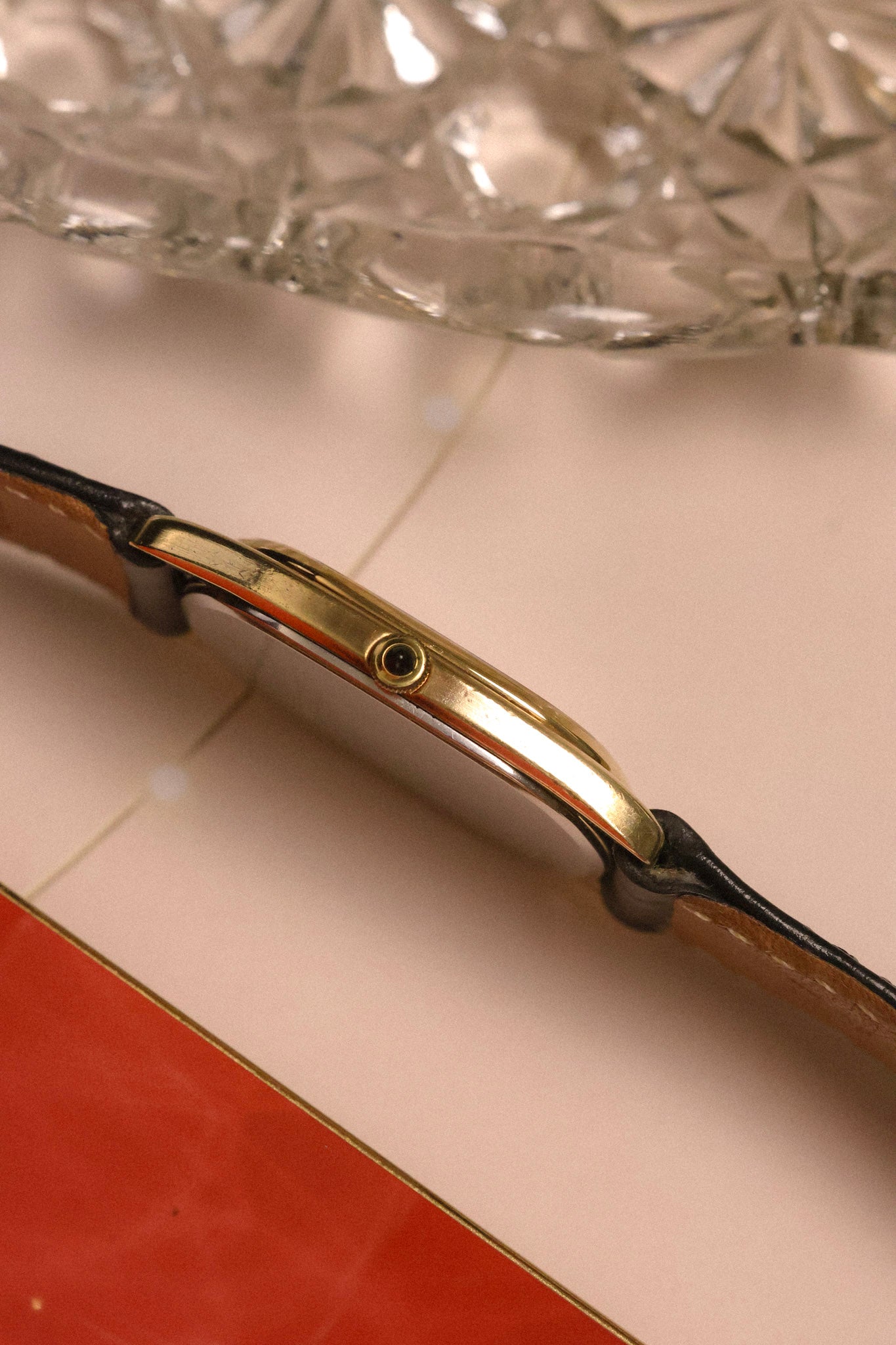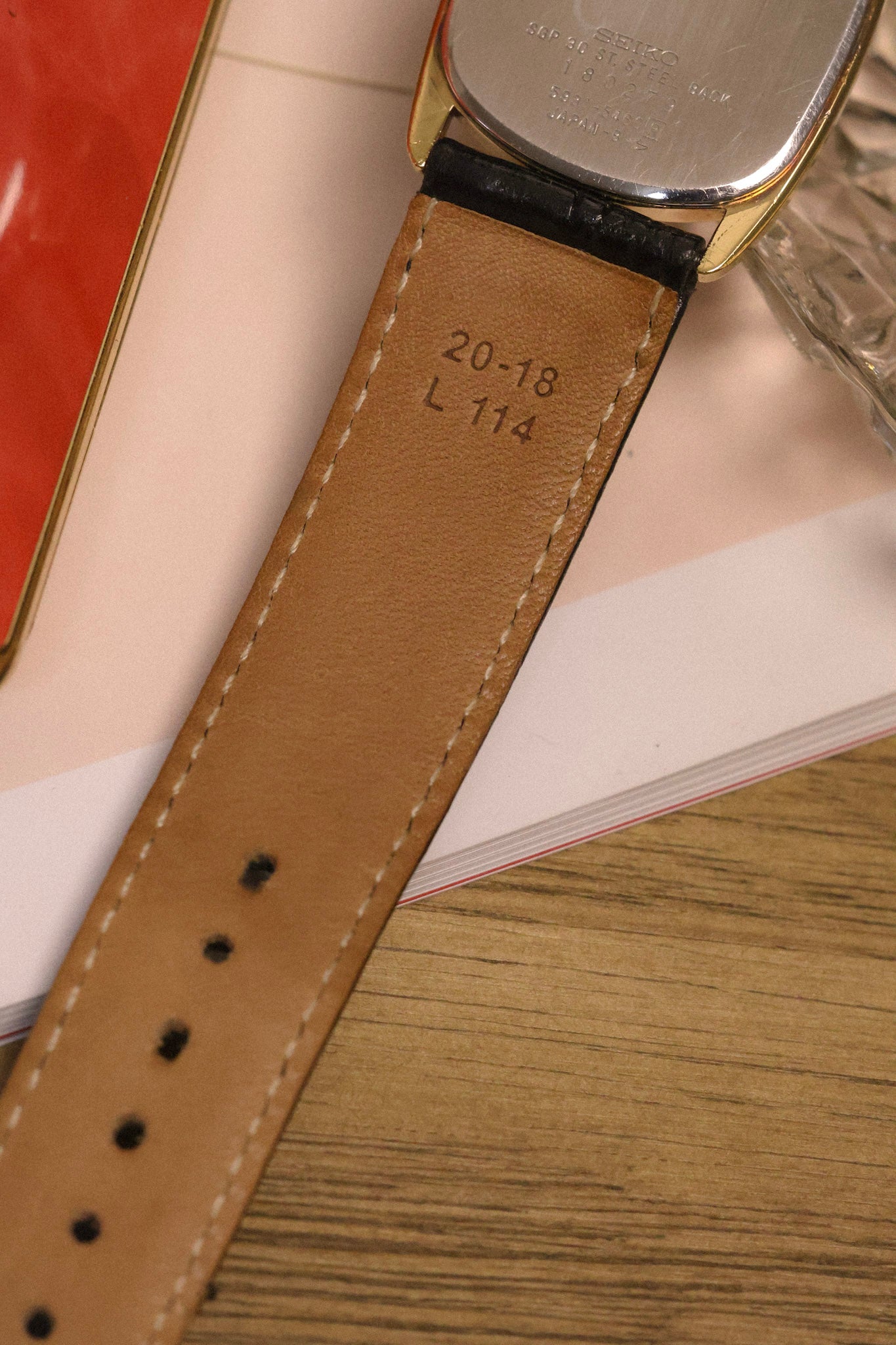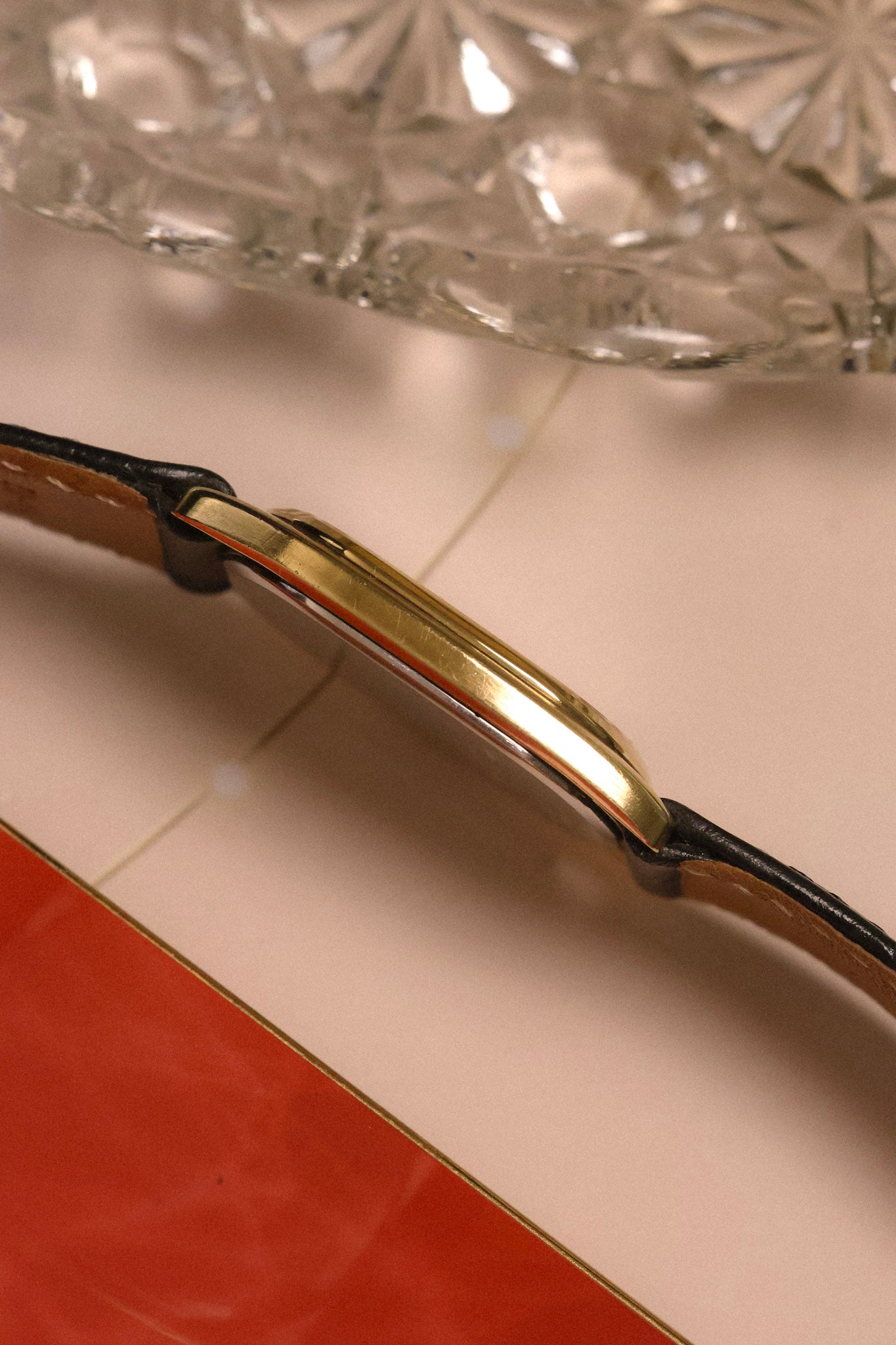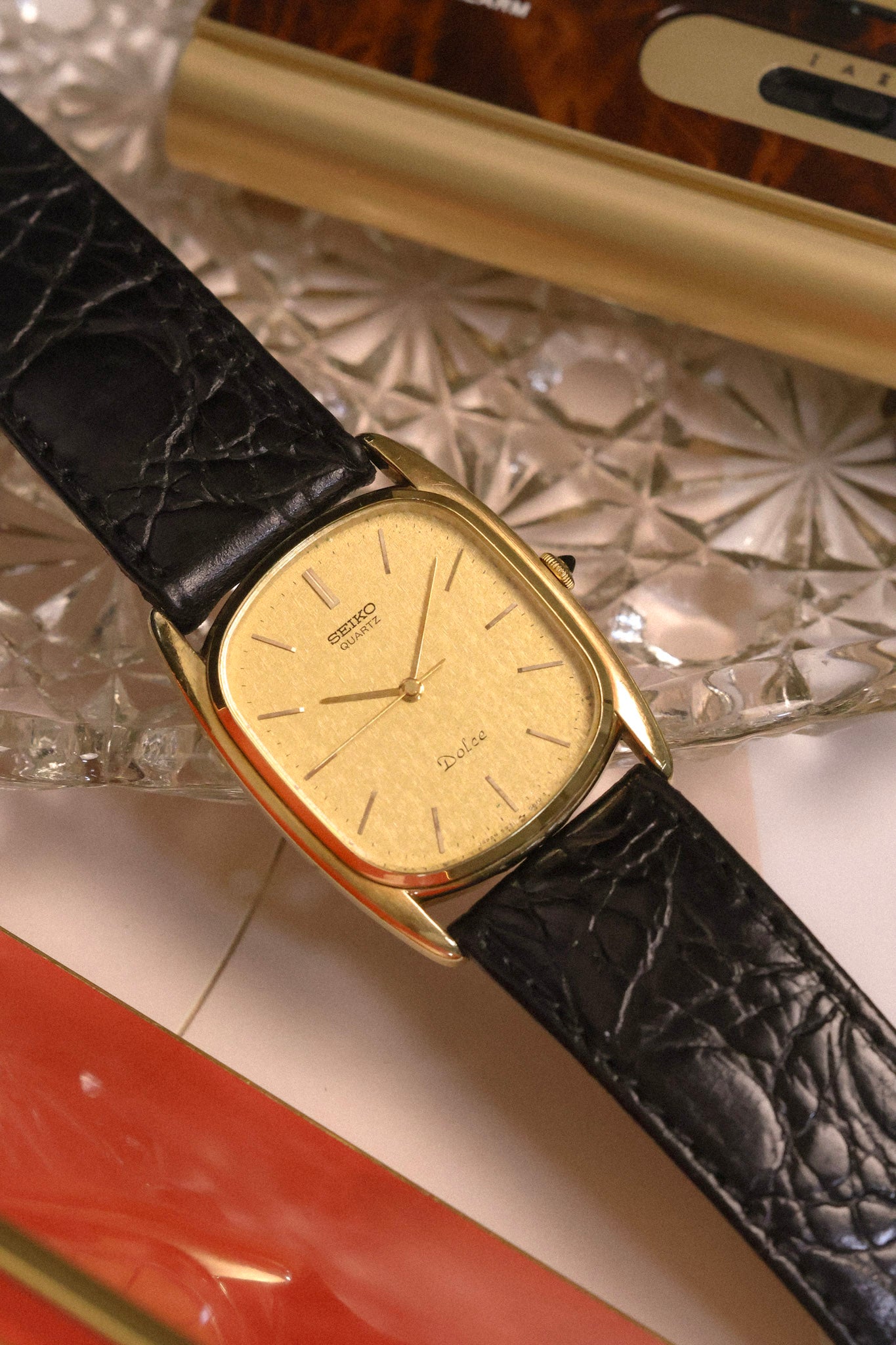 A classic Seiko Dolce with a SGP30 (30 microns) gold plated ellipse case, golden snowflake dial, applied indices, elegant pencil hands, and black cabochon crown. All inspired by high horology design language for a fraction of the price. Comes with a lightly worn aftermarket croc grain black leather strap.