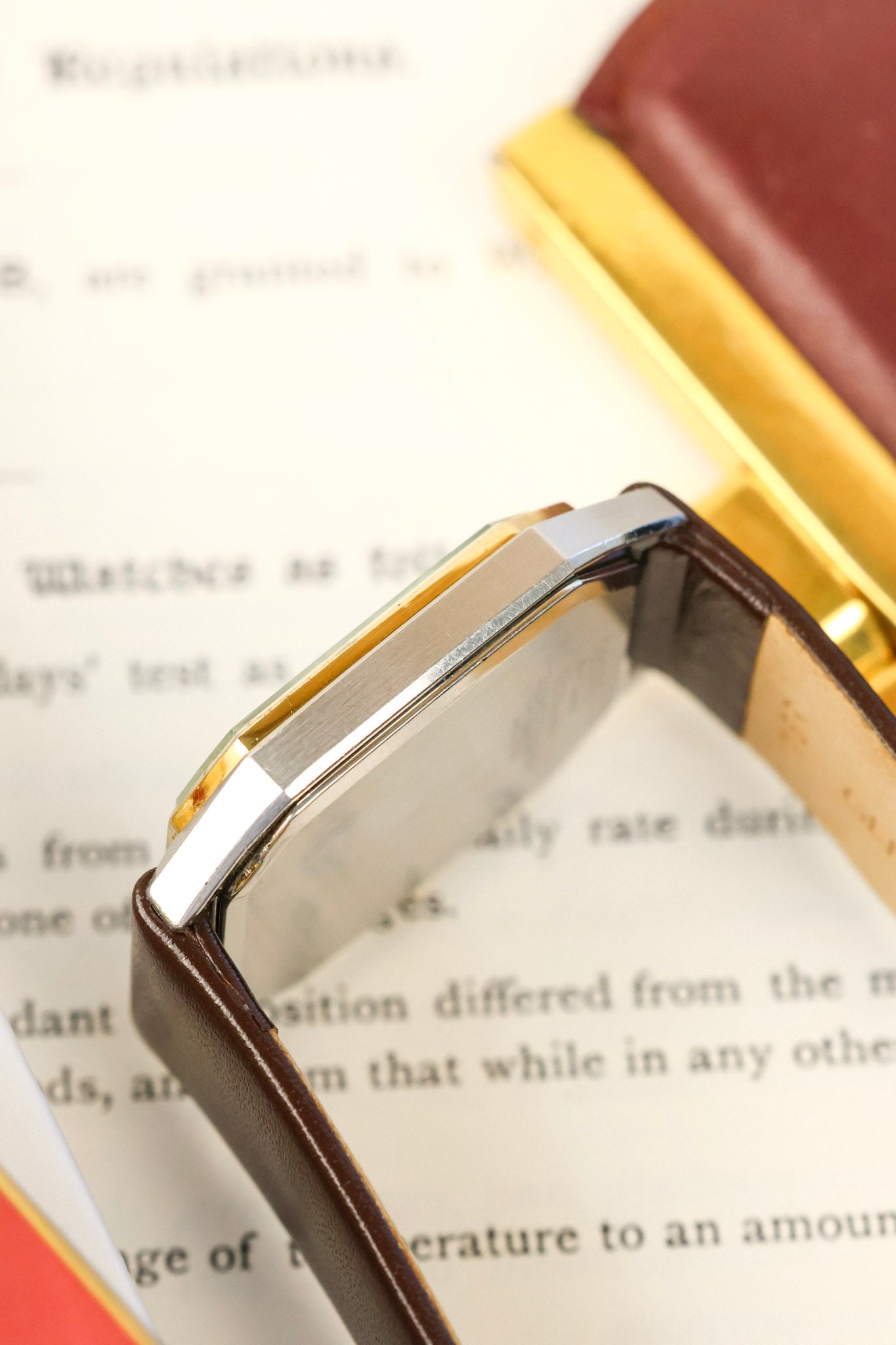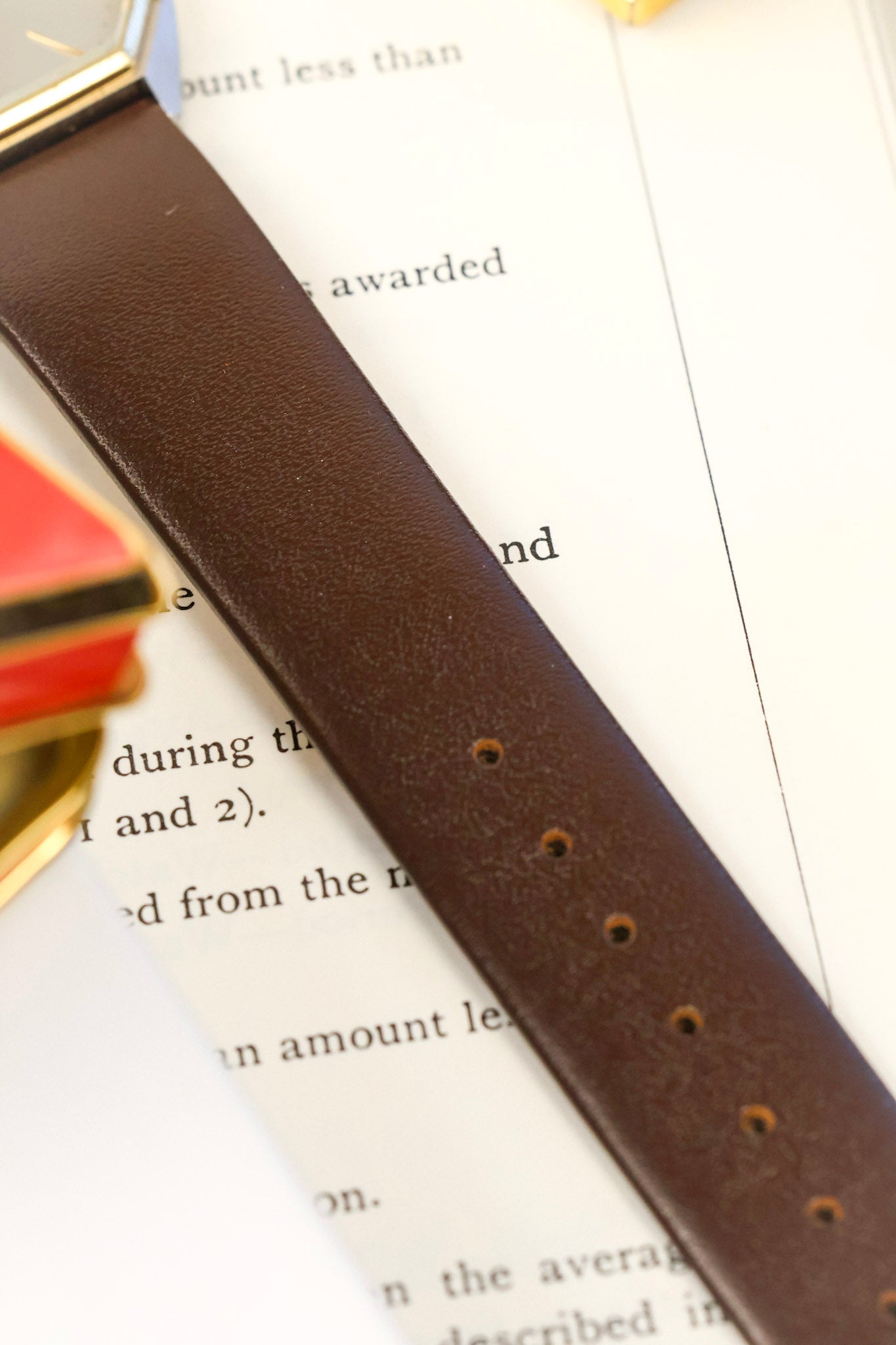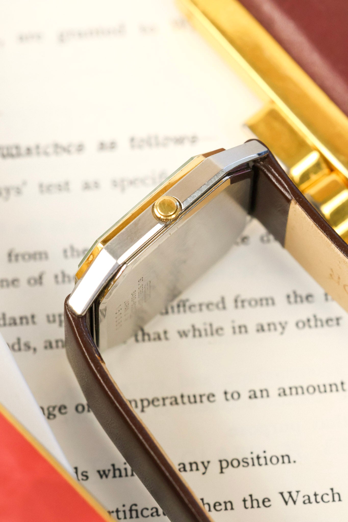 A classically elegant Seiko Octo with a steel case case and gold plated bezel, cool gray dial, elegant pencil hands, and day-date display. Comes with a new Condor smooth brown leather strap.