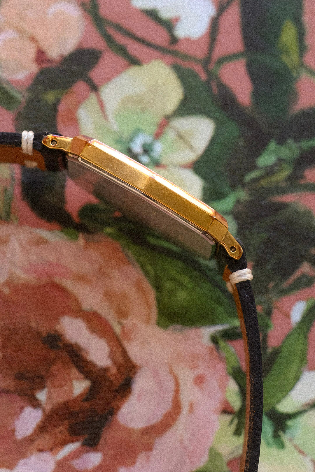 In excellent condition. Light wear for age. The gold plating on the bezel shows beautiful discoloration (this can be polished away upon request). Crystal is clean. Aftermarket strap is like-new and is good for daily use. See photos for details - they are part of the description. Overall a very nice piece that is ready to wear and enjoy.