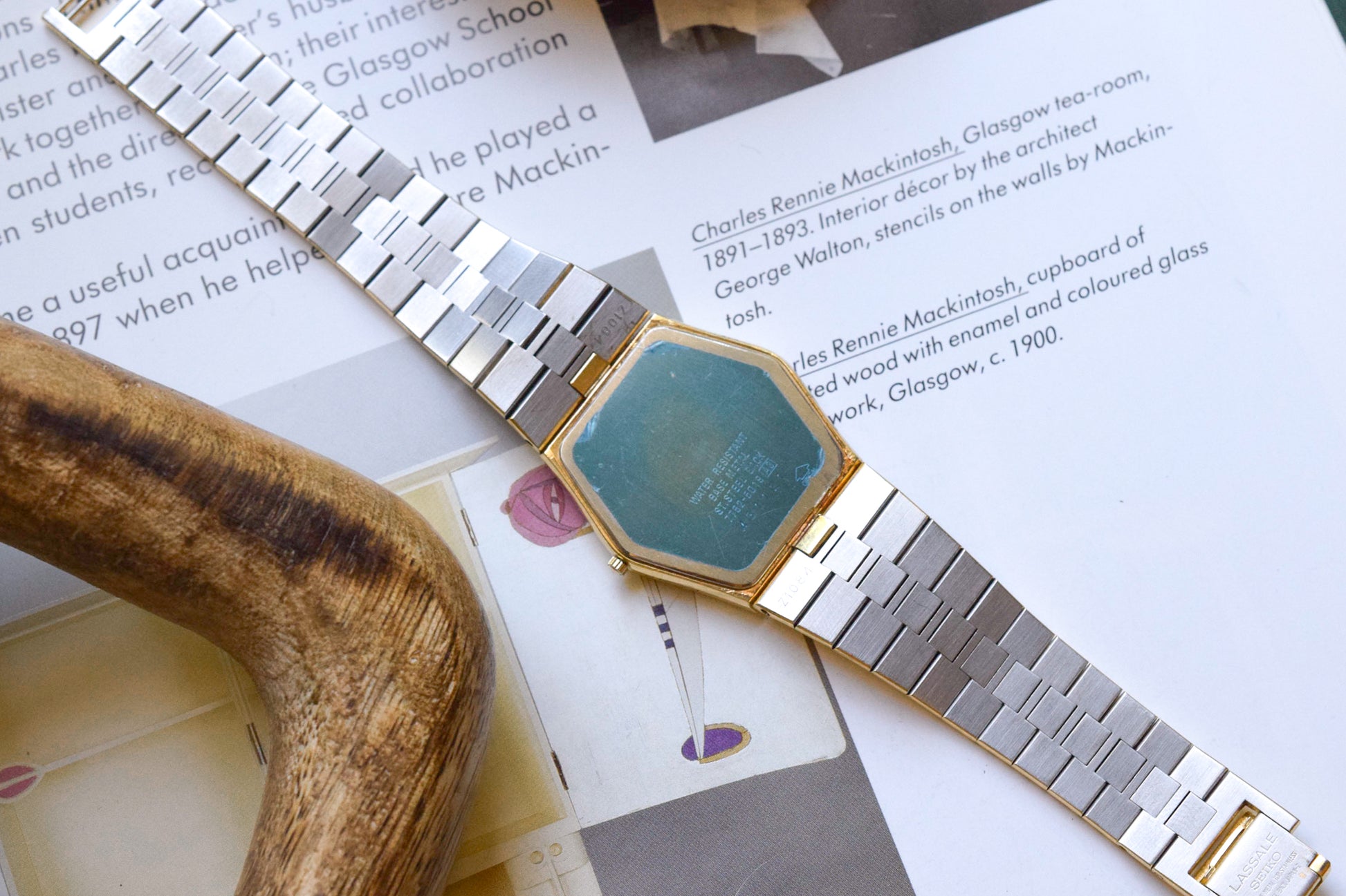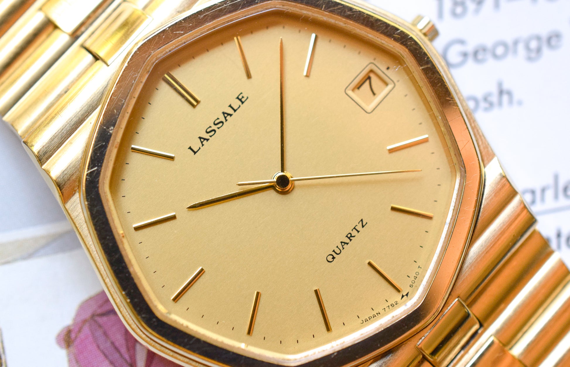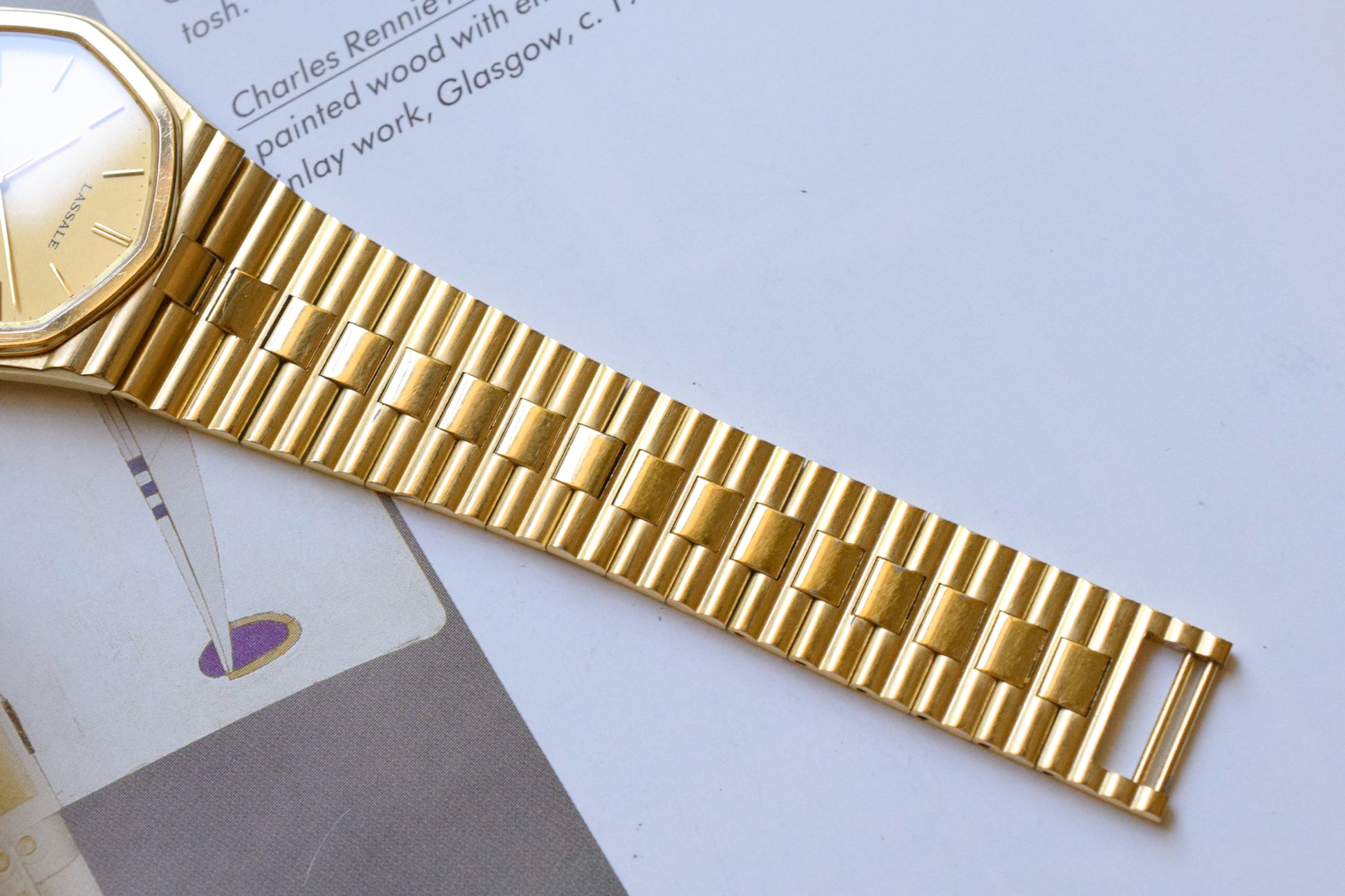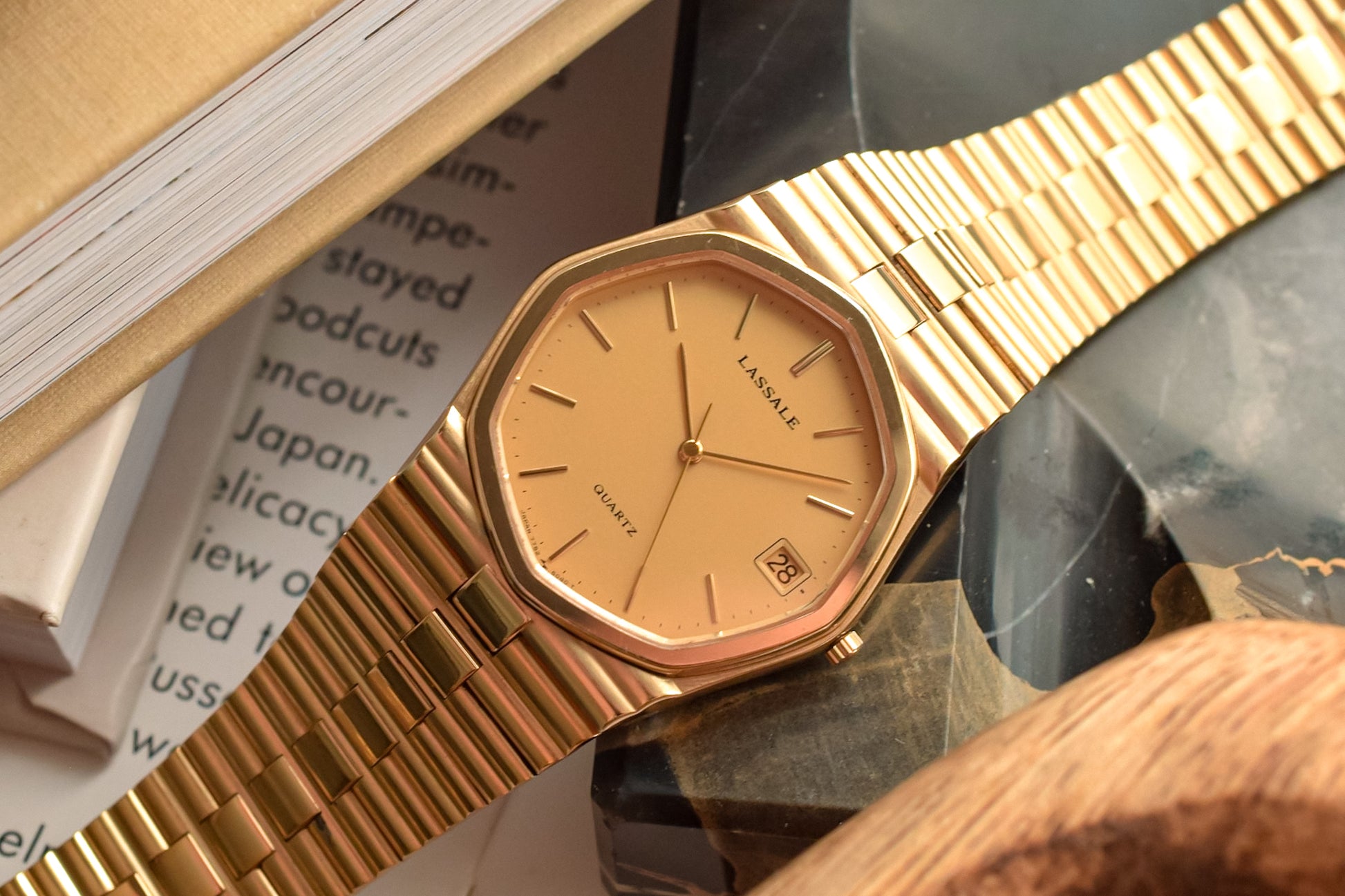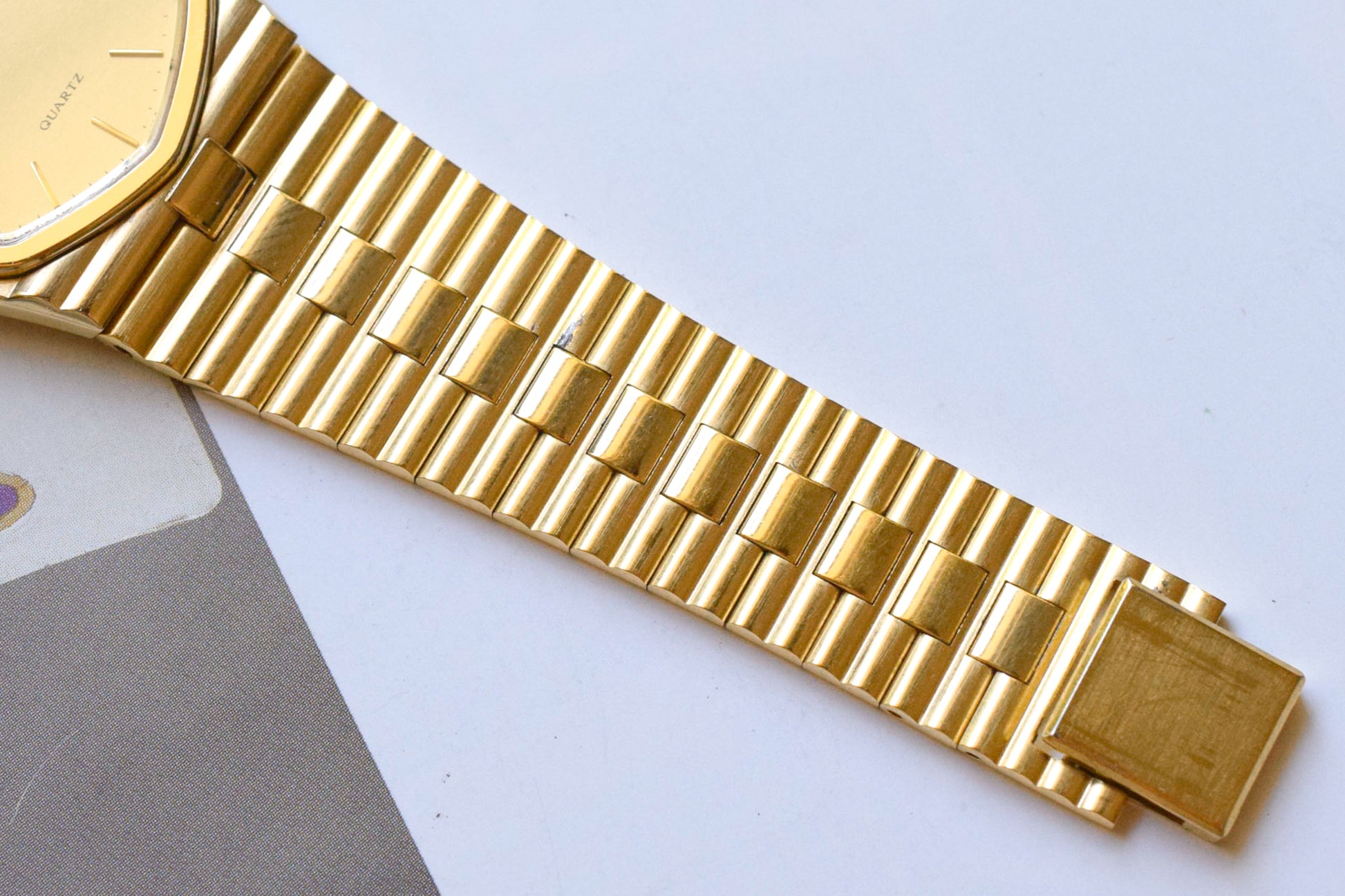 Elegant yet robust gold tone hex shape case with an octo bezel and integrated bracelet. Champagne dial with applied stick indices, matching stick hands, and a date window at 3 o'clock. A great alternative to high horology all-gold pieces in the same spirit, drawing inspiration from the iconic AP Royal Oak.