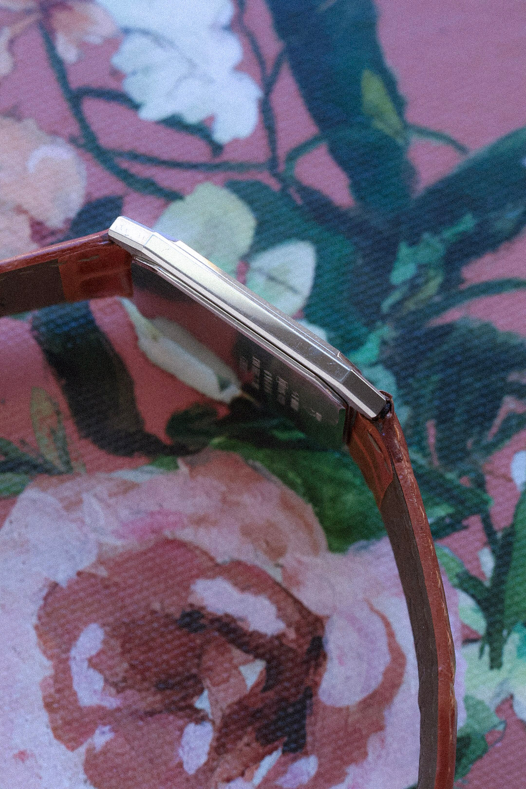 Absolutely stunning Seiko Dolce with a NSA "New Scratchless Allow" Super Hard Alloy octo case that's highly scratch resistant with an elegant silver tone mirror polish, flawless champagne dial, printed indices with a singular applied index at 12, sharp dauphine hands, and original cabochon crown. Comes with a new aftermarket croc grain cognac leather strap.
