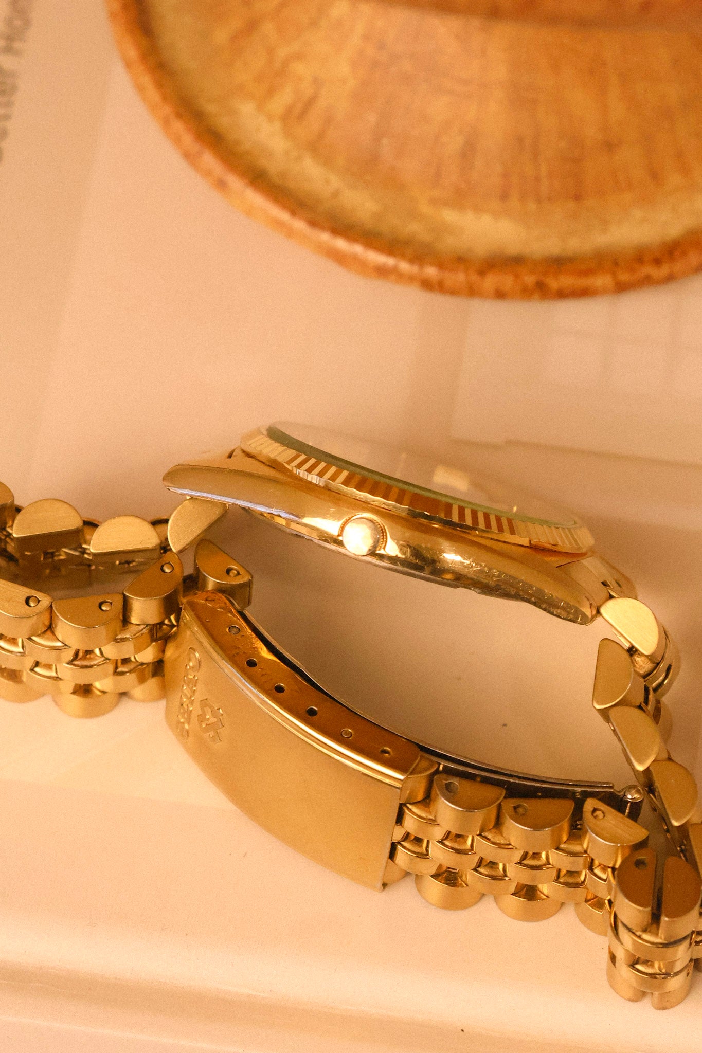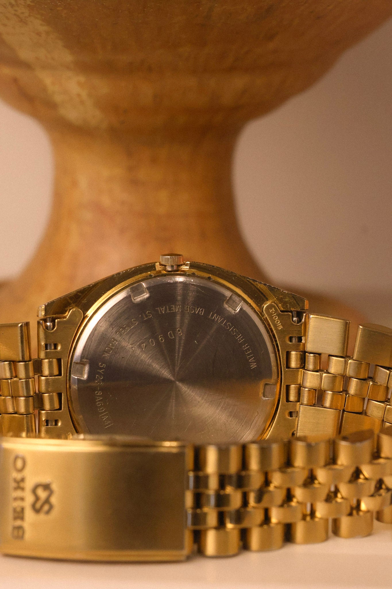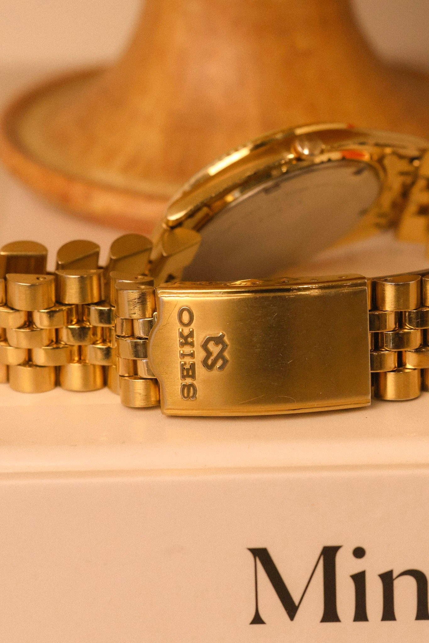 A true classic drawing inspiration from the Rolex Day-Date "President" and the iconic "Datejust." From the sizing, styling, fluted bezel, and "Jubilee" style bracelet - it's hard to deny that this is the definitive budget Day-Date from a beloved brand with a rich horological history. Featuring a gold tone case and fluted bezel, black dial , applied baton indices with accompanying lume pips, lumed baton hands, day-date display with arched days of week at 12 o'clock, and original Seiko gold tone "Jubilee" style bracelet.