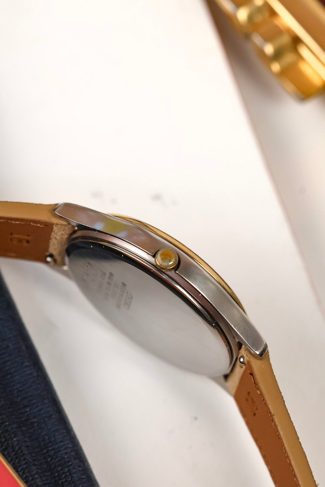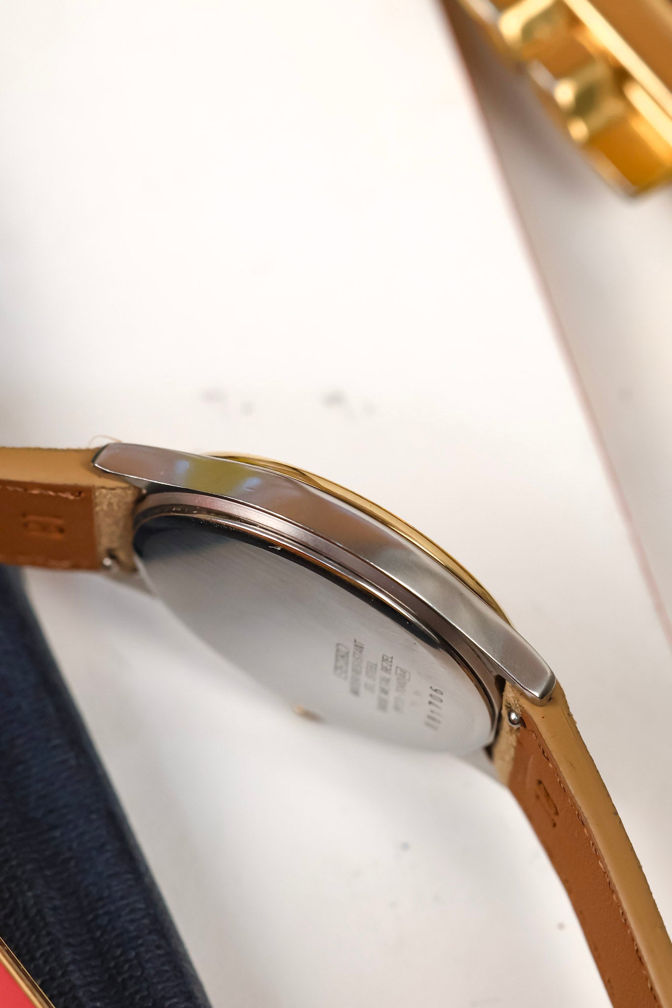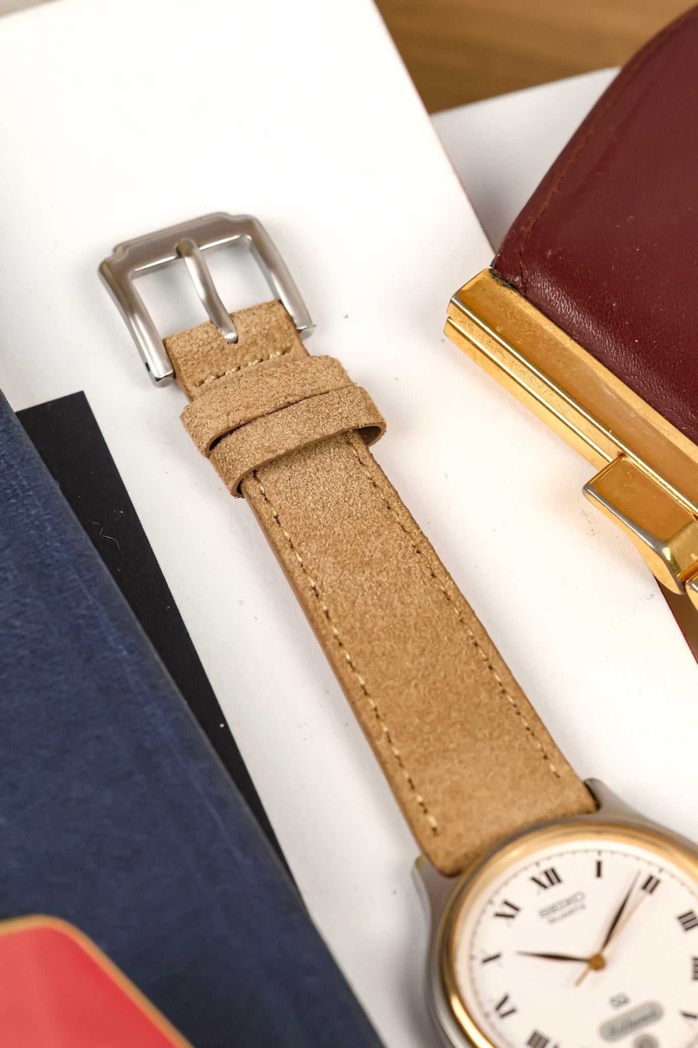 Absolutely stunning and rare two toned Seiko, white Roman dial, outer minute track, elegant leaf hands, and independent day and date display with the most beautiful script typography we've ever seen. Comes with a new aftermarket suede beige leather strap.