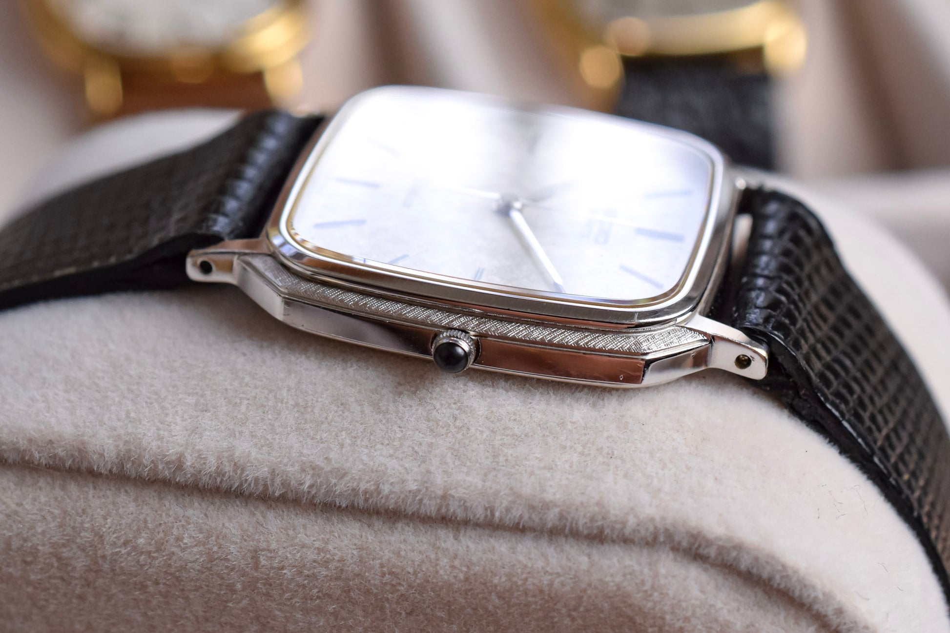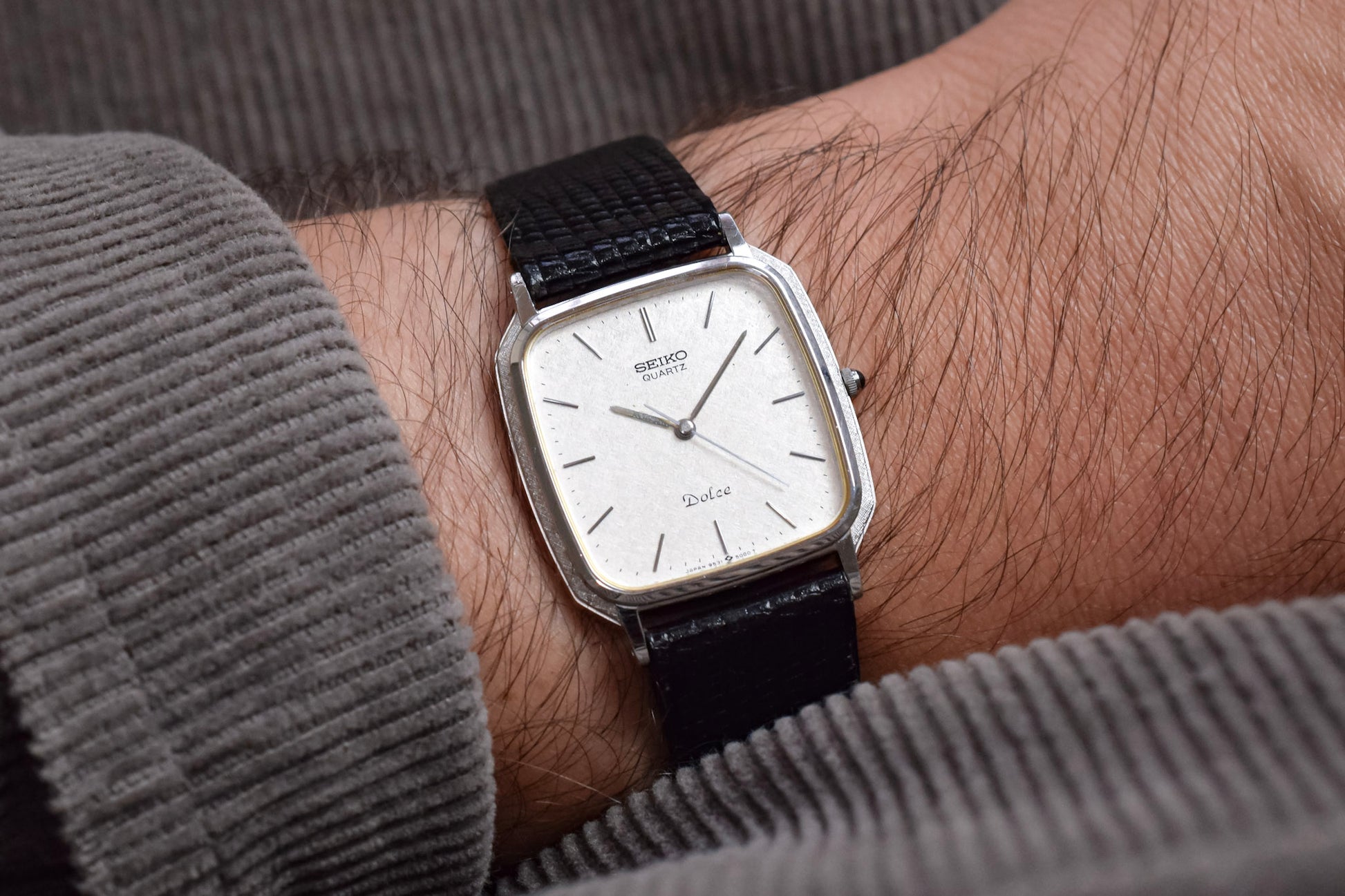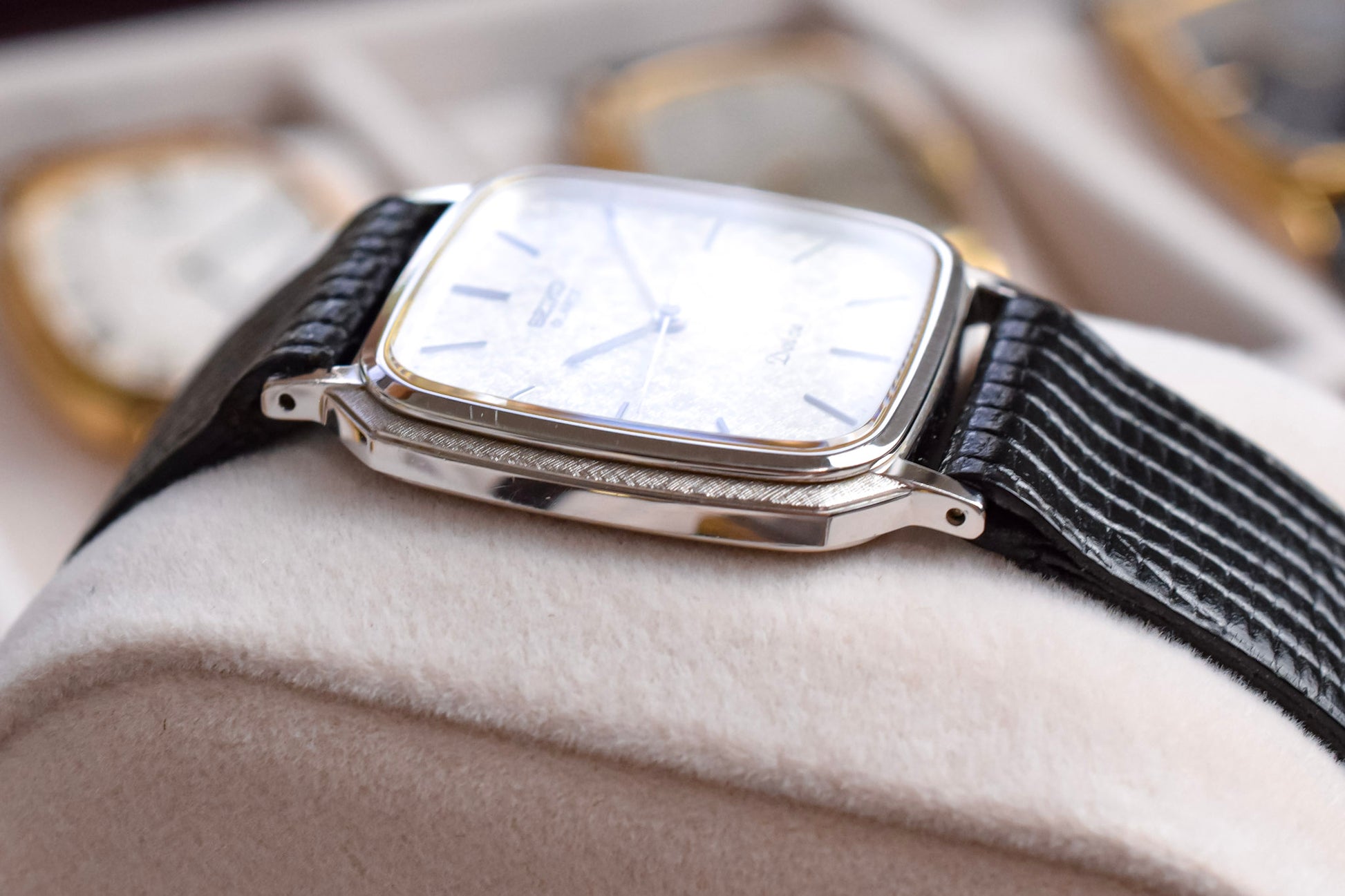 Absolutely stunning and uncommon Seiko Dolce with a silver tone octo/tv shaped case with ornate cross hatch pattern sides, silver snowflake dial, applied indices, thin plongeur style handset, and black cabochon crown. Comes with a lightly pre-loved lizard grain black leather strap.