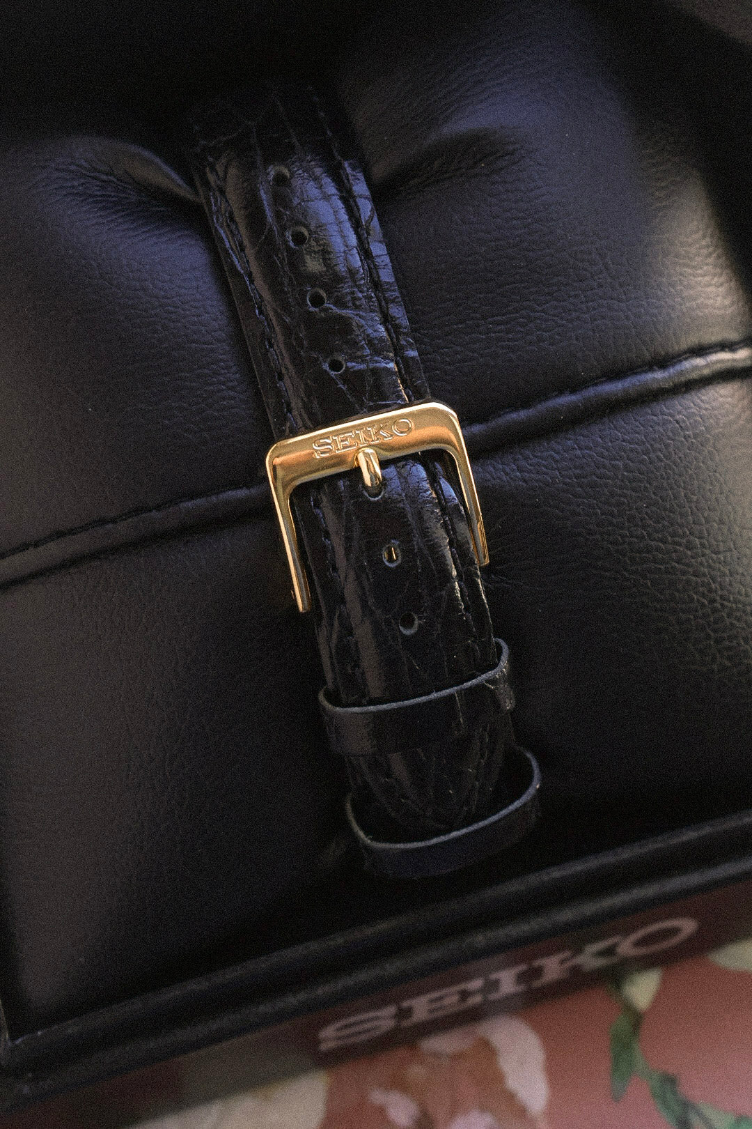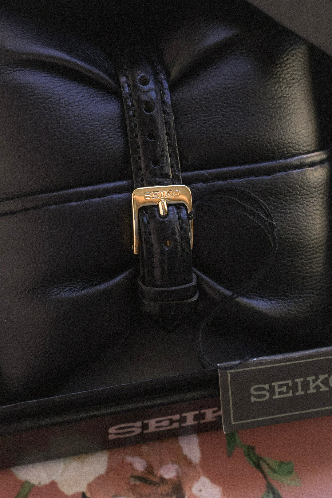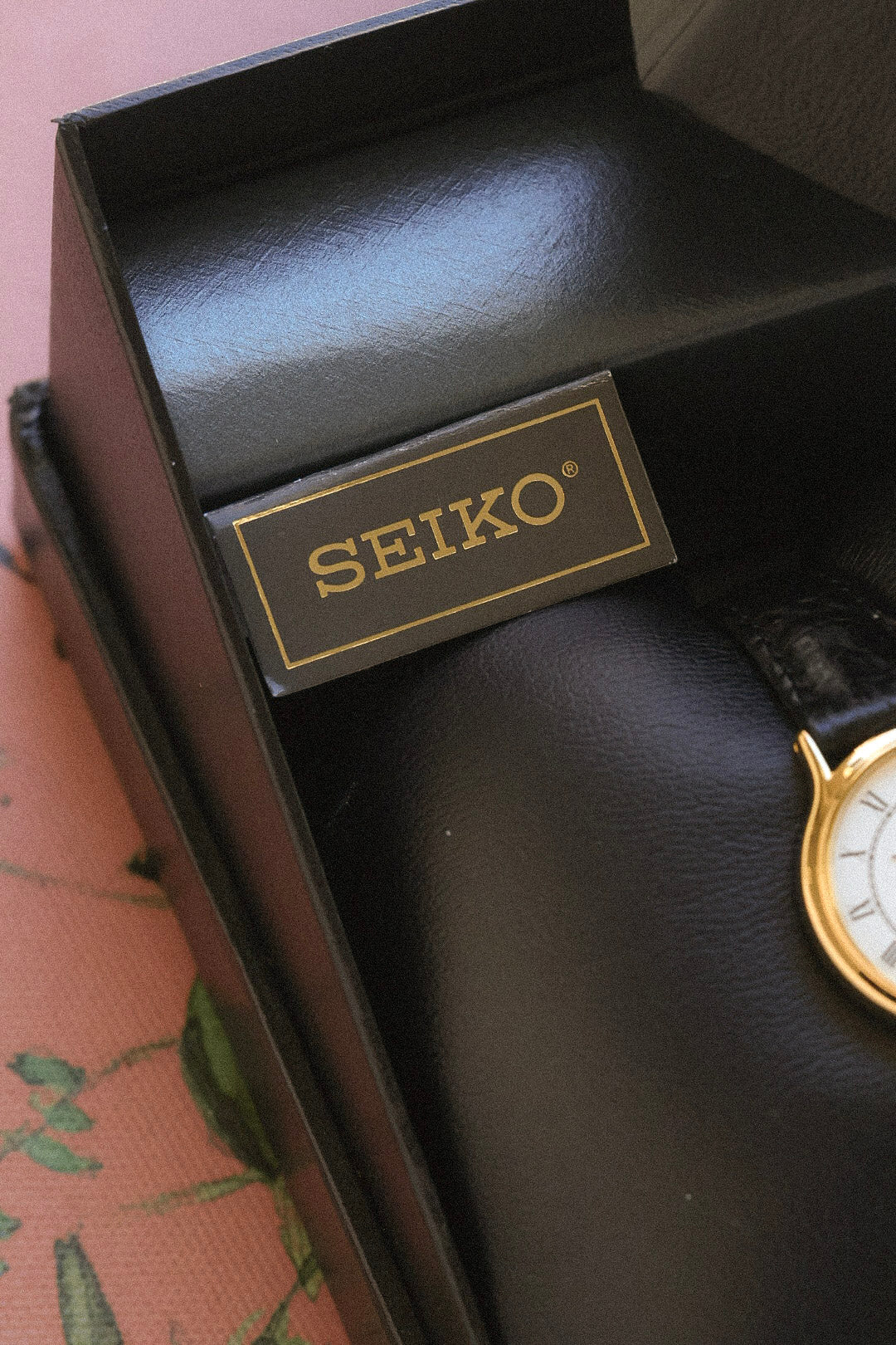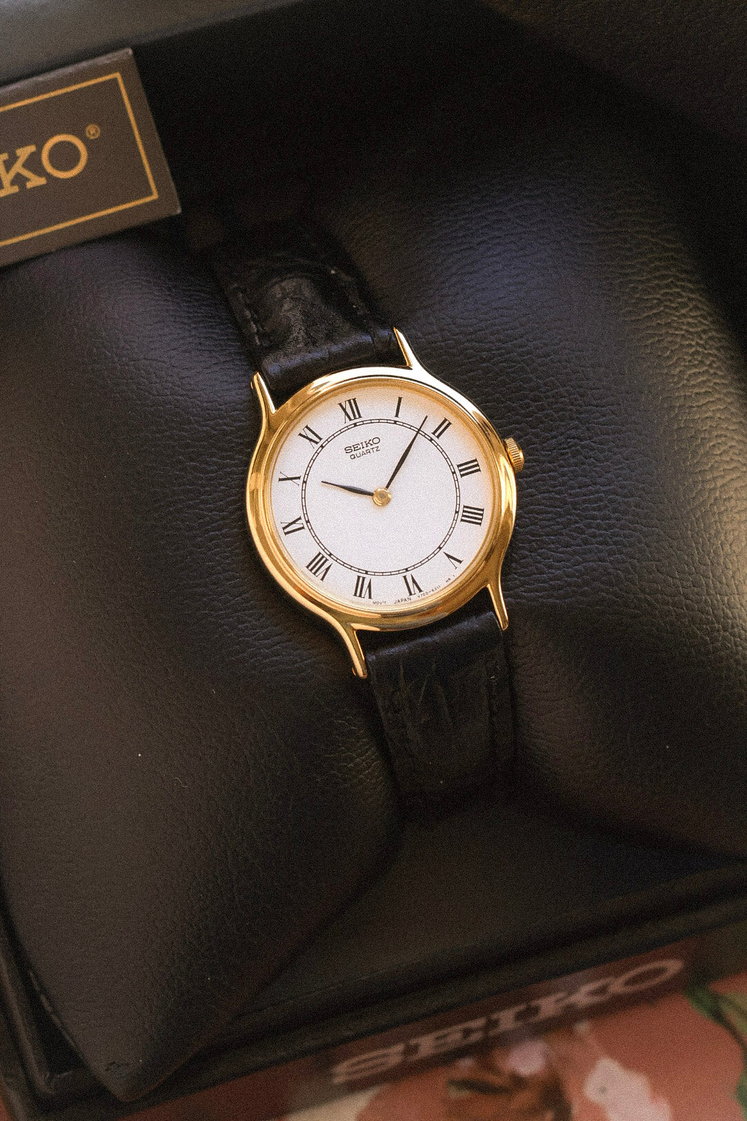 Absolutely stunning New Old Stock Seiko Pair Watch Set. Featuring gold tone case, thick lugs, white sector dial with printed Roman numerals, elegant leaf hands, and original crown. Comes with original Seiko leather strap and signed buckle, original retail box and booklet.