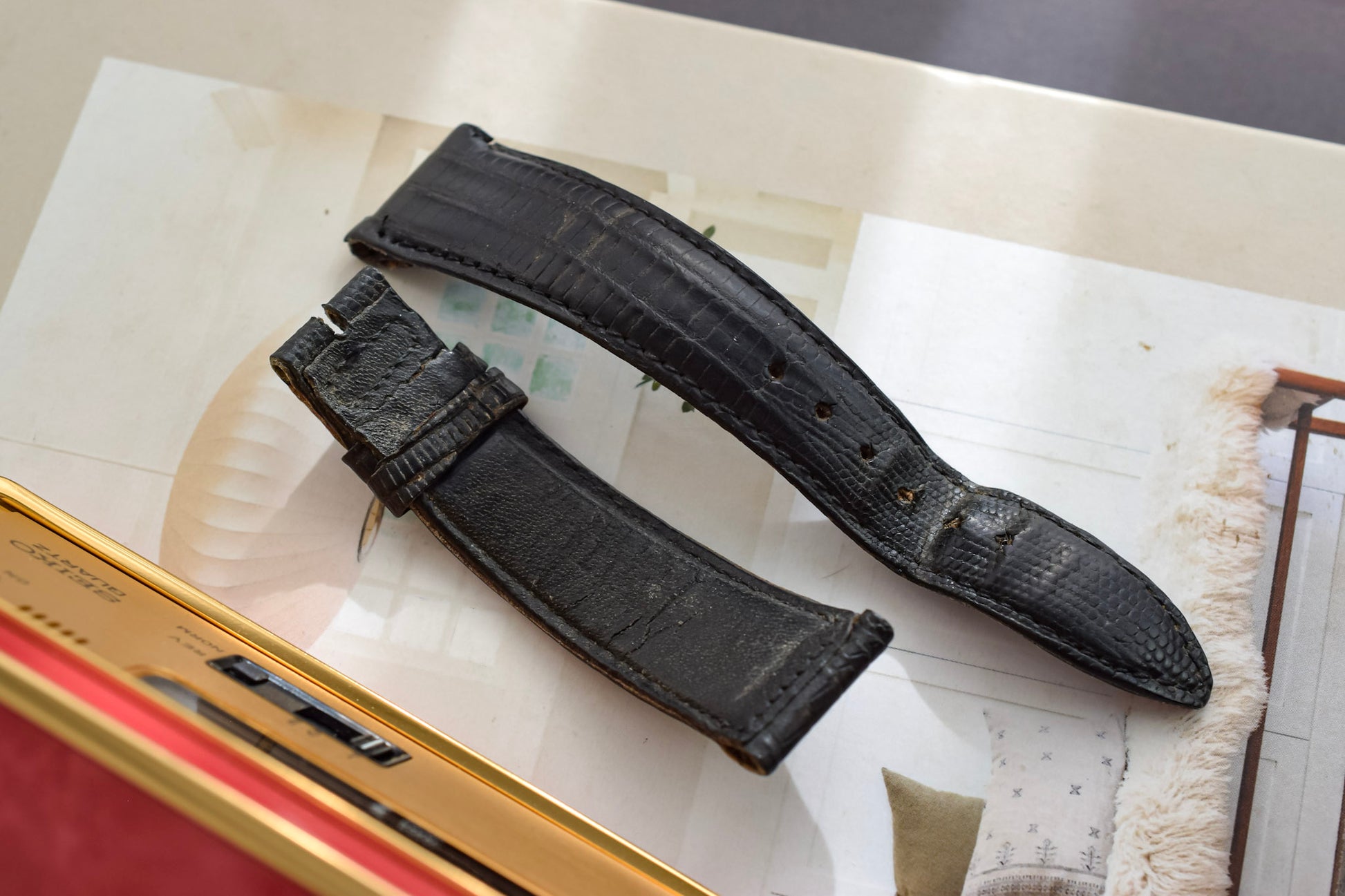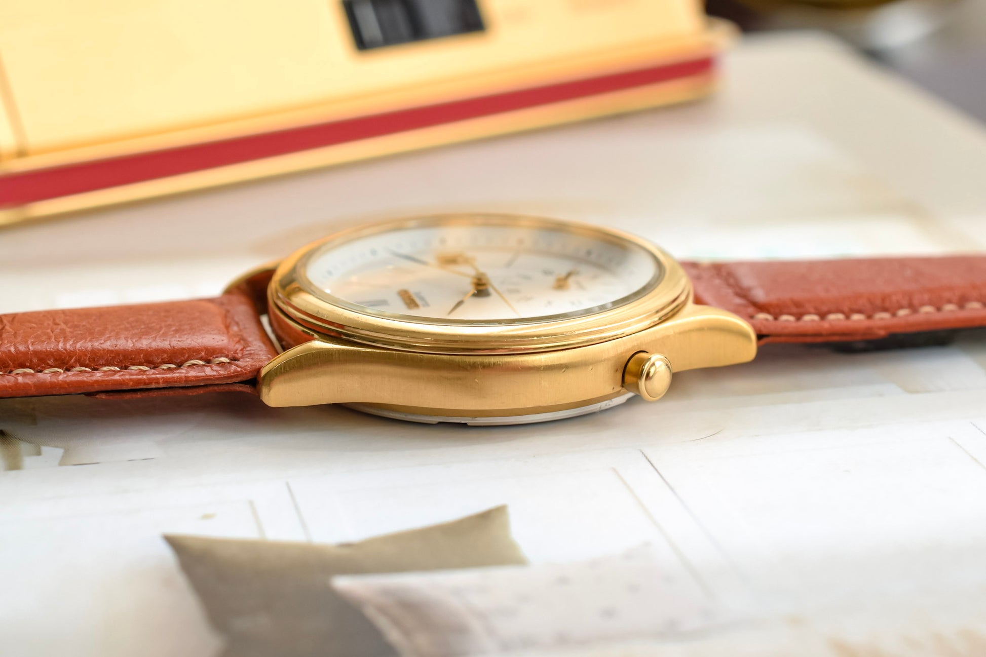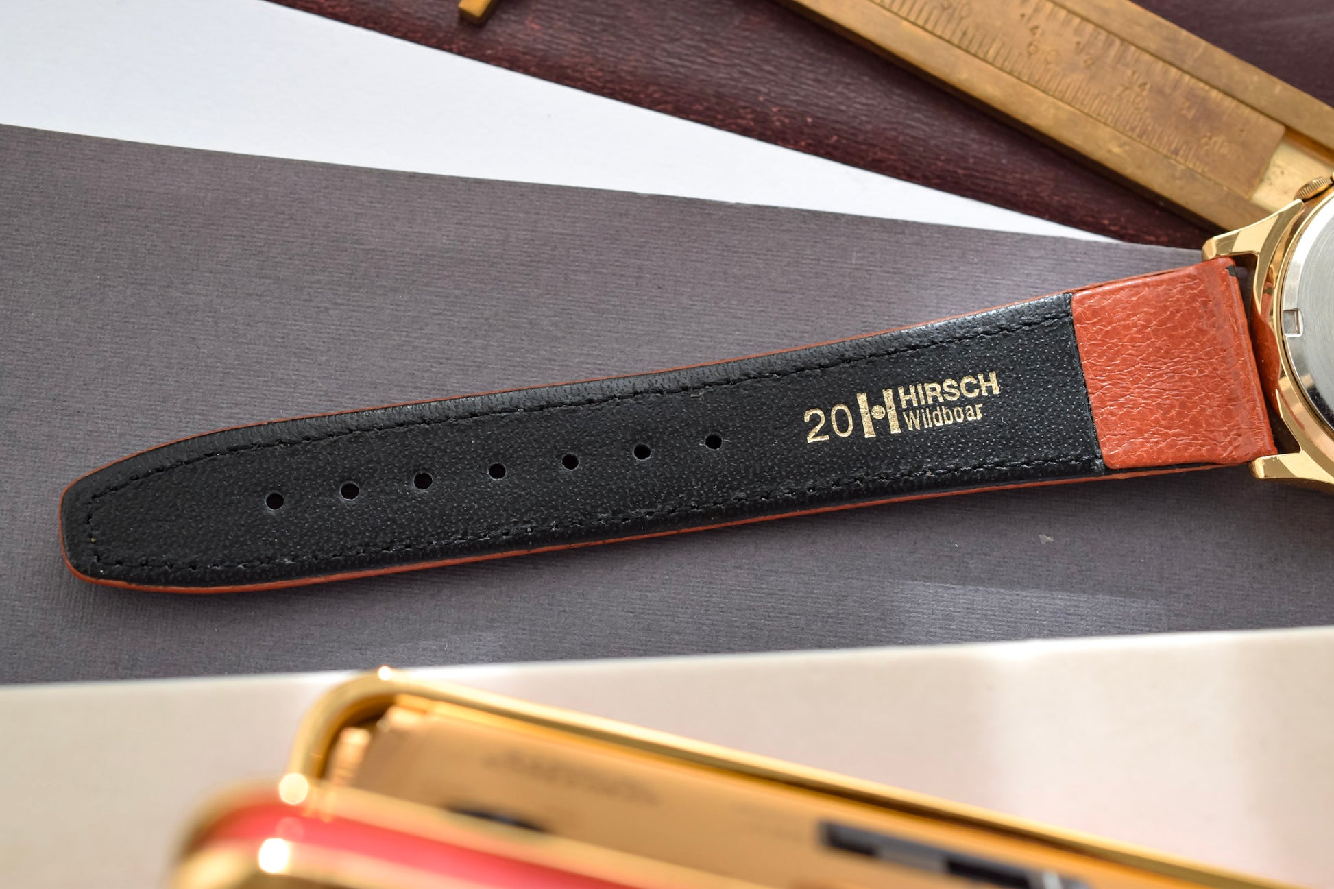 Embrace the timeless elegance of this classic Seiko, showcasing a gold tone case, white Roman dial with working alarm subdial, elegant black tip hands, and date window. Comes with a new old stock Hirsch Havana brown leather strap and original Seiko buckle. The original Seiko strap will also be included, but it has been well-worn and not fit for use.