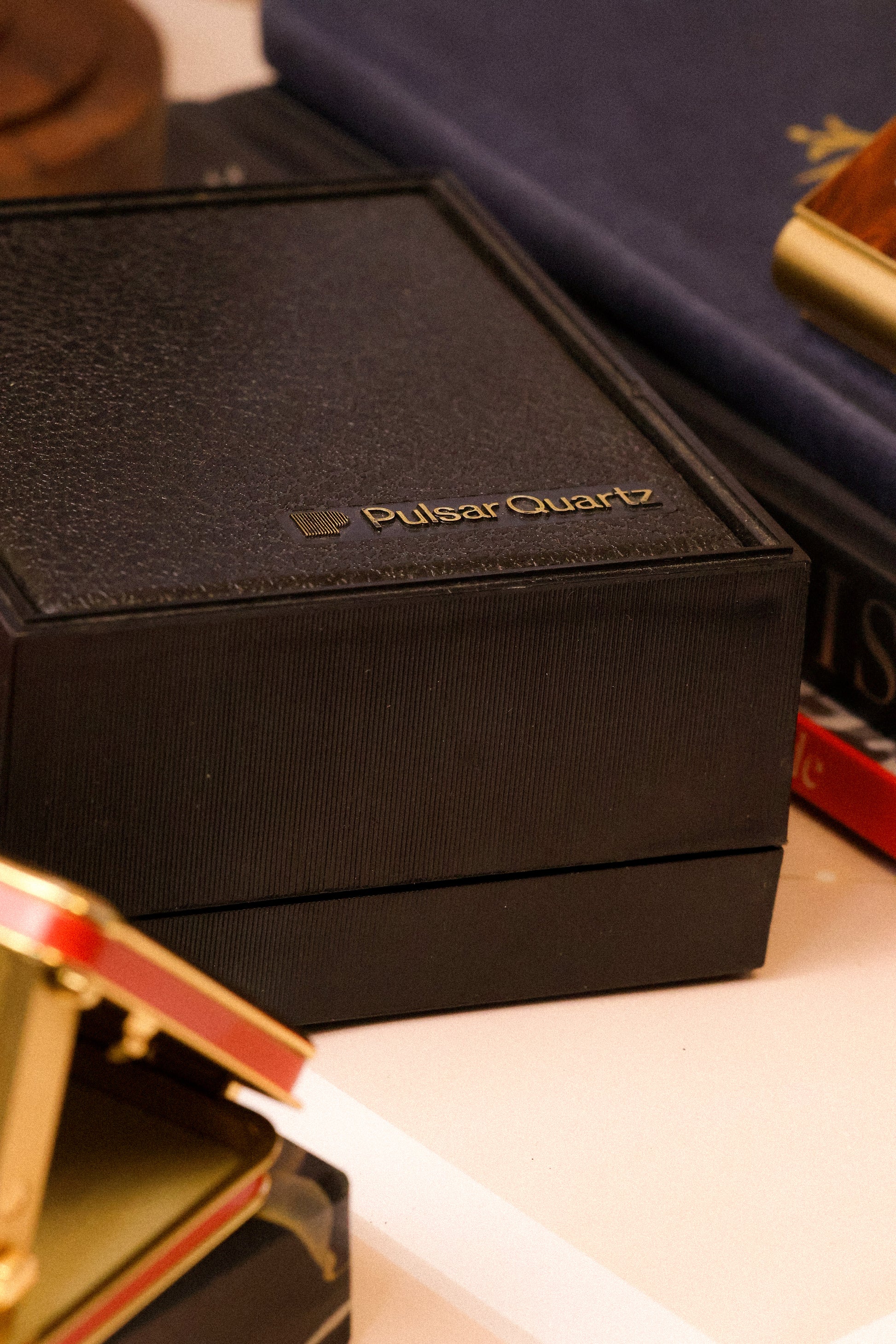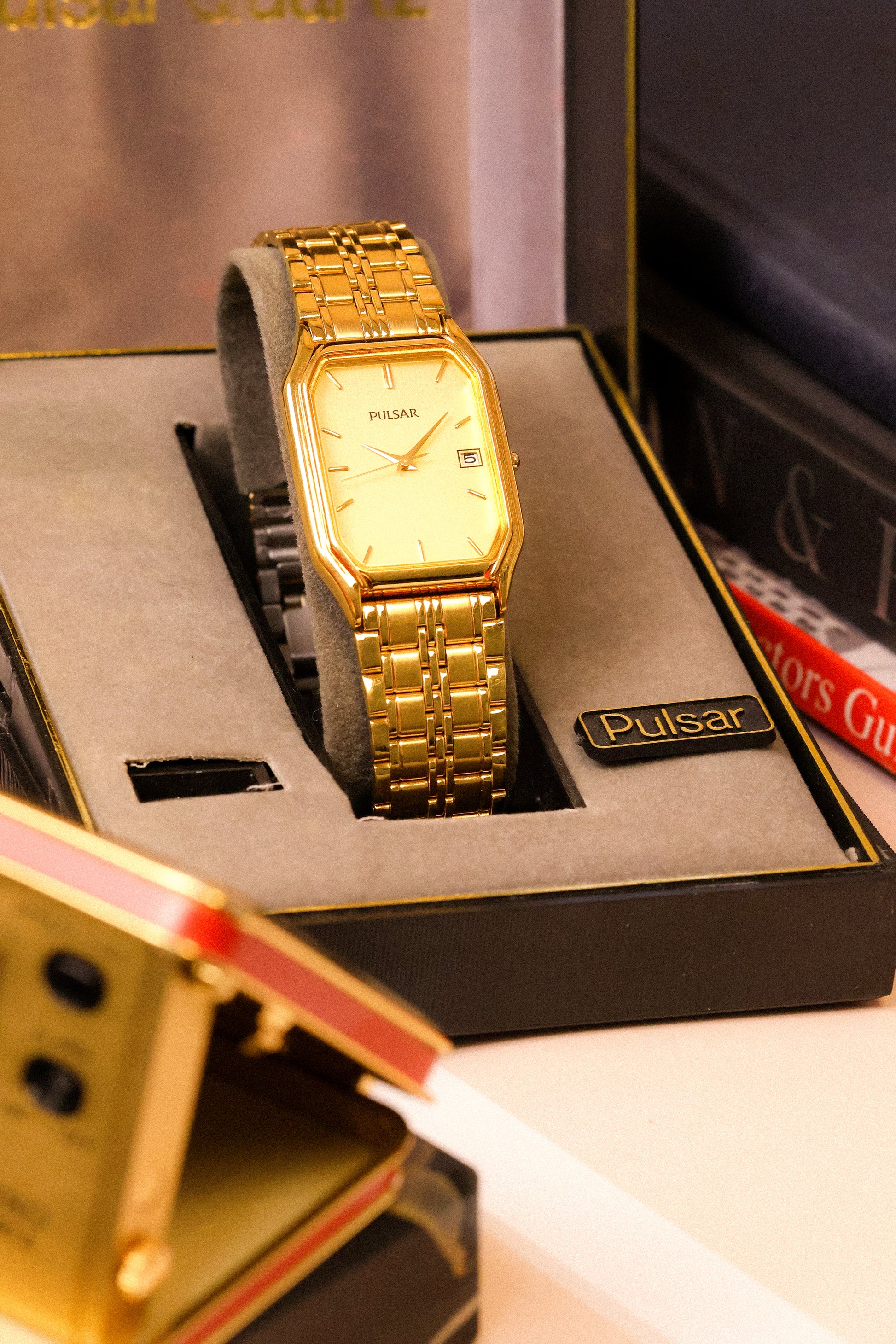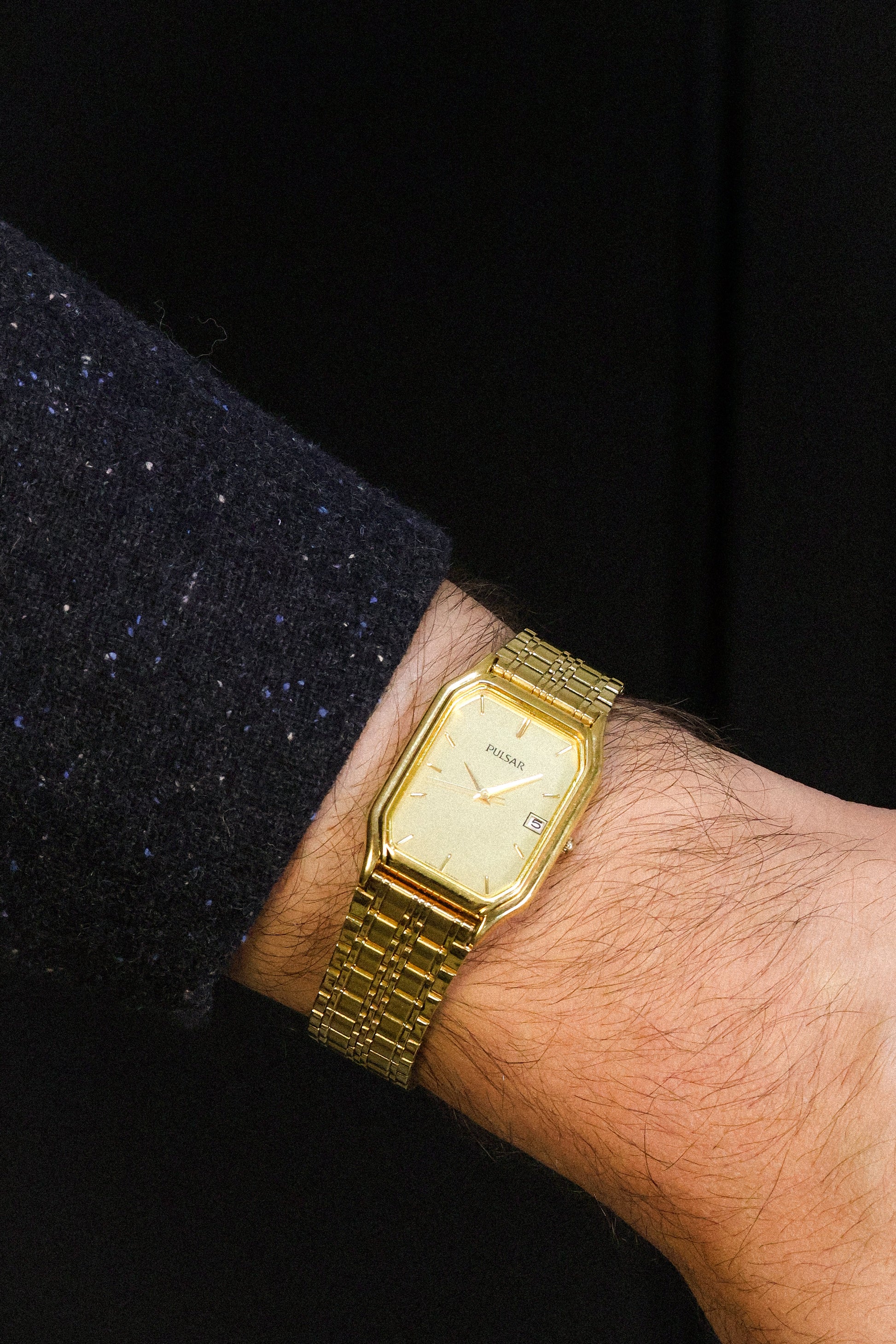 Inspired by the classic high horology gold pieces from the 80s. Featuring a gold tone octo case, golden dial, applied indices, sharp dagger hands, date display, and original crown. This piece is in new old stock condition and comes with original unworn Pulsar gold tone bracelet and retail box.