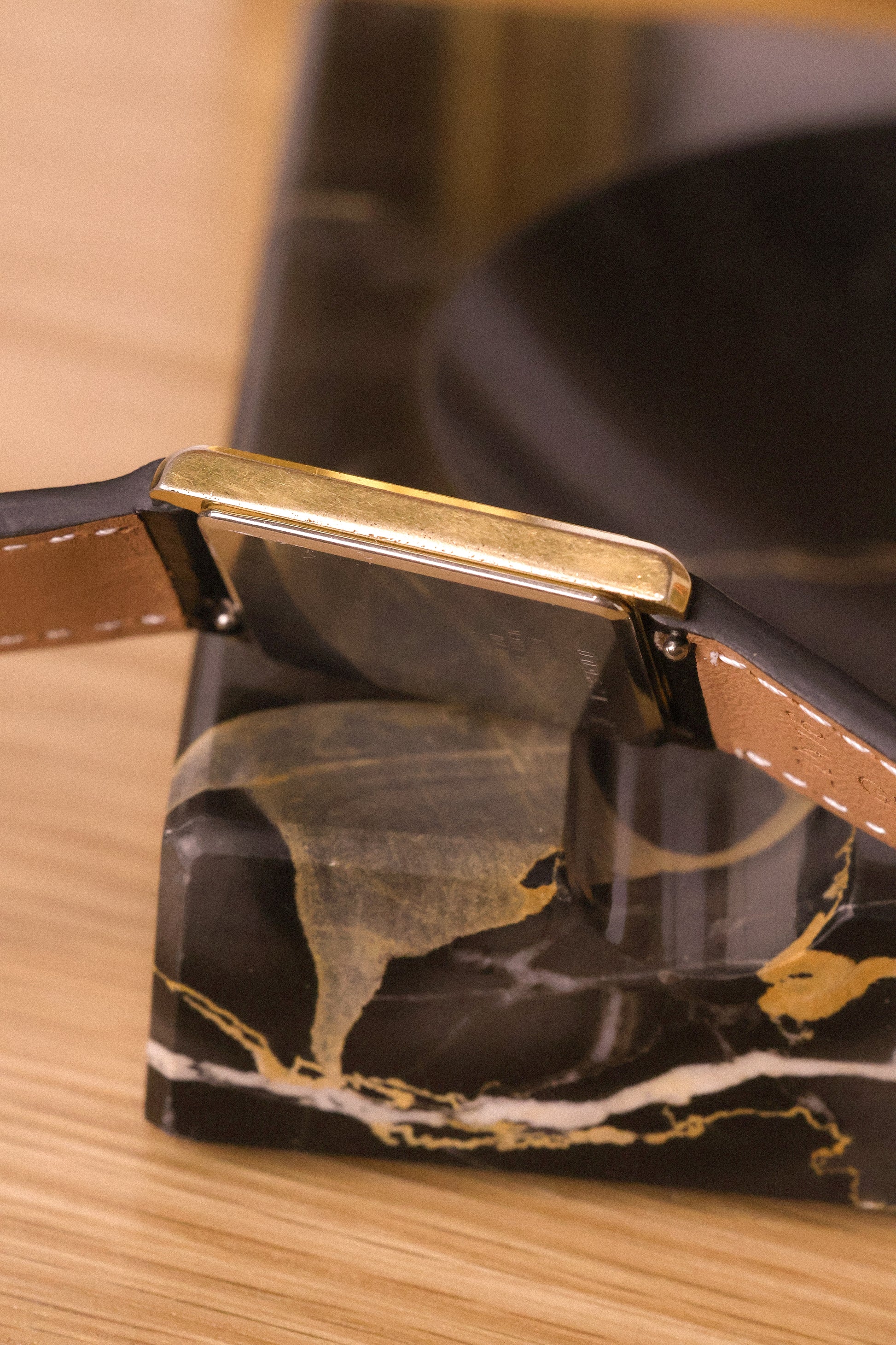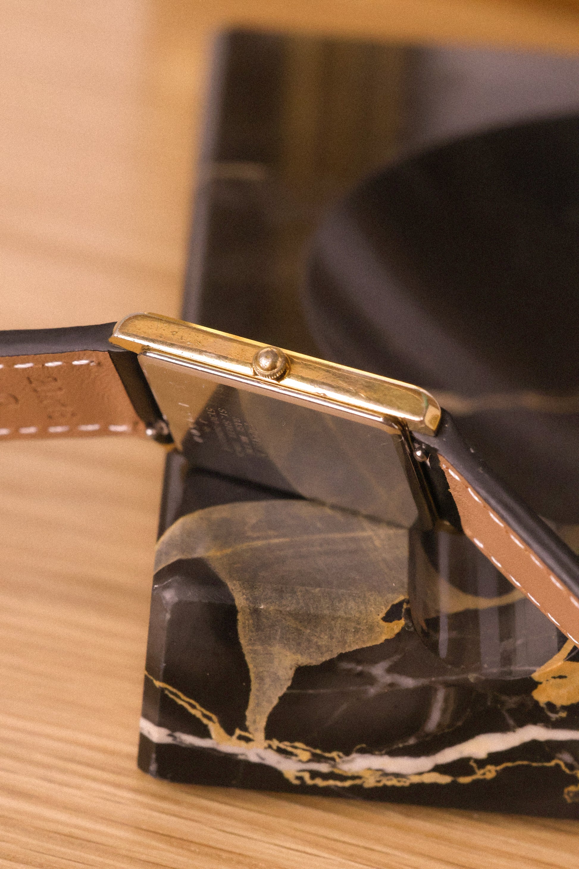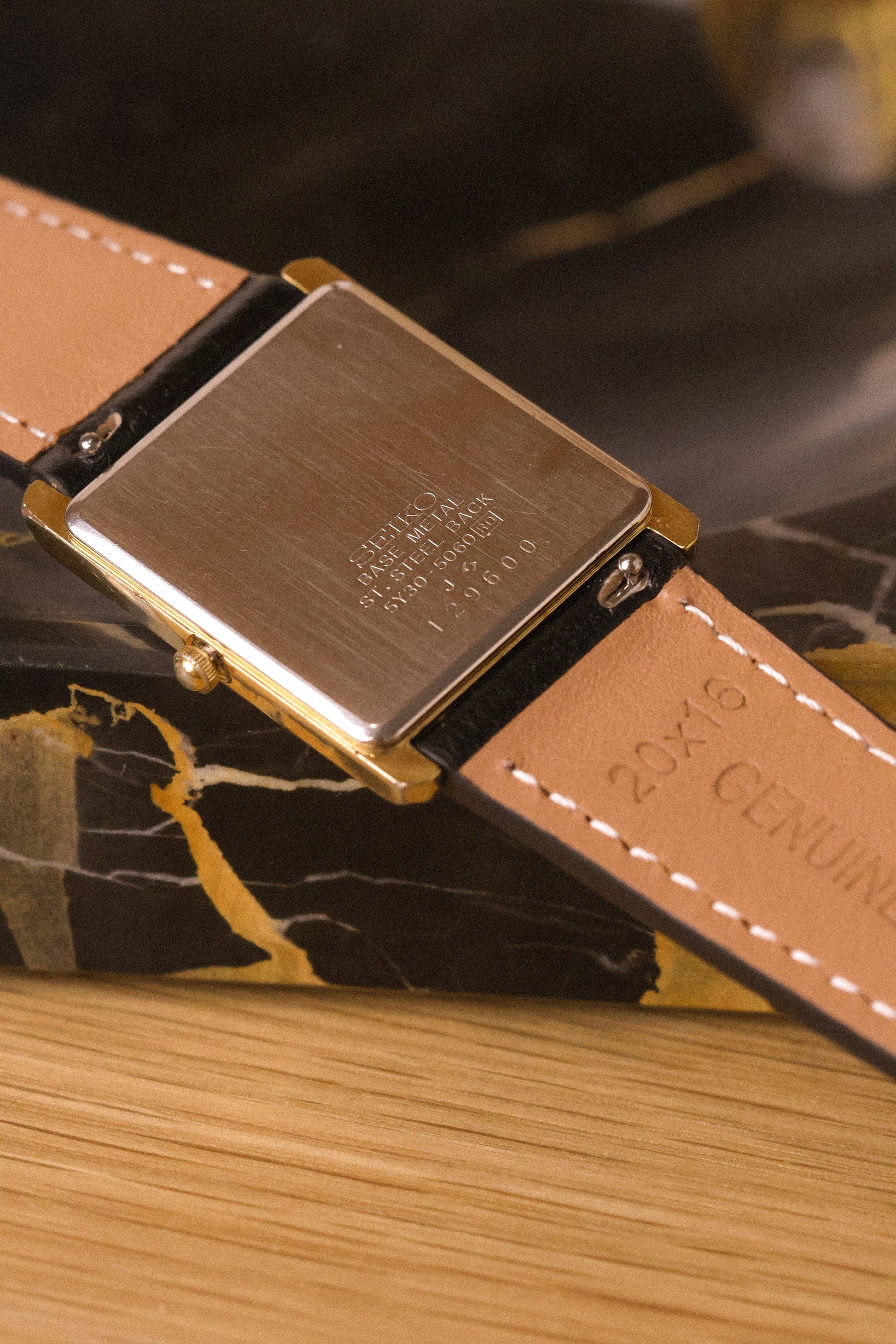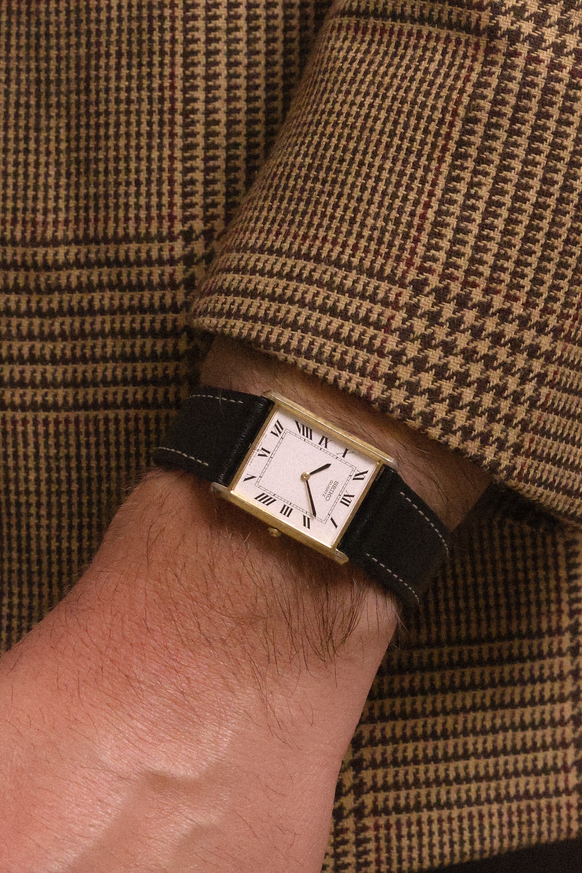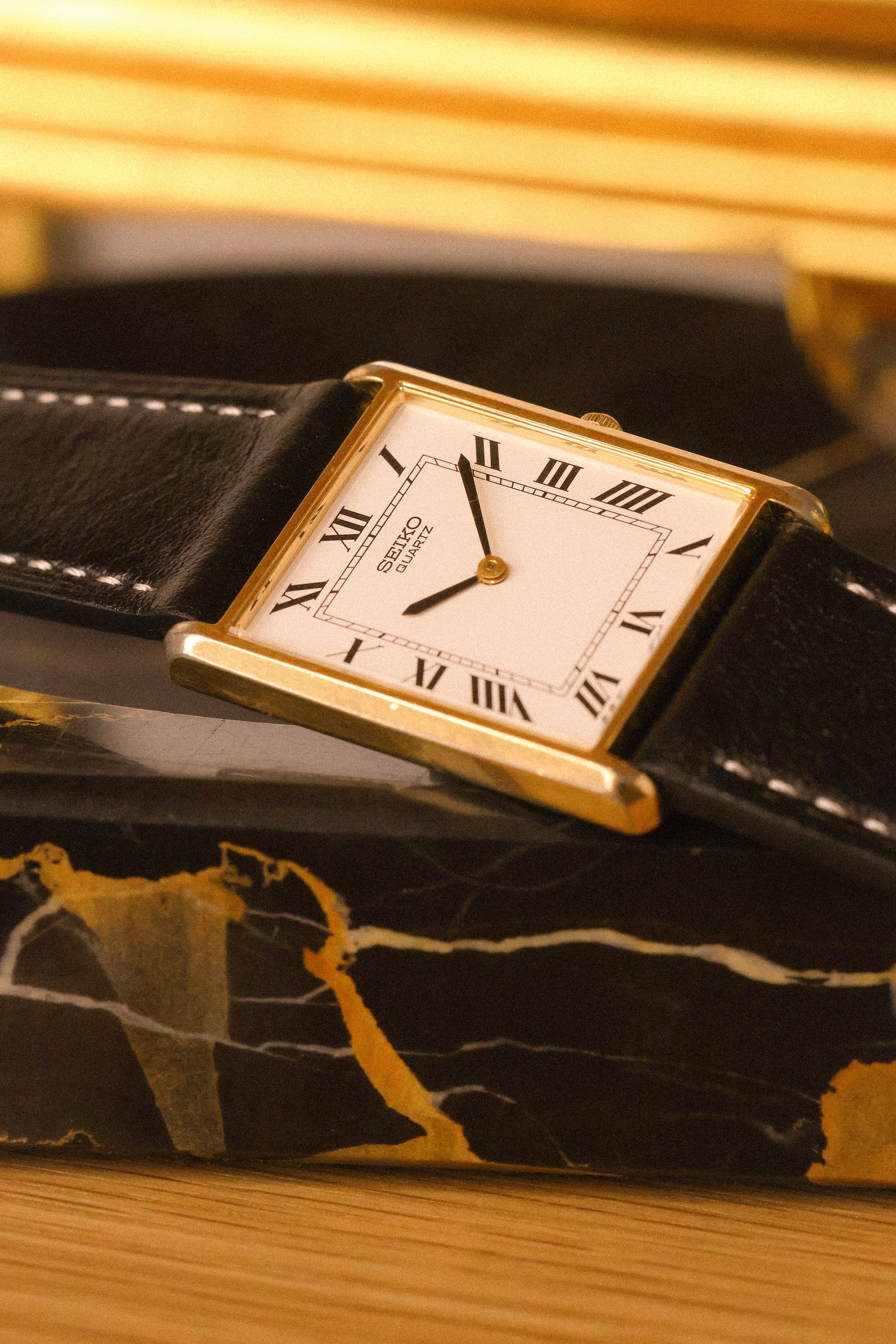 A classic Seiko Tank with a clean white roman dial, gold tone tank style case, sword hands, original crown, and new aftermarket stitched black leather strap. All inspired by the classic Cartier Tank design language for a fraction of the price.