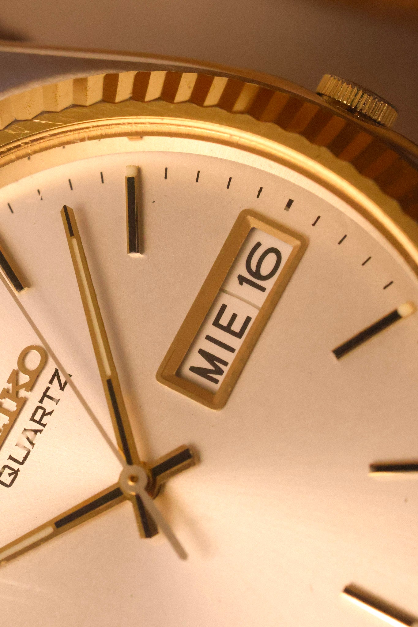 A true classic drawing inspiration from the Rolex Day-Date "President" and the iconic "Datejust." From the sizing, styling, fluted bezel, and 5 link "Jubilee" style bracelet - it's hard to deny that this is the definitive budget Day-Date from a beloved brand with a rich horological history. Featuring a stainless steel case, gold tone fluted bezel, sunray silver dial, applied baton indices with accompanying lume pips, lumed baton hands, day-date display, and original Seiko two toned 5 link bracelet. Features English and Spanish days of week.