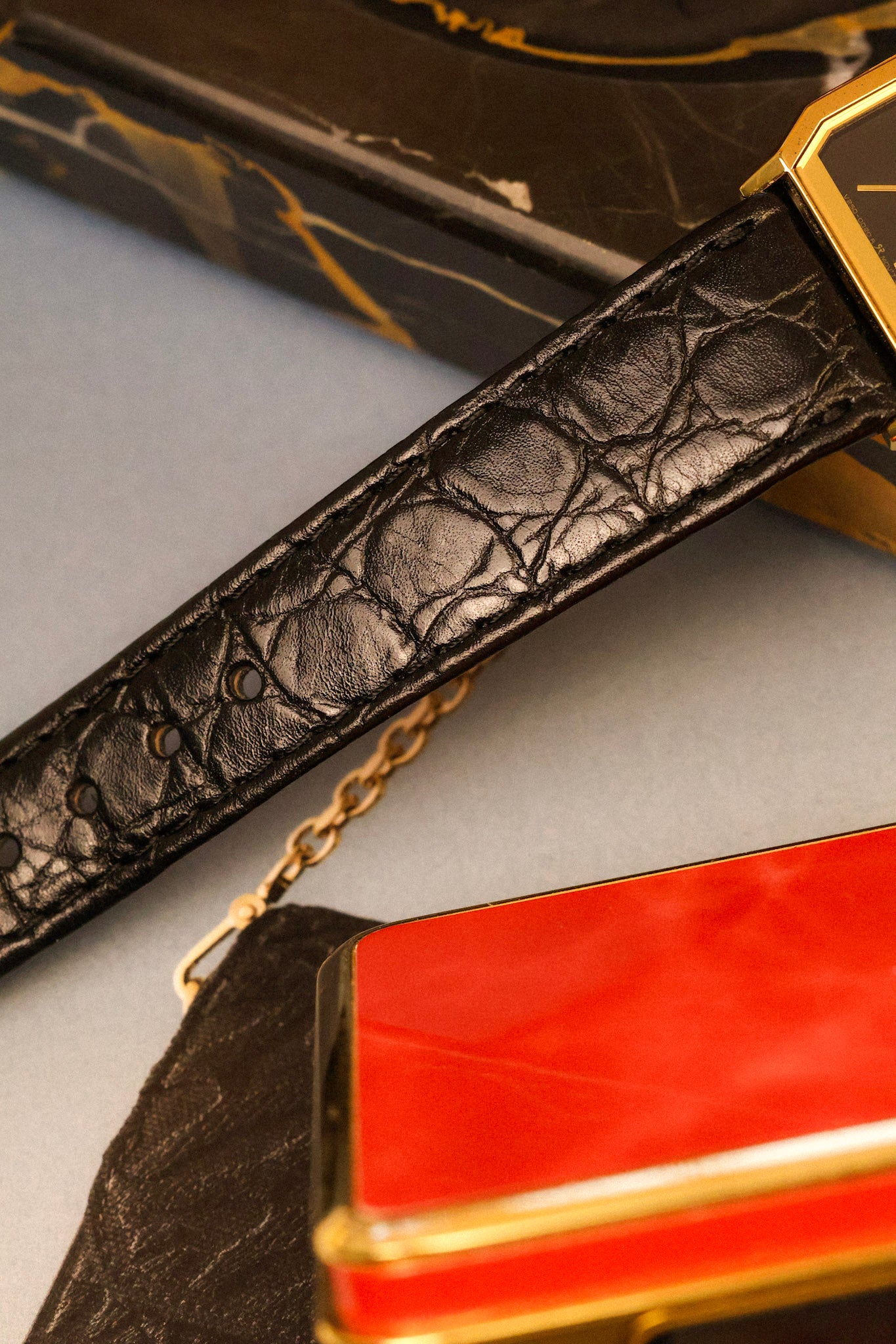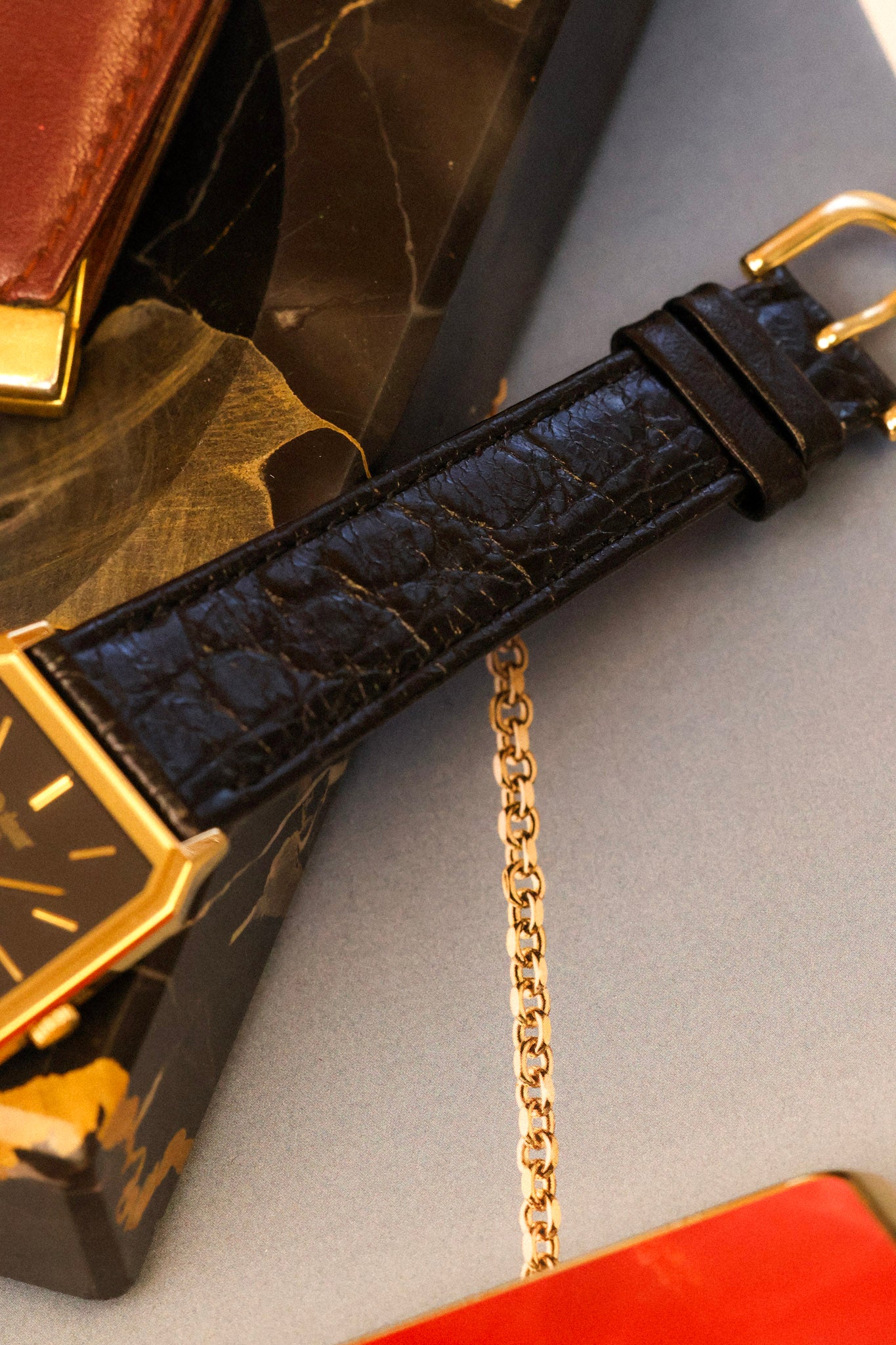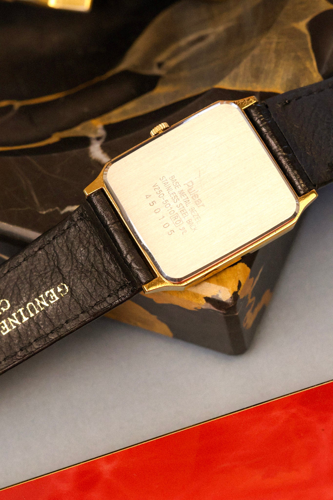 A beautiful neo-vintage piece with black dial, applied golden indices, and elegant pencil hands. Comes with original Pulsar croc grain black leather strap.