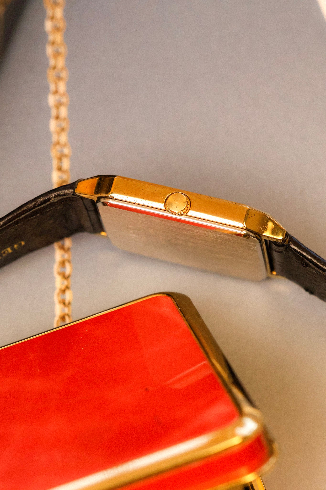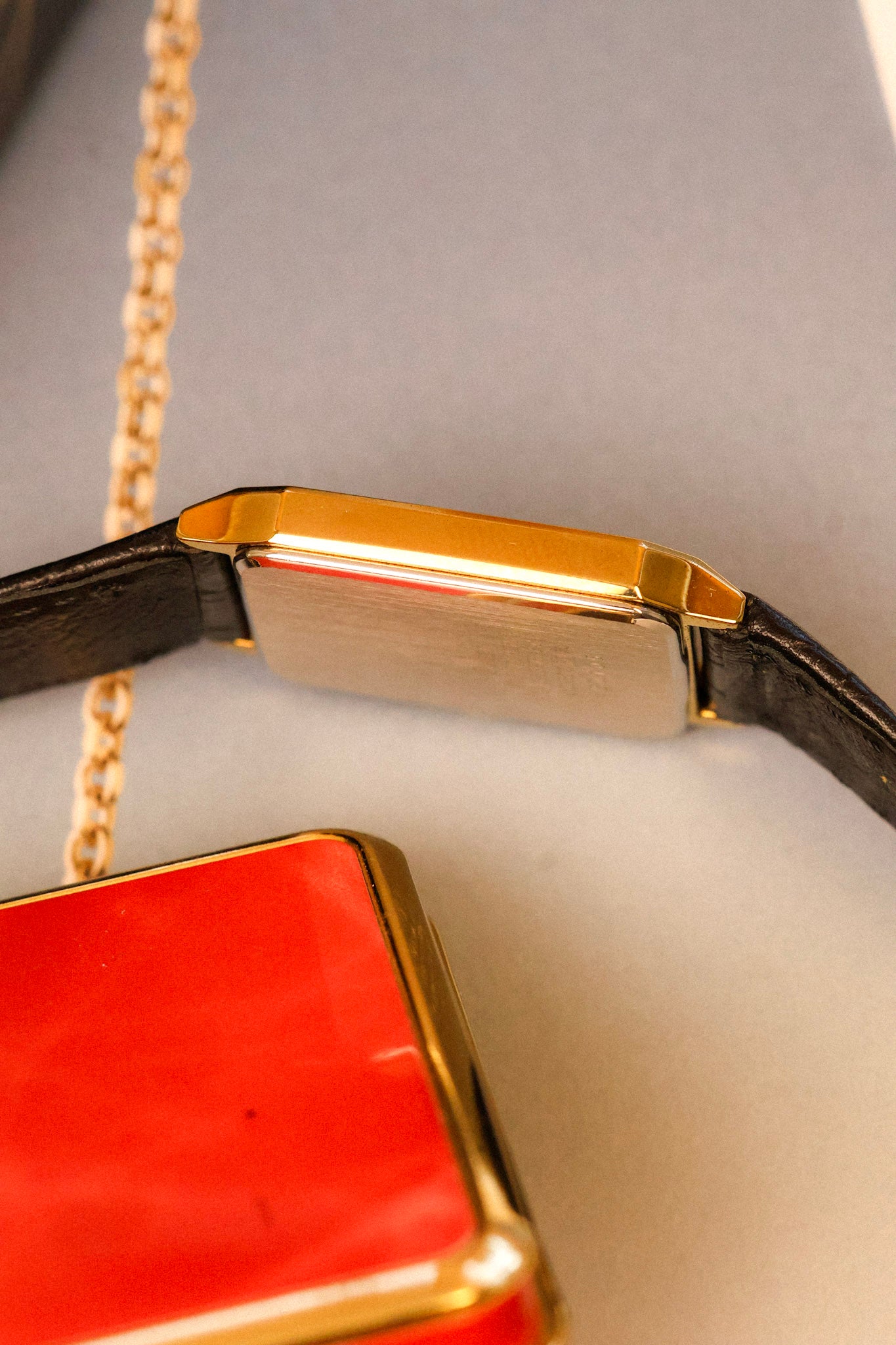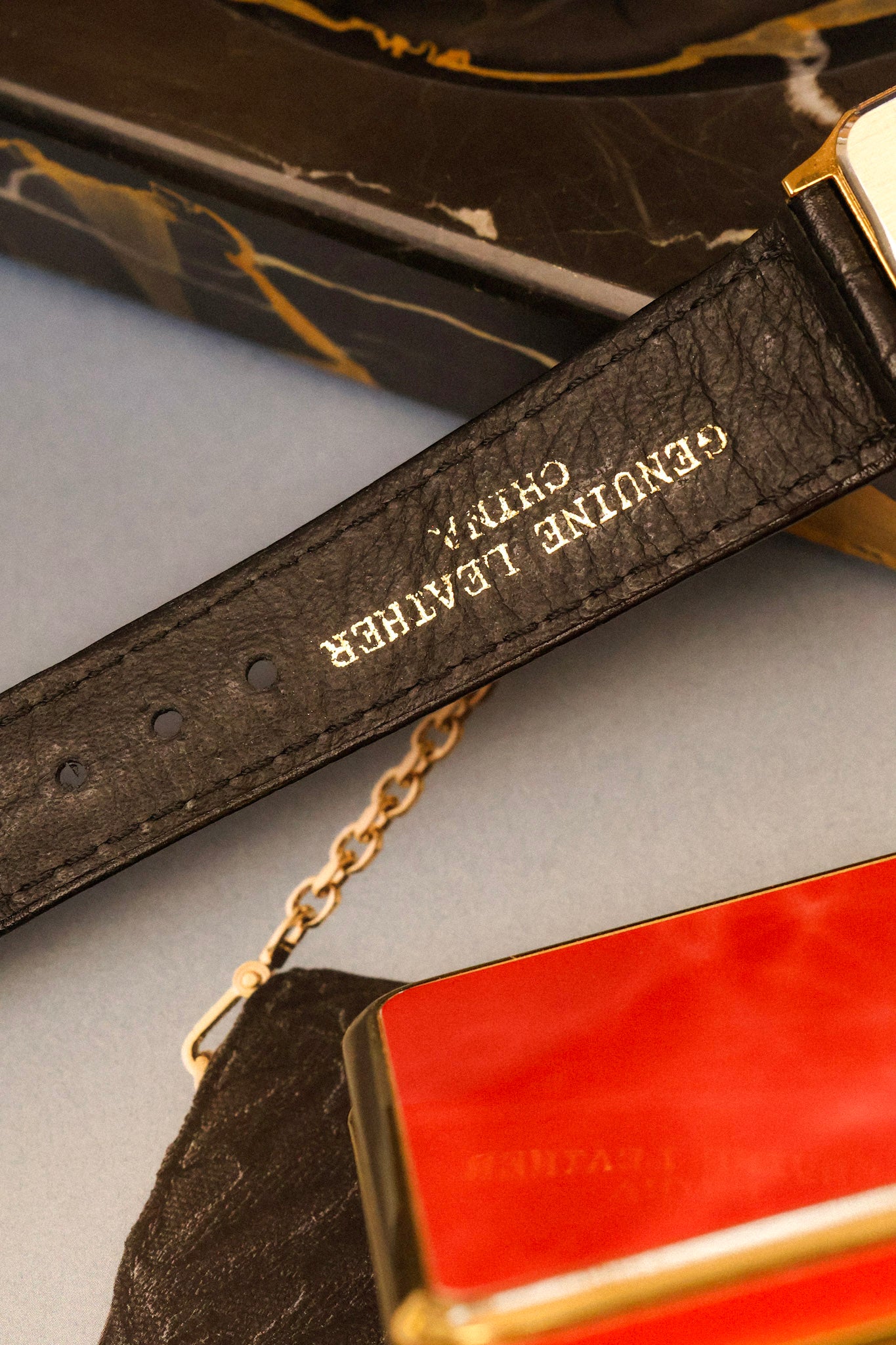 A beautiful neo-vintage piece with black dial, applied golden indices, and elegant pencil hands. Comes with original Pulsar croc grain black leather strap.