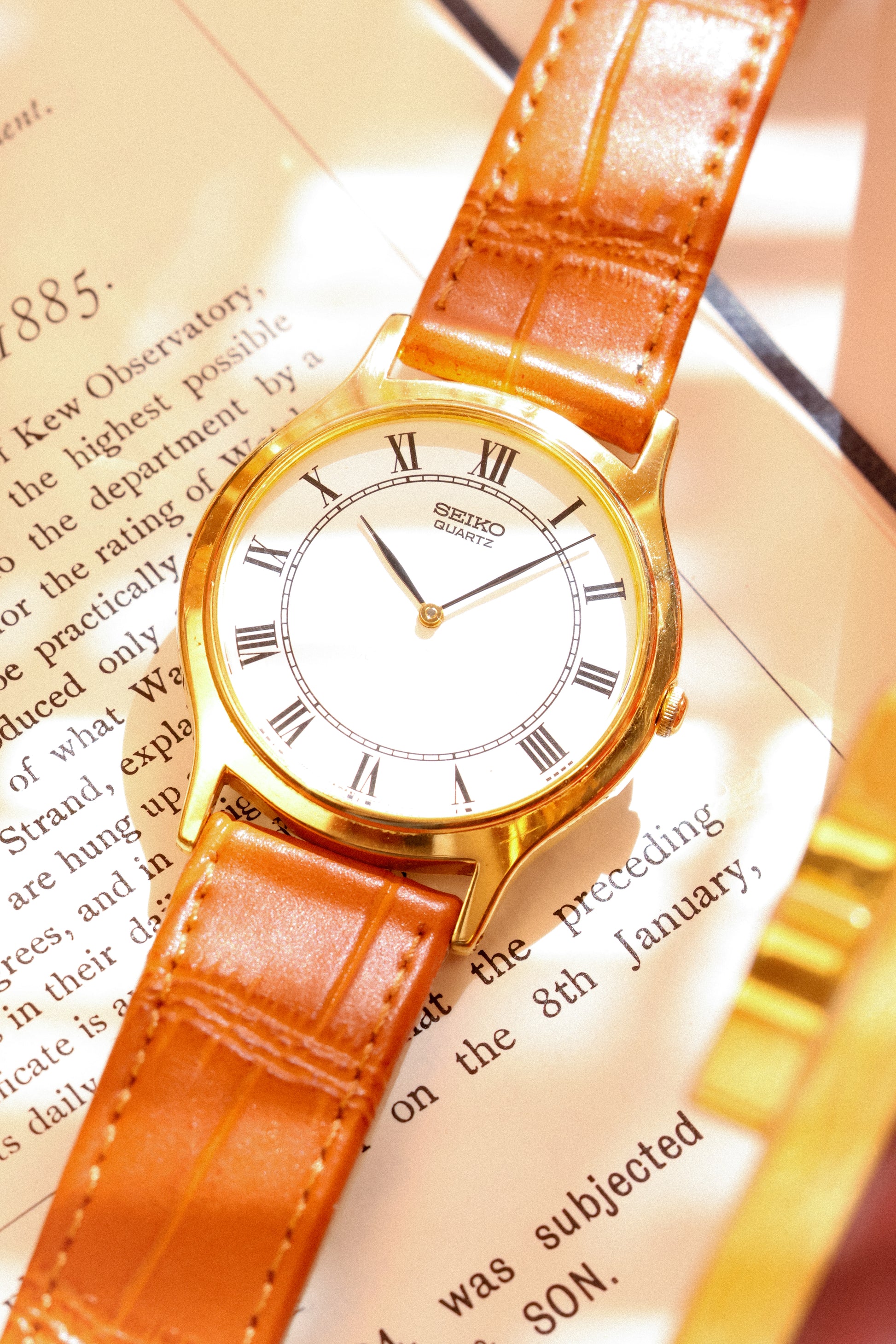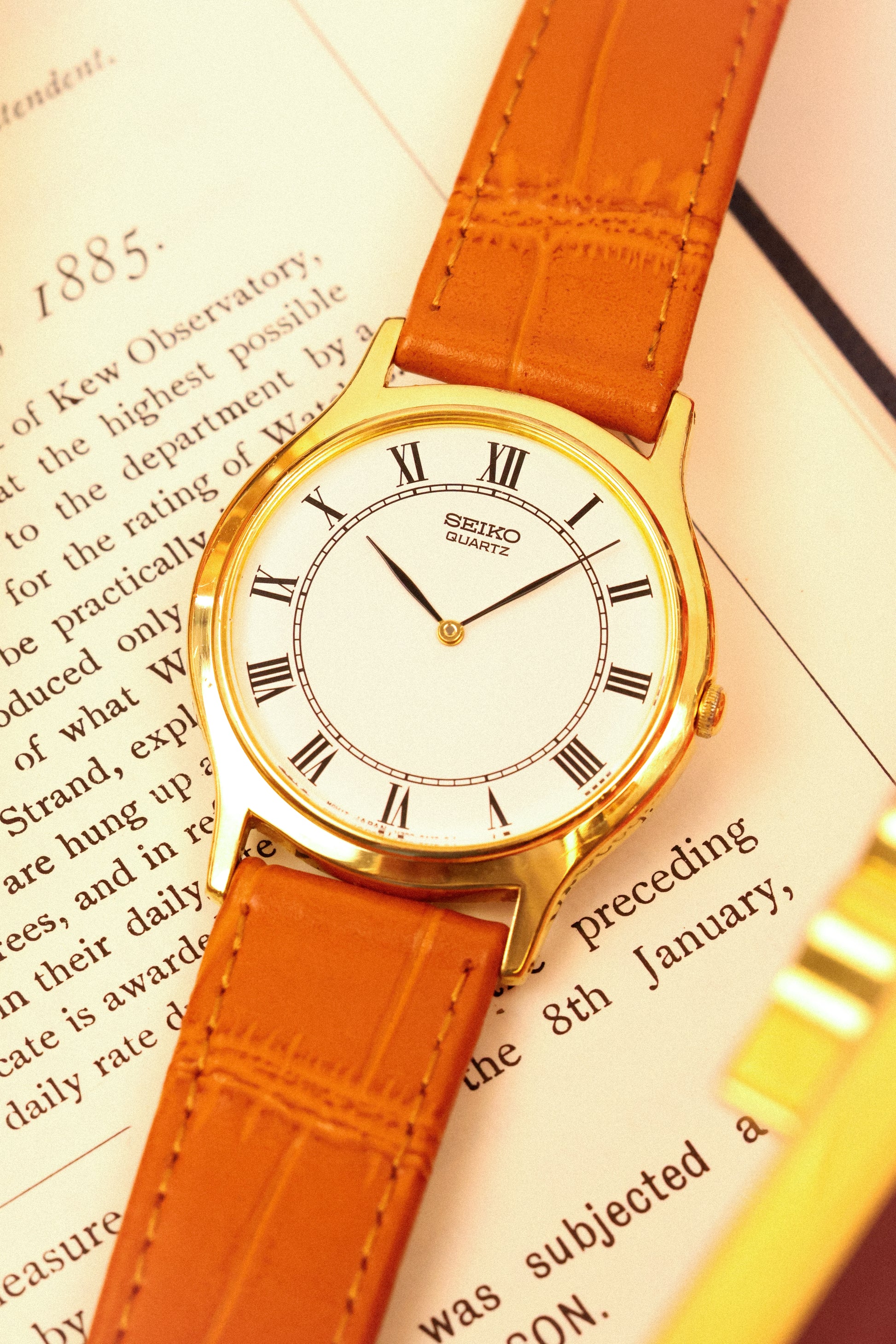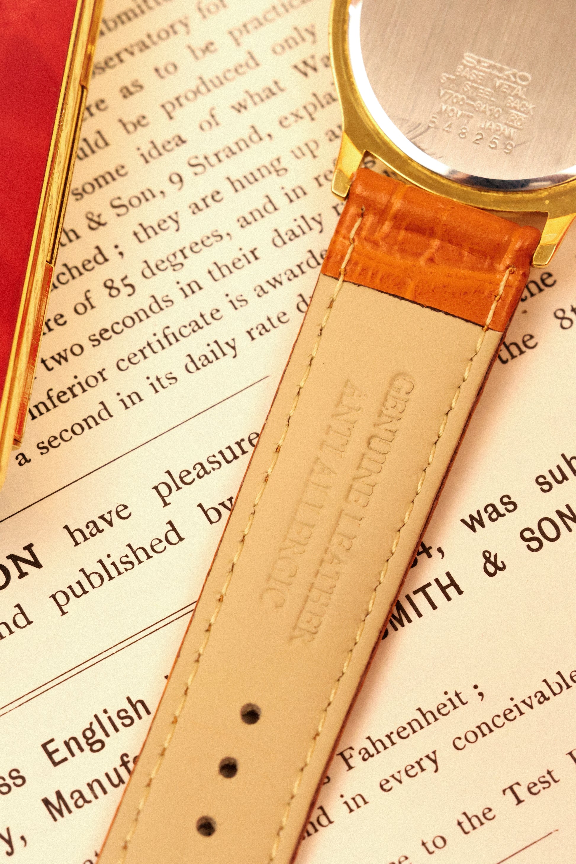 Absolutely stunning Seiko with gold tone case, thick lugs, white sector dial with printed Roman numerals, elegant leaf hands, and original crown. Comes with a new aftermarket Havana brown croc grain leather strap.