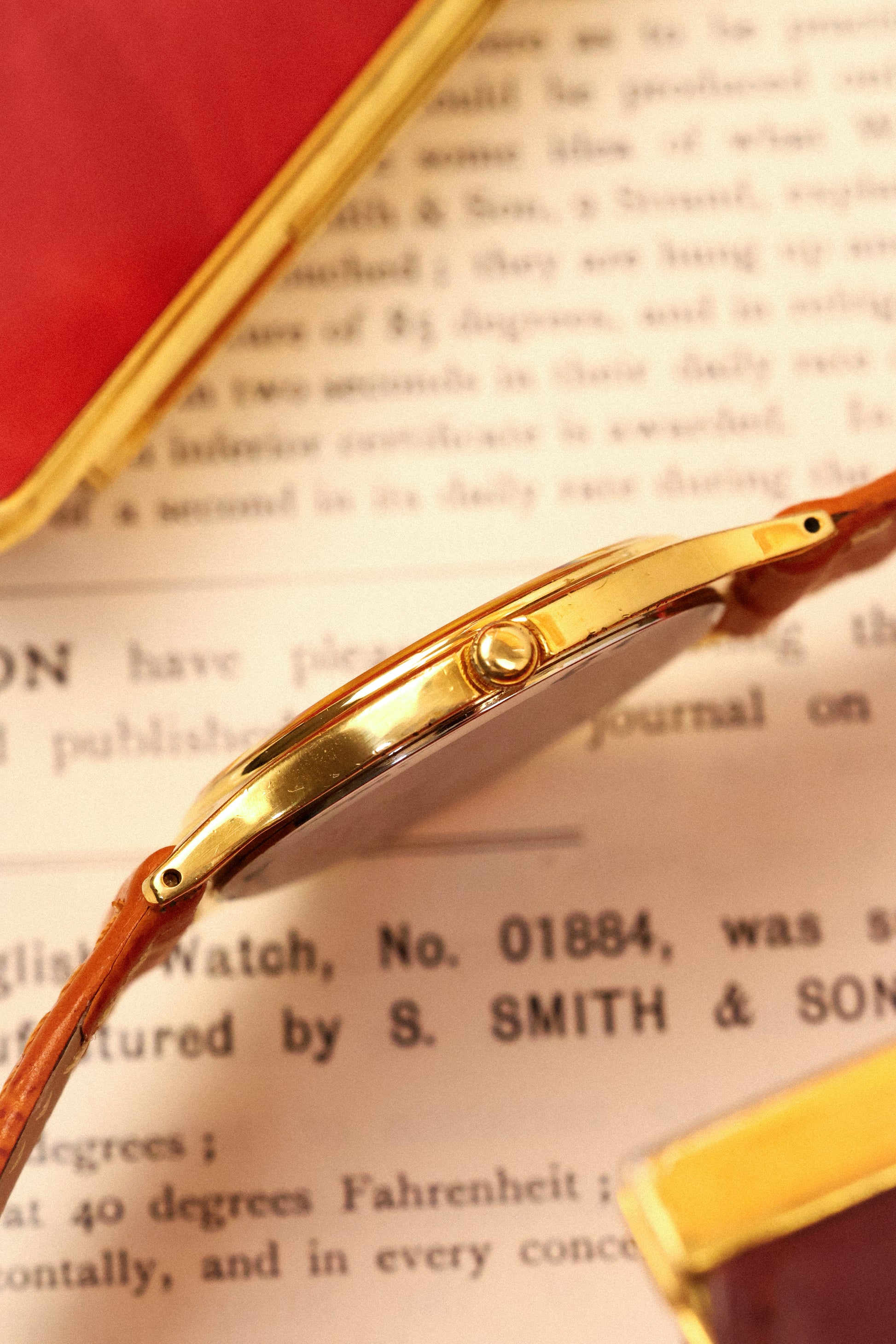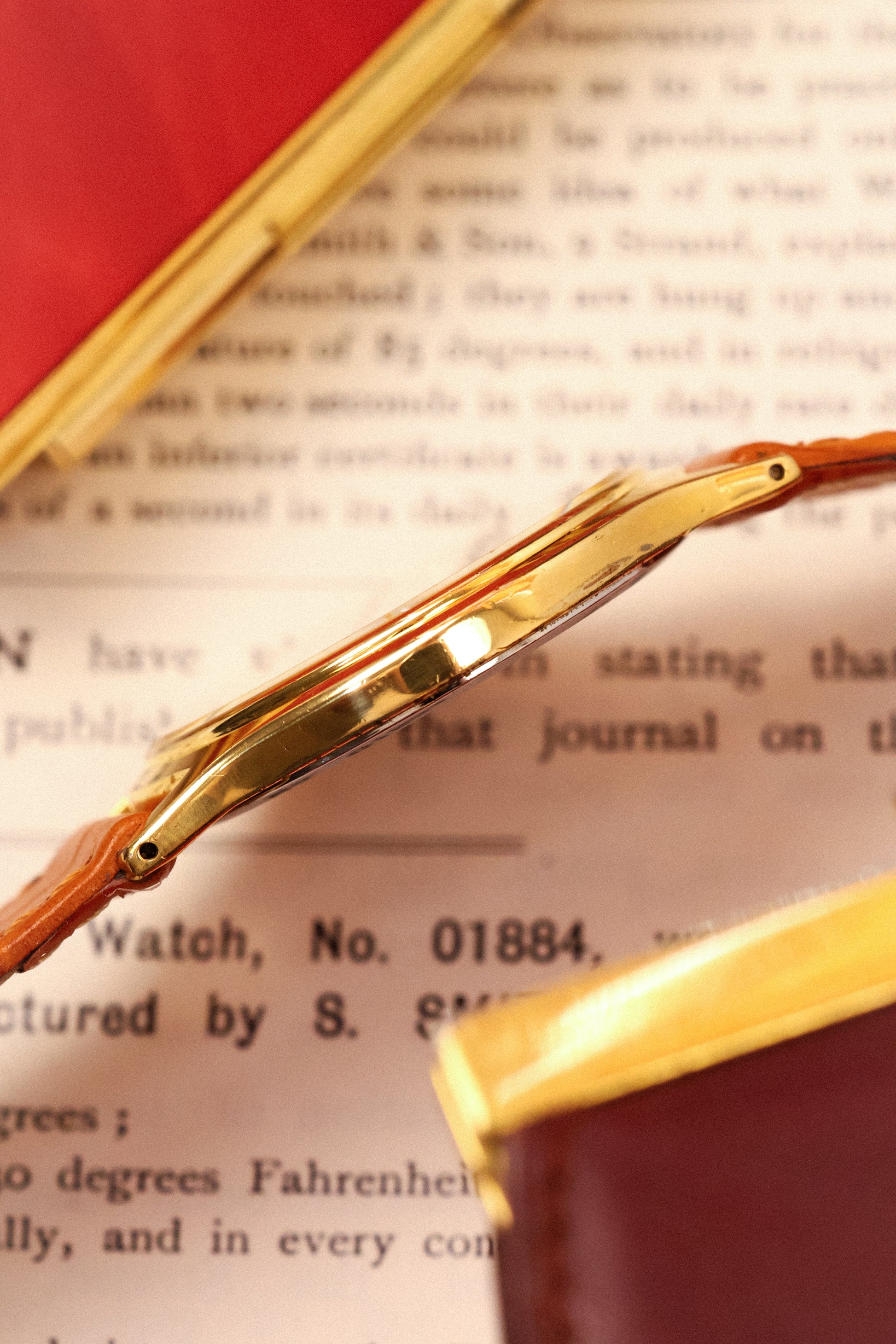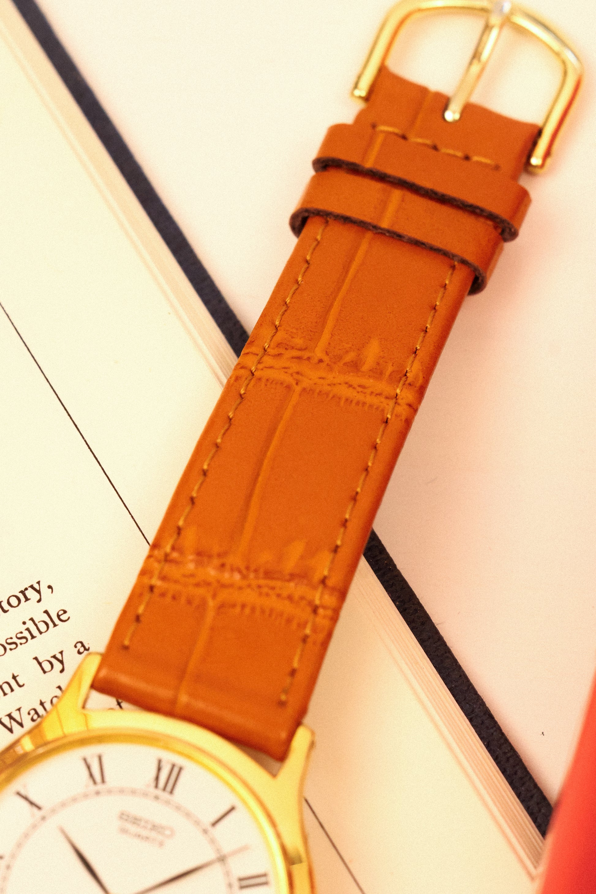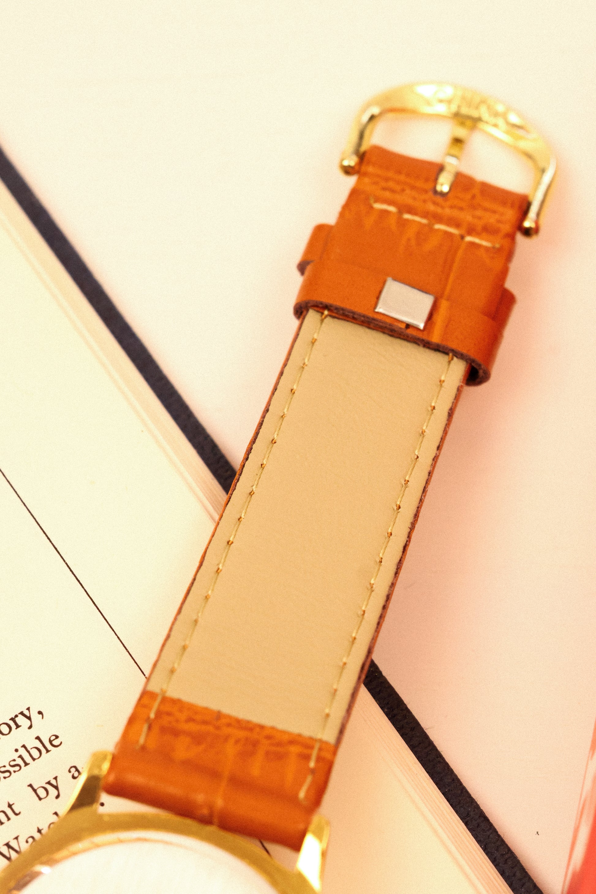 Absolutely stunning Seiko with gold tone case, thick lugs, white sector dial with printed Roman numerals, elegant leaf hands, and original crown. Comes with a new aftermarket Havana brown croc grain leather strap.
