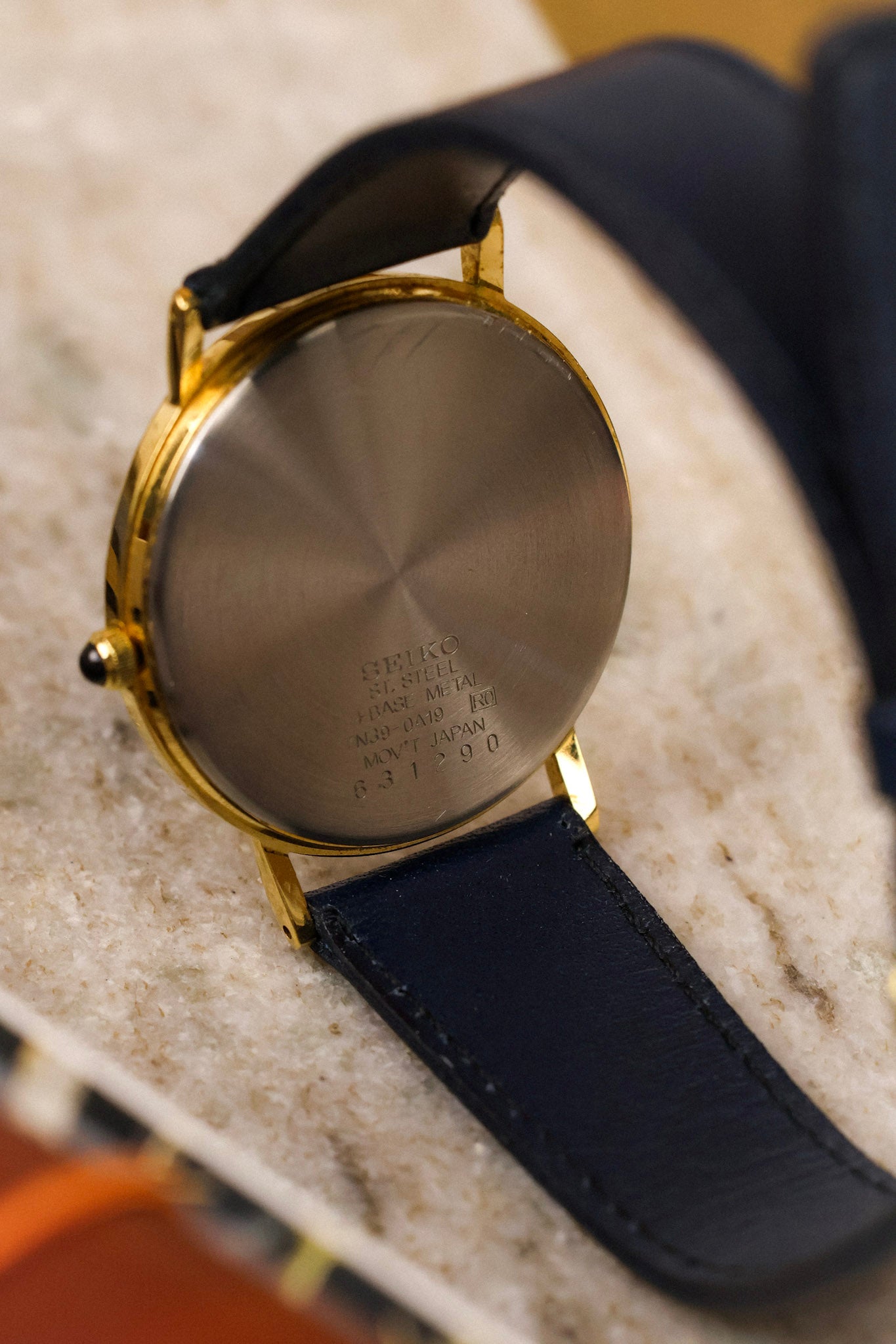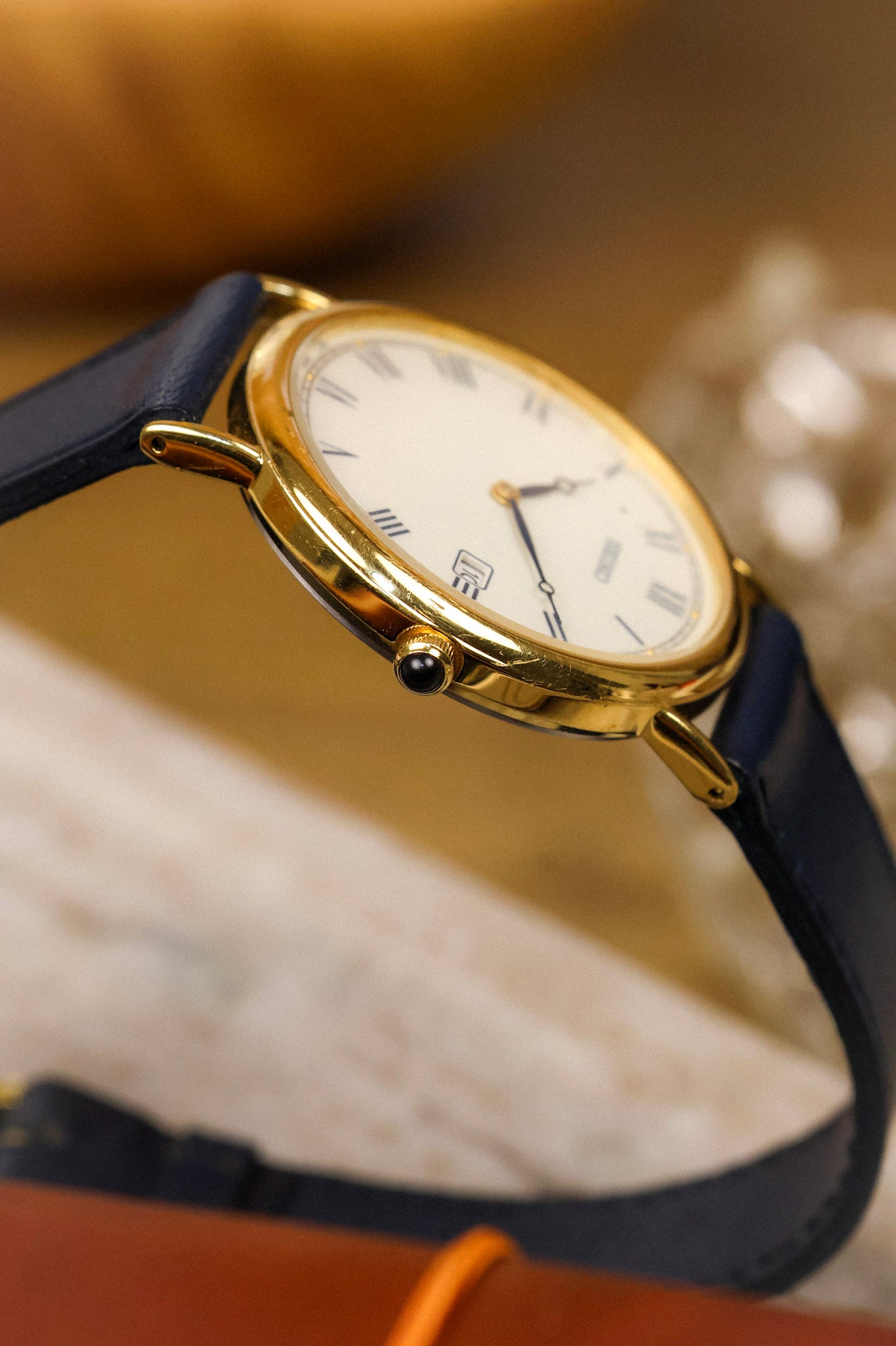Absolutely stunning Seiko with gold tone case, subtle cream colored dial with printed blue roman numerals, accompanying golden dot inlays, outer minute track, blue 'Breguet Style" hands, and black cabochon crown. Date display at 3 o'clock. Comes with a new old stock blue leather strap.
