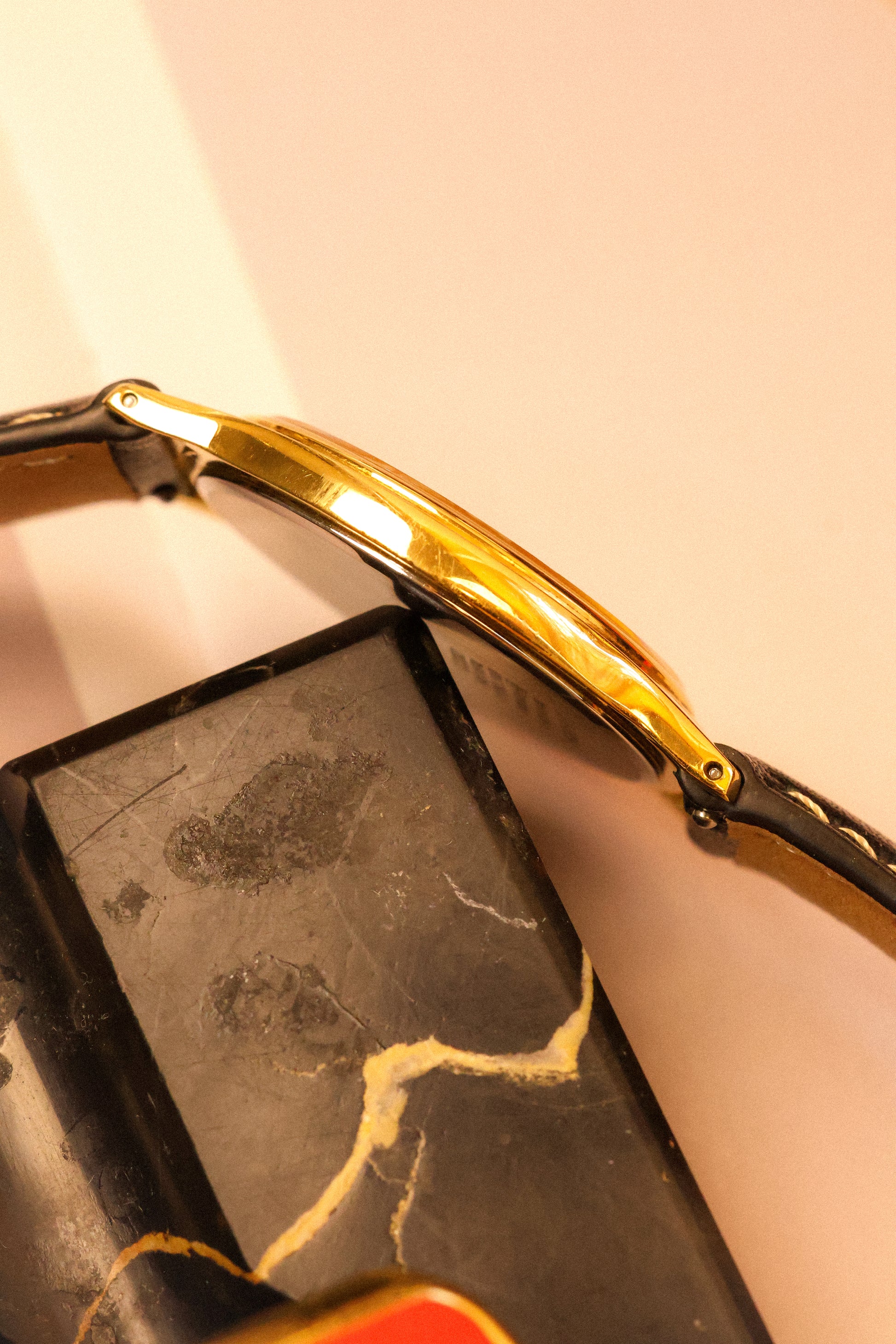In great condition. Light wear consistent with age and use. Crystal is clean. Light plating wear on crown, but otherwise functions as intended. Aftermarket strap is in excellent condition and is good for daily use. See photos for details - they are part of the description. Overall a very nice piece that is ready to wear and enjoy.