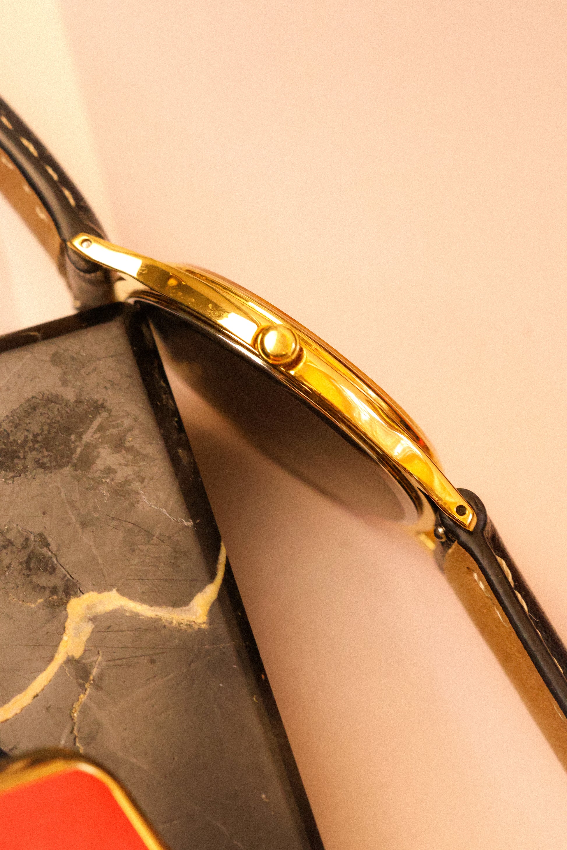 Absolutely stunning Seiko with gold tone case, thick lugs, white sector dial with printed Roman numerals, elegant leaf hands, and original crown. Comes with its original croc grain black leather strap in pre-loved condition and original signed buckle.
