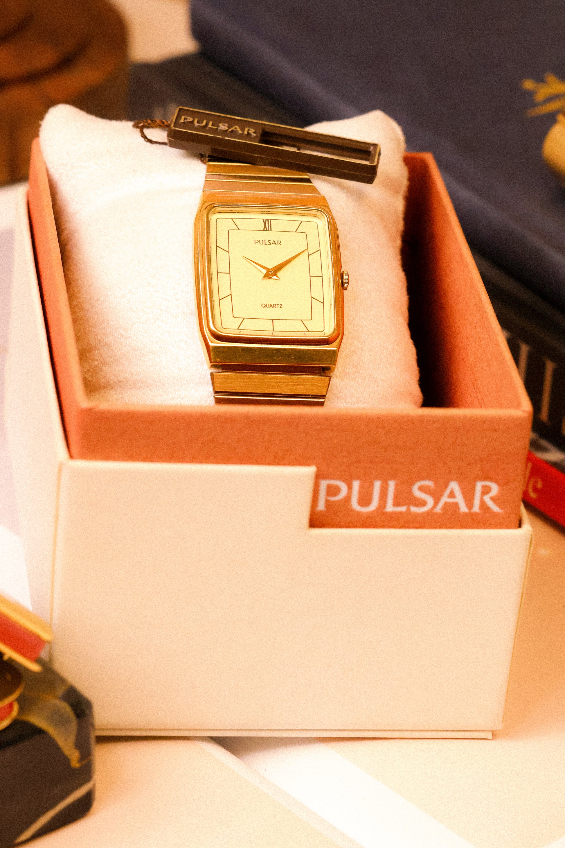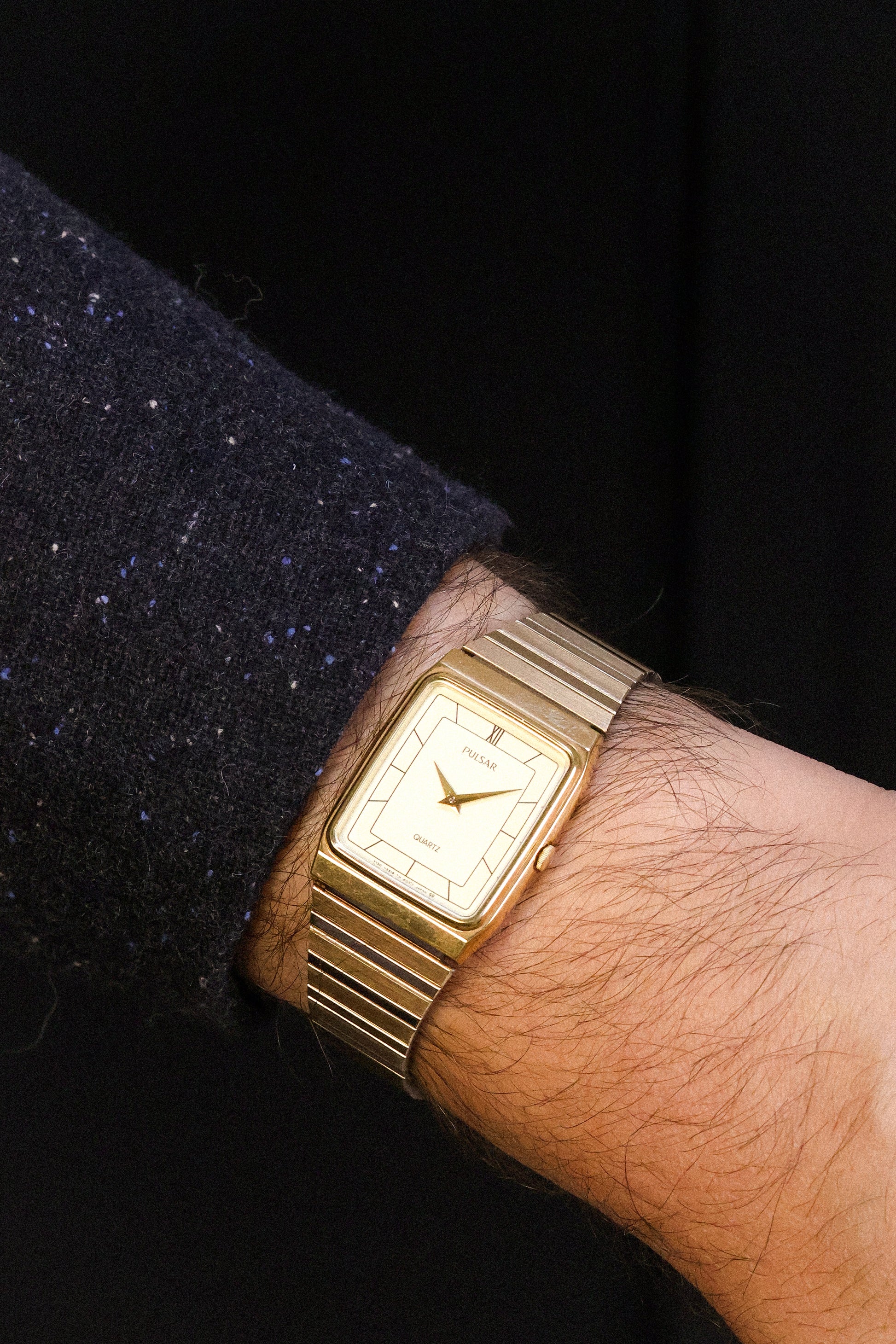 Inspired by the classic high horology gold pieces from the 80s. Featuring a champagne gold tone case, champagne dial, printed indices, sharp dauphine hands, and original crown. This piece is in new old stock condition and comes with original unworn Pulsar bracelet, and hang tag. Also comes with a Pulsar retail box and booklet.