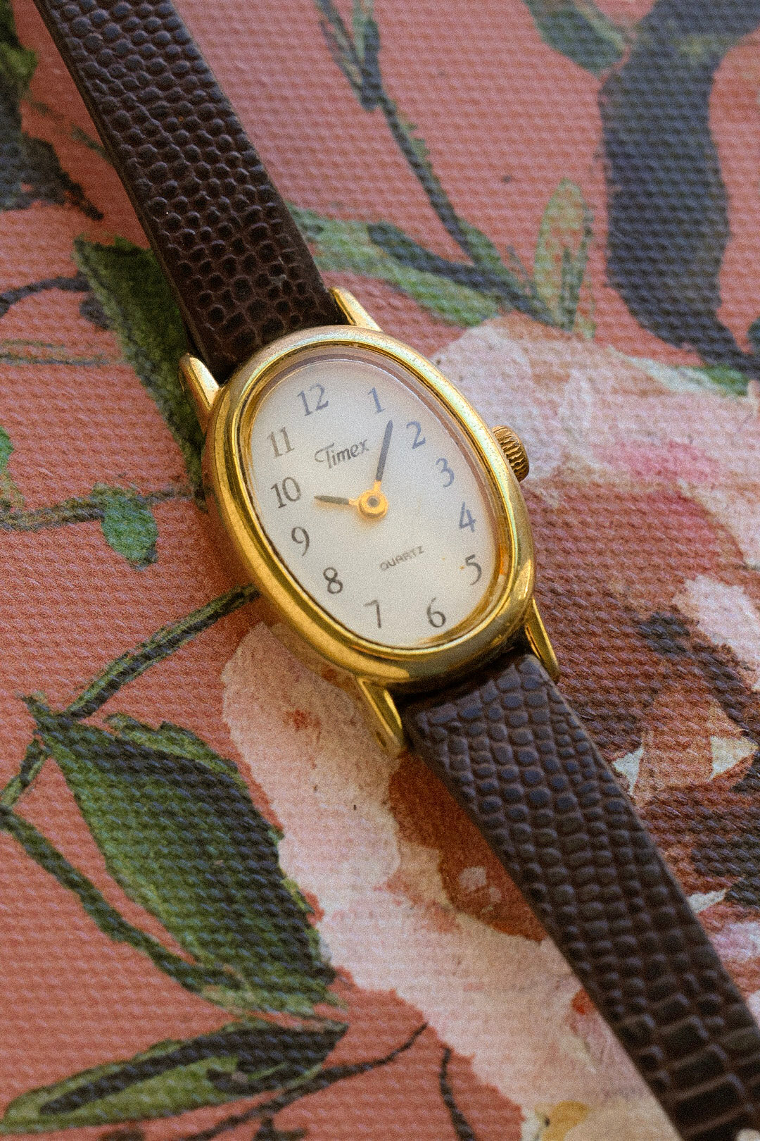 Beautiful Timex mini baignoire from 1997 - featuring a gold tone case, white dial, printed Arabic numerals, elegant pencil hands, and iconic logo. Comes with a new old stock aftermarket dark brown leather strap.