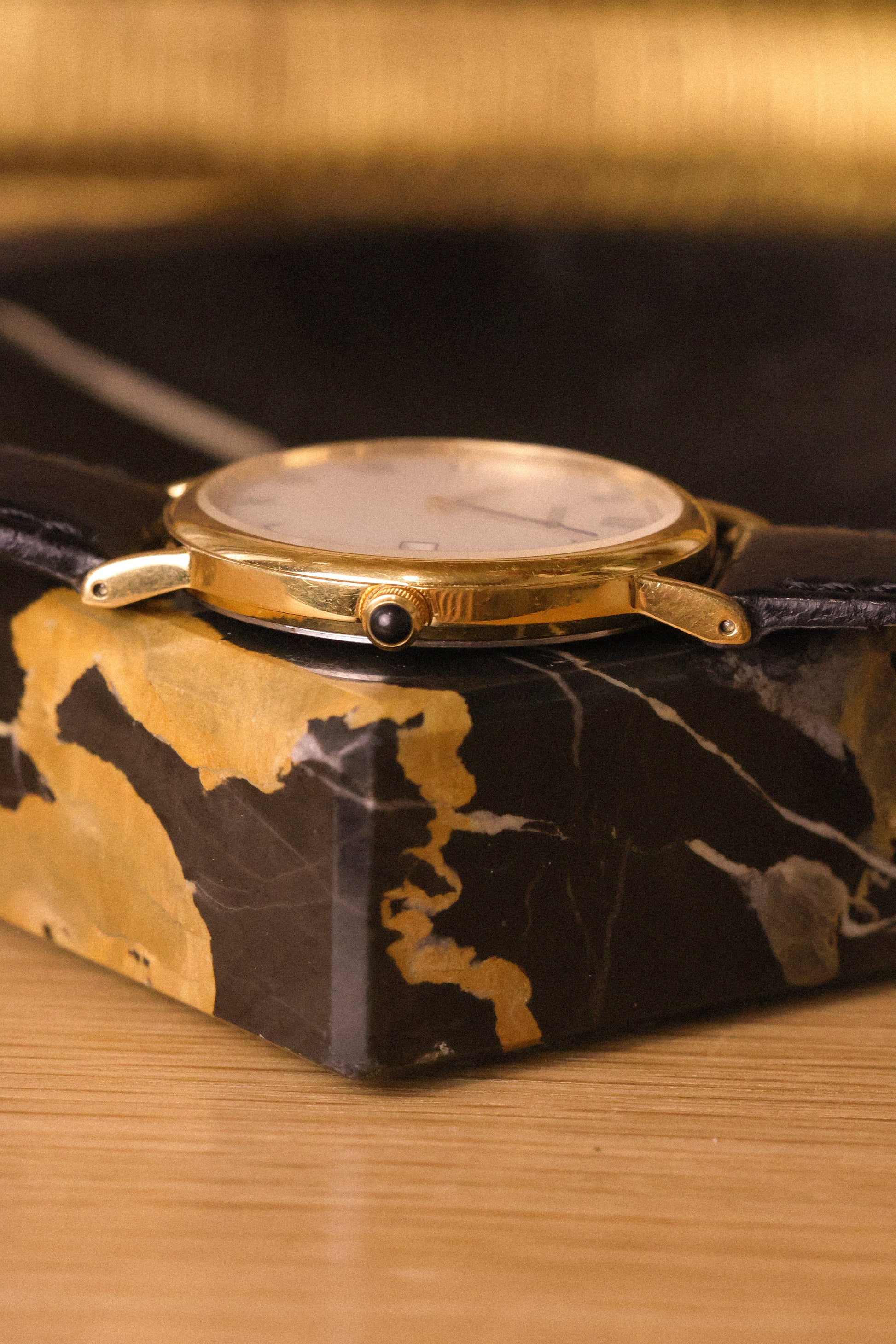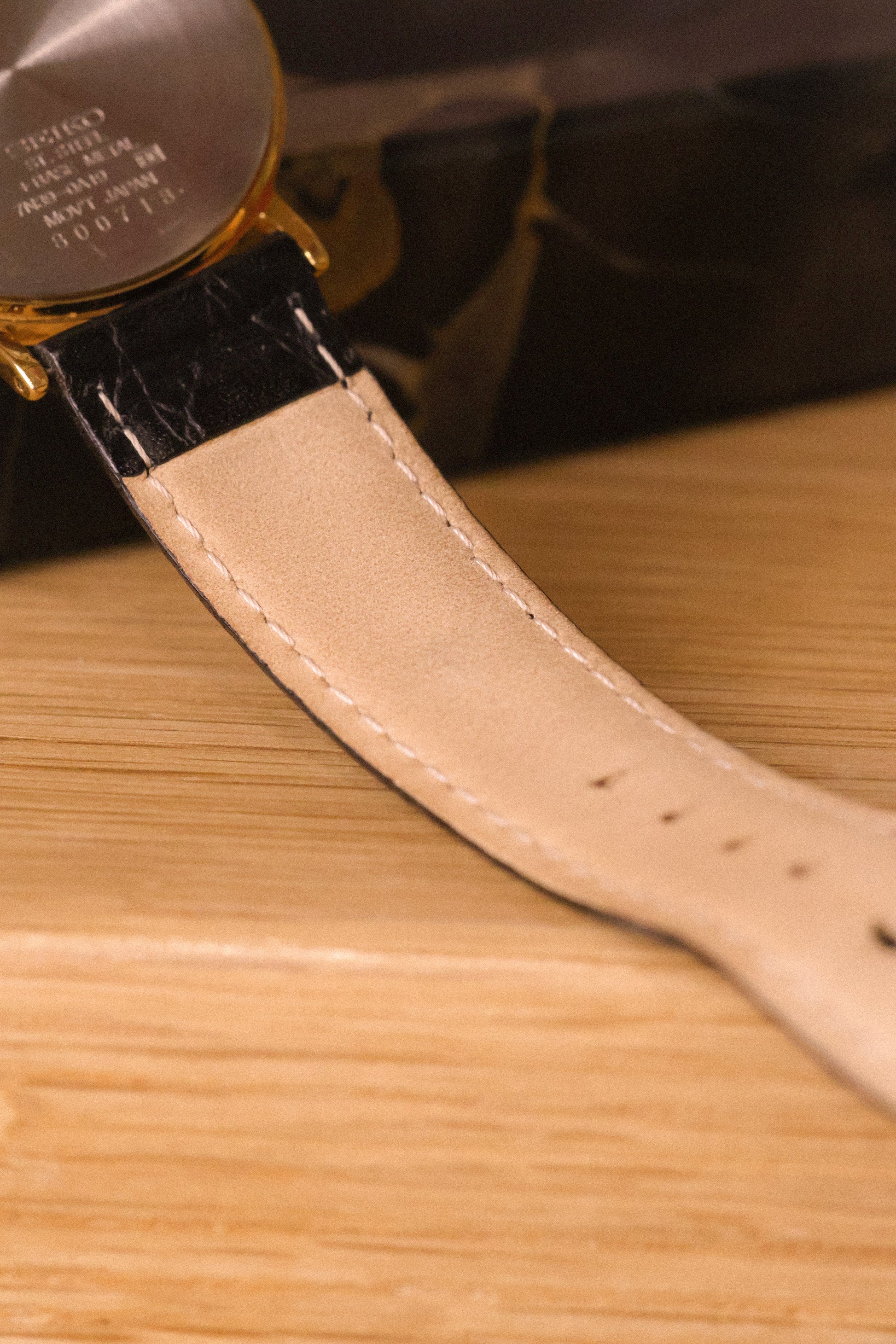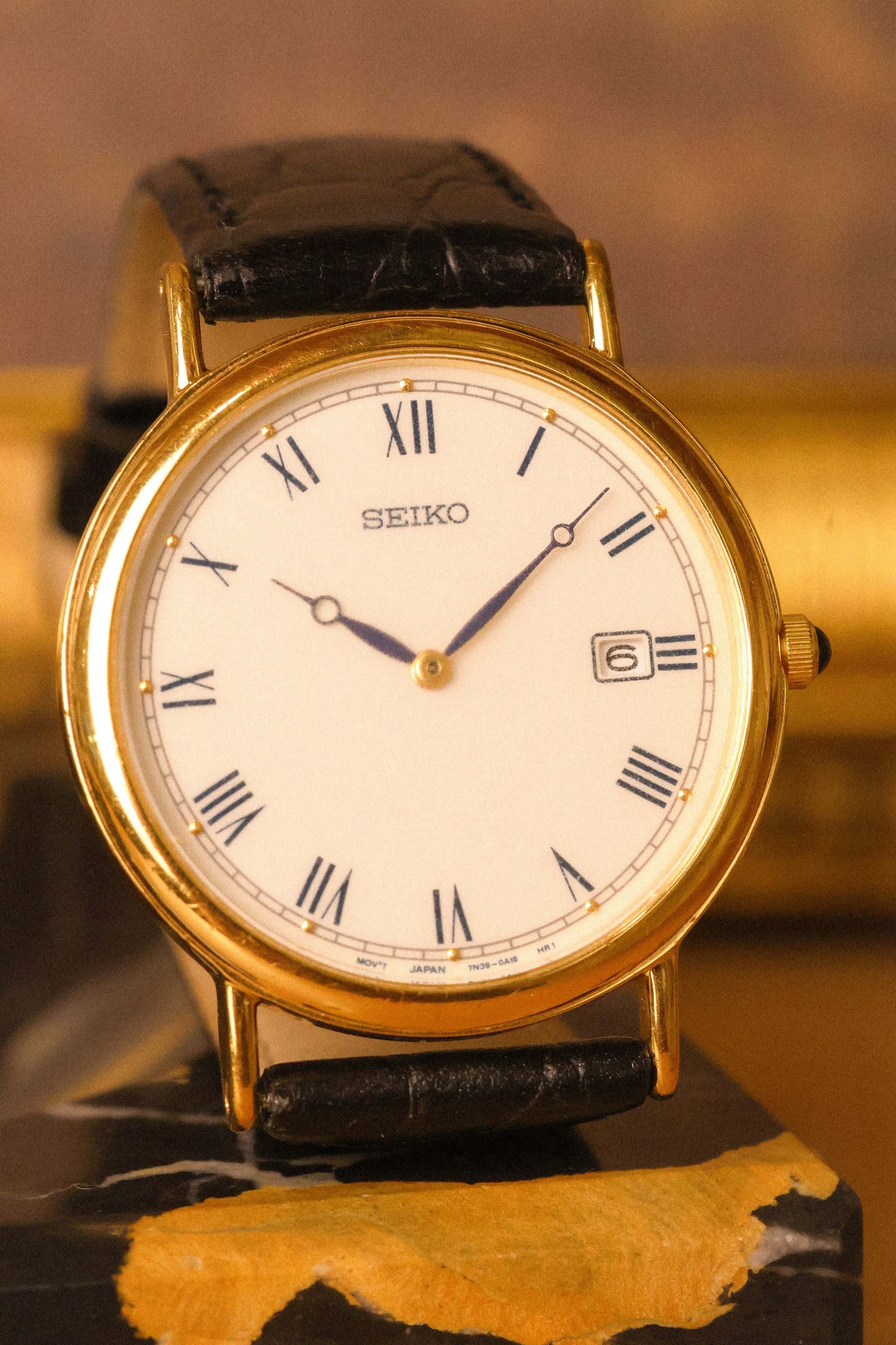 Absolutely stunning Seiko with gold tone case, subtle cream colored dial with printed blue roman numerals, accompanying golden dot inlays, outer minute track, blue 'Breguet Style" hands, and black cabochon crown. Date display at 3 o'clock. Comes with a lightly pre-loved croc grain black leather strap.