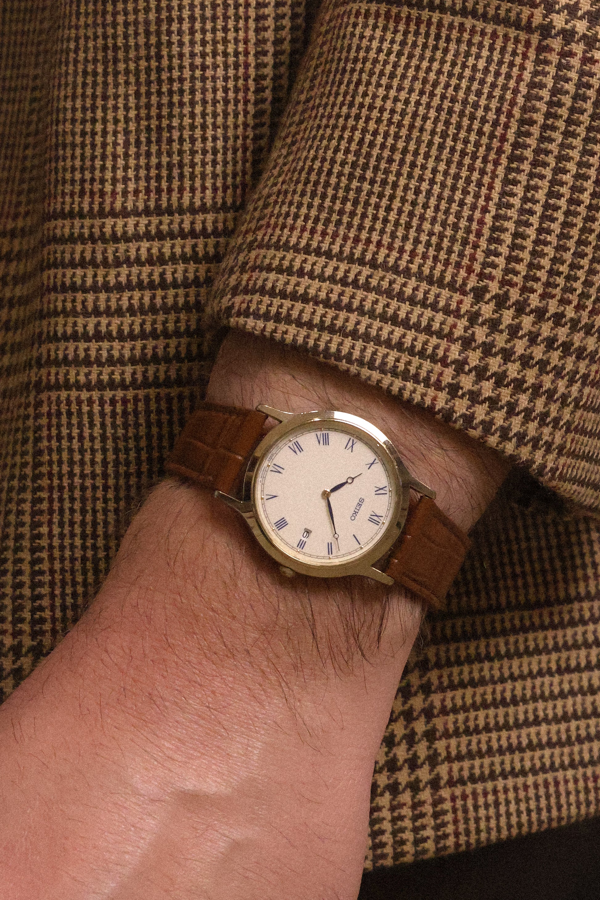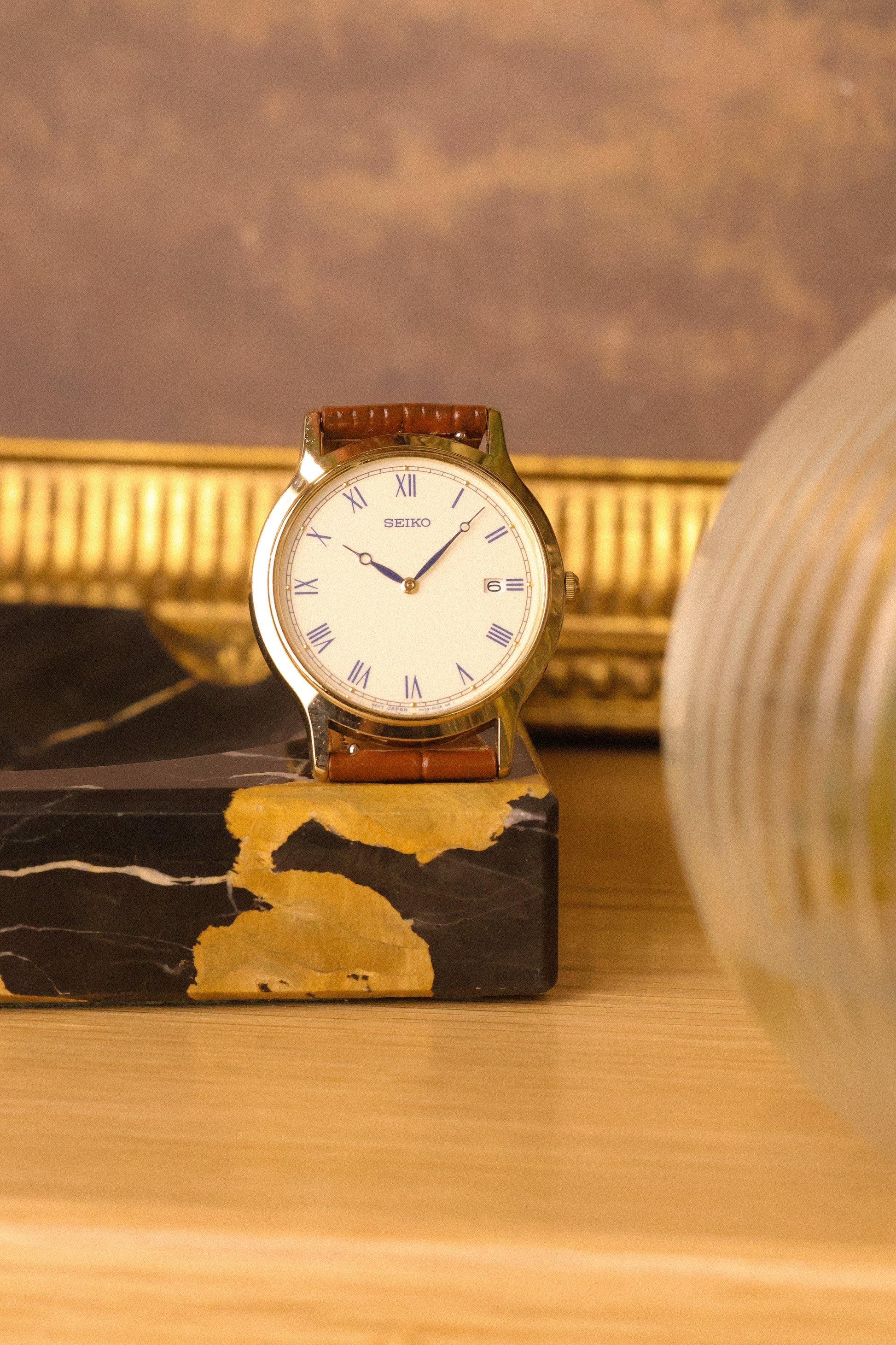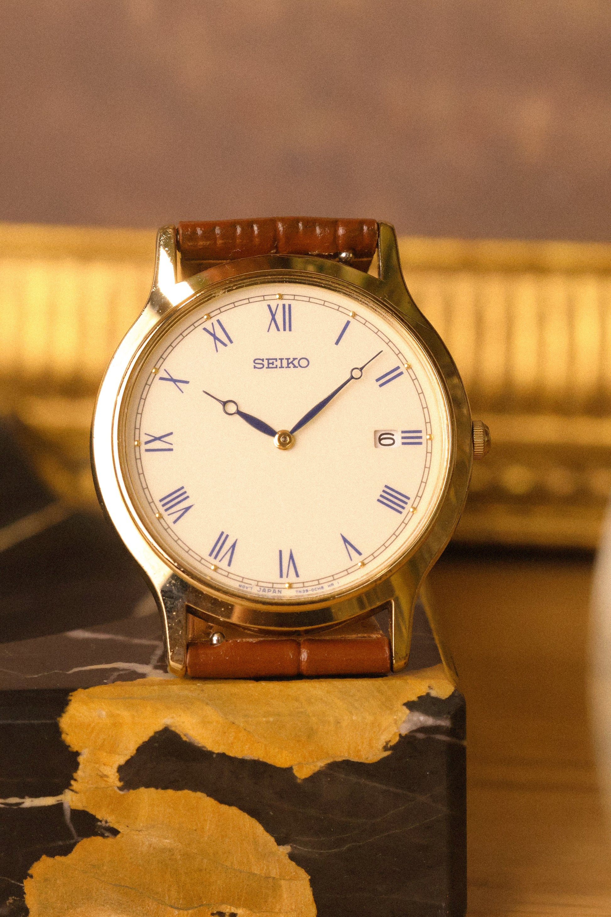 Absolutely stunning Seiko with gold tone case, thick lugs, subtle cream colored dial with printed blue roman numerals, accompanying golden dot inlays, outer minute track, blue 'Breguet Style" hands, and Date display at 3 o'clock. Comes with a new aftermarket croc grain brown leather strap.