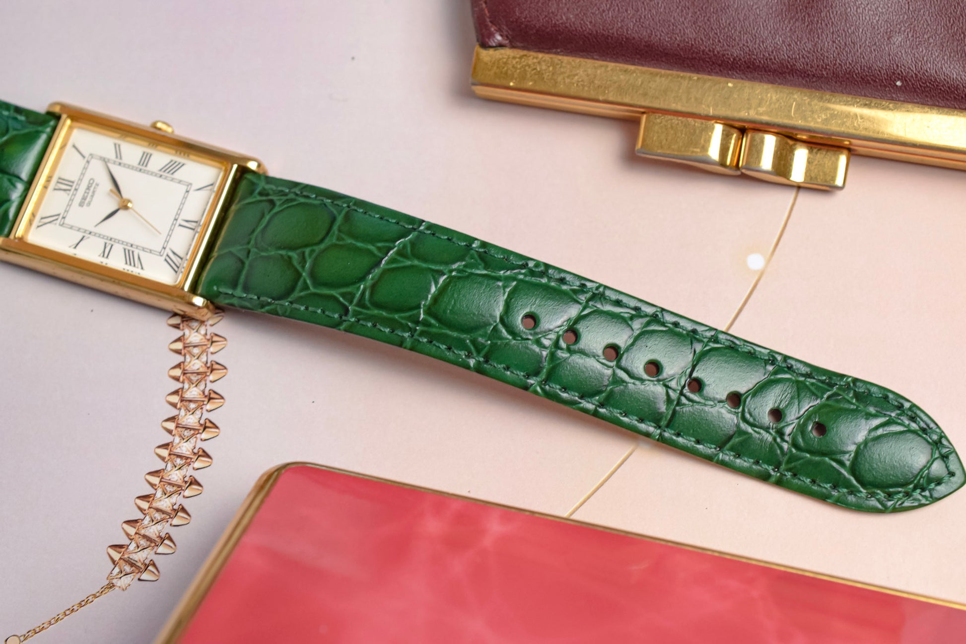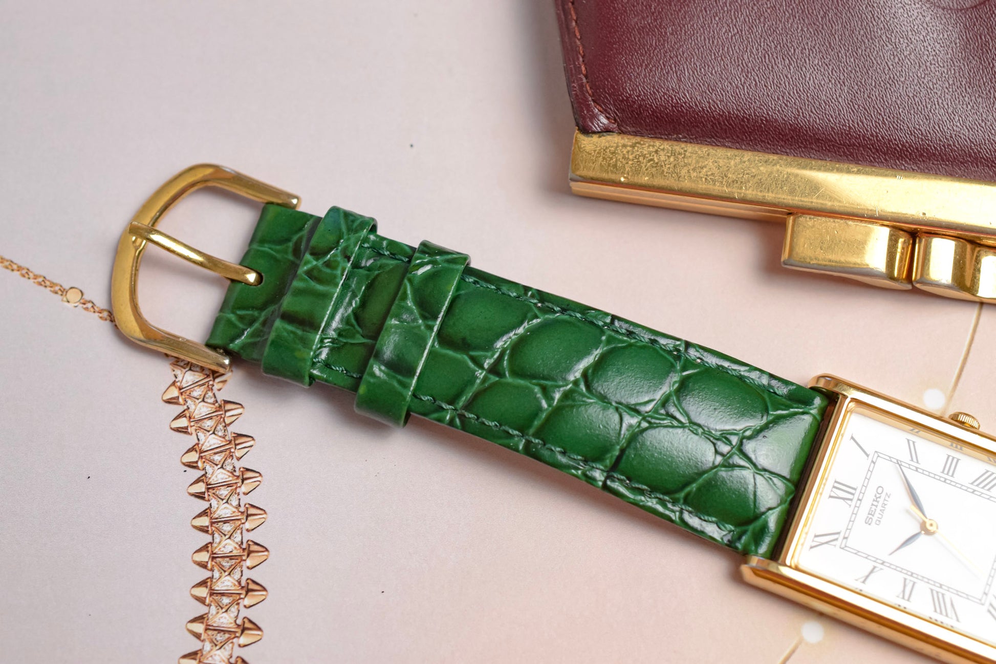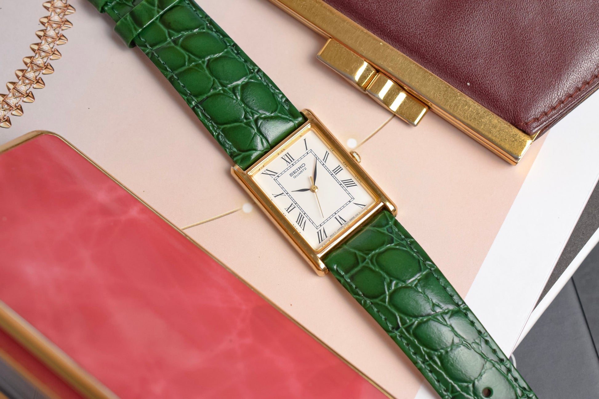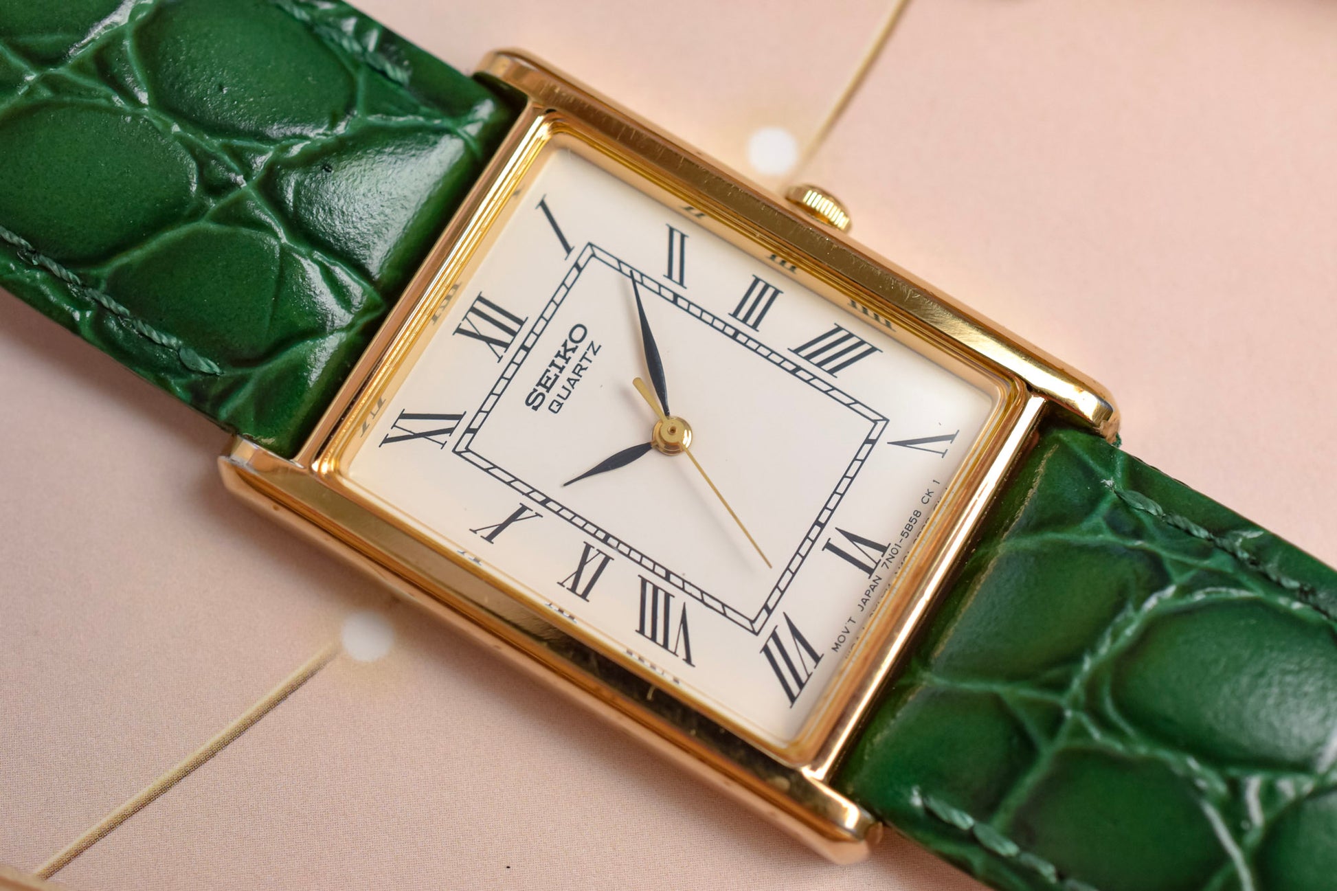 A classic Seiko Tank with a clean white roman dial, gold tone tank style case, elegant leaf hands, original crown, and aftermarket croc grain green leather strap by Hirsch. All inspired by the classic Cartier Tank design language for a fraction of the price.