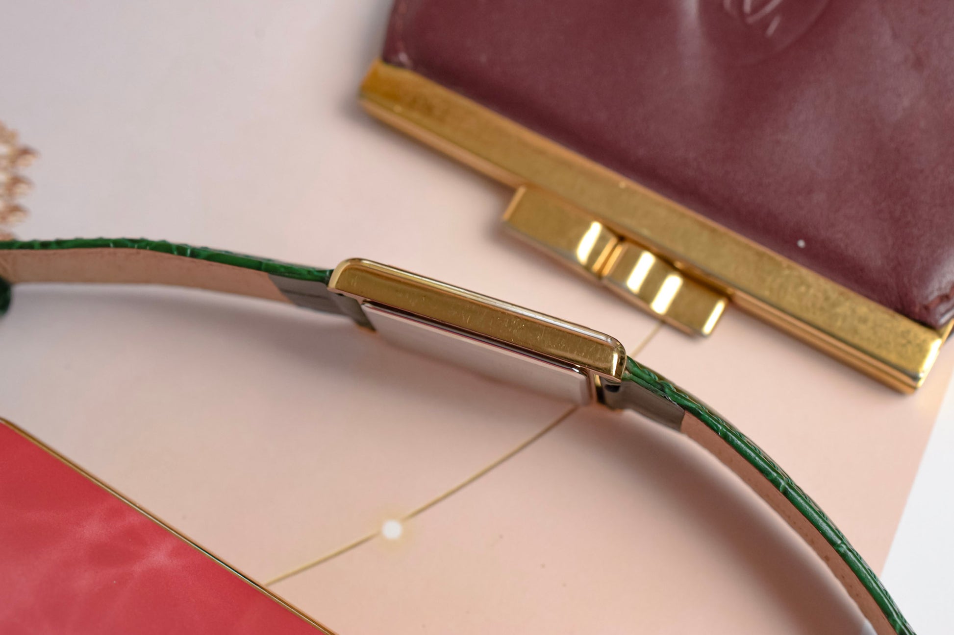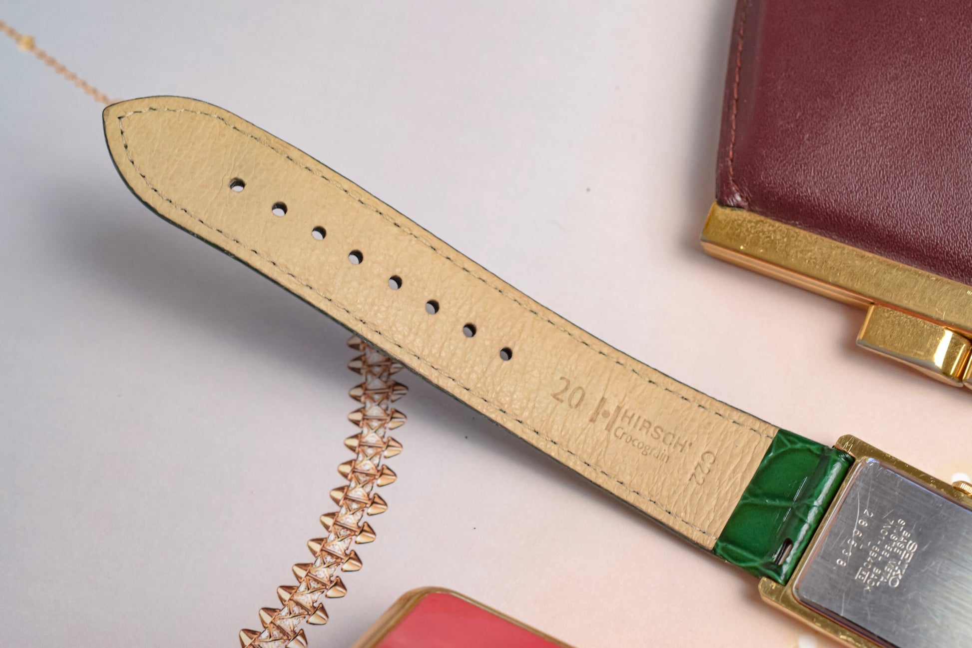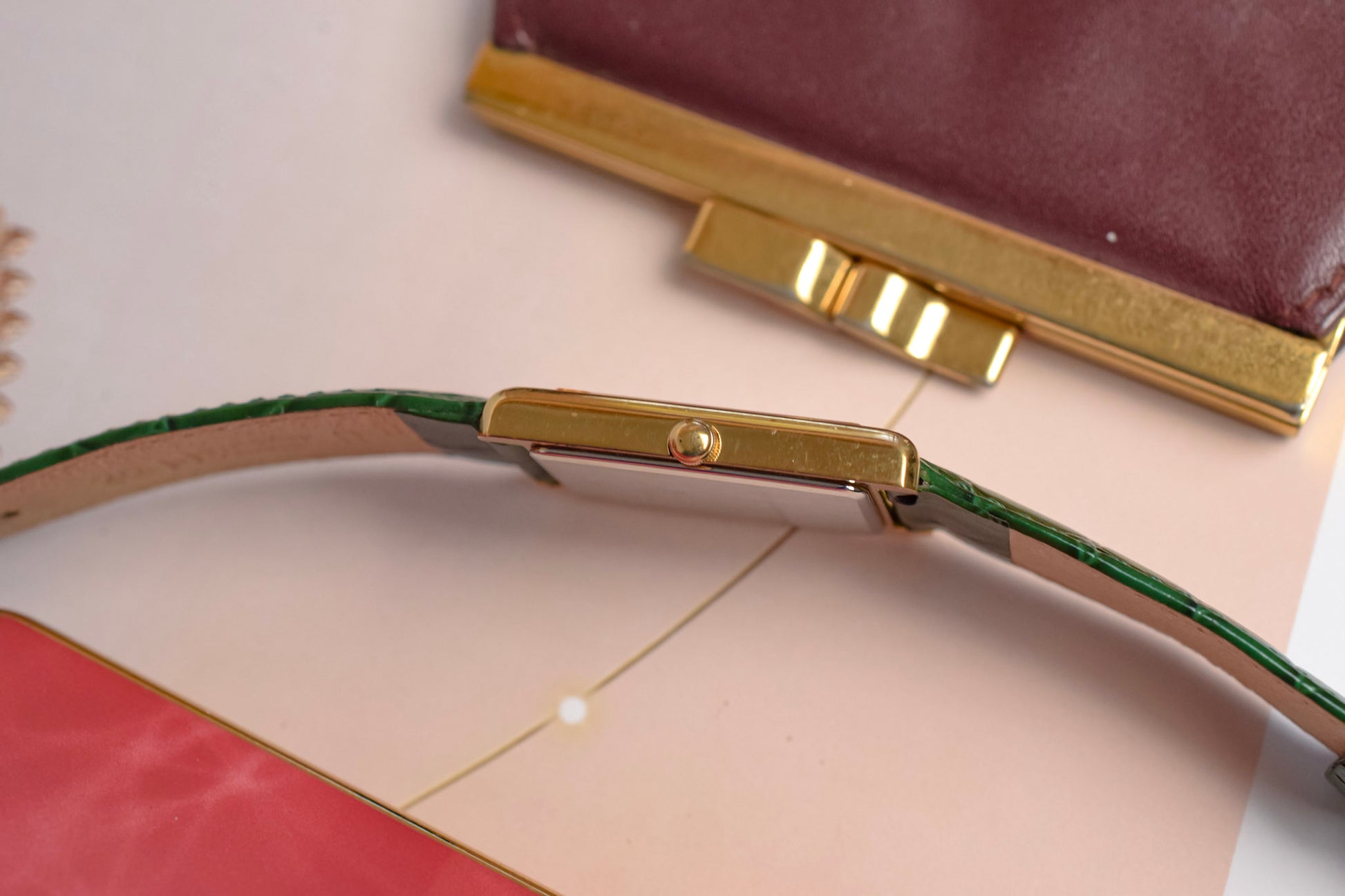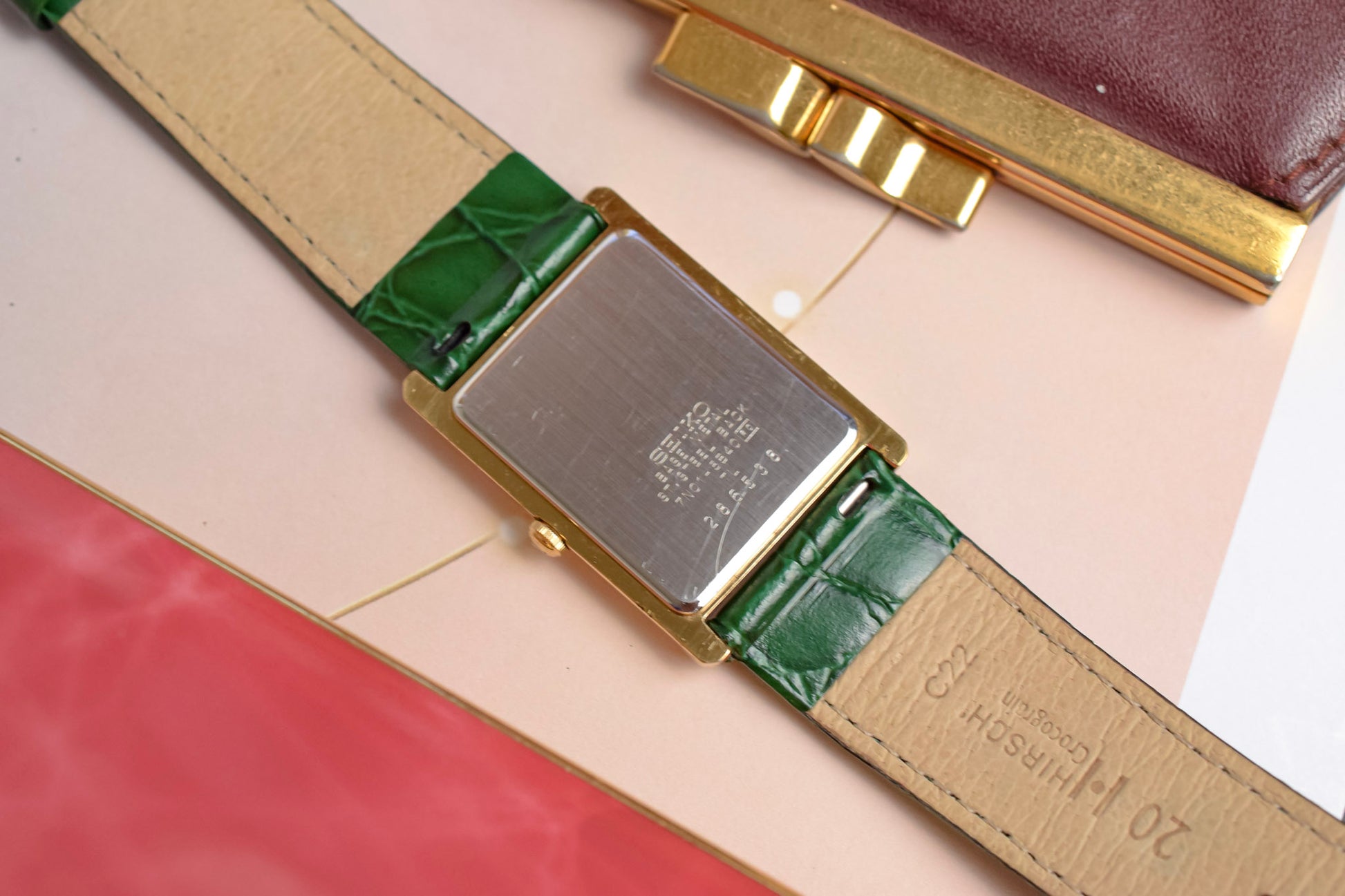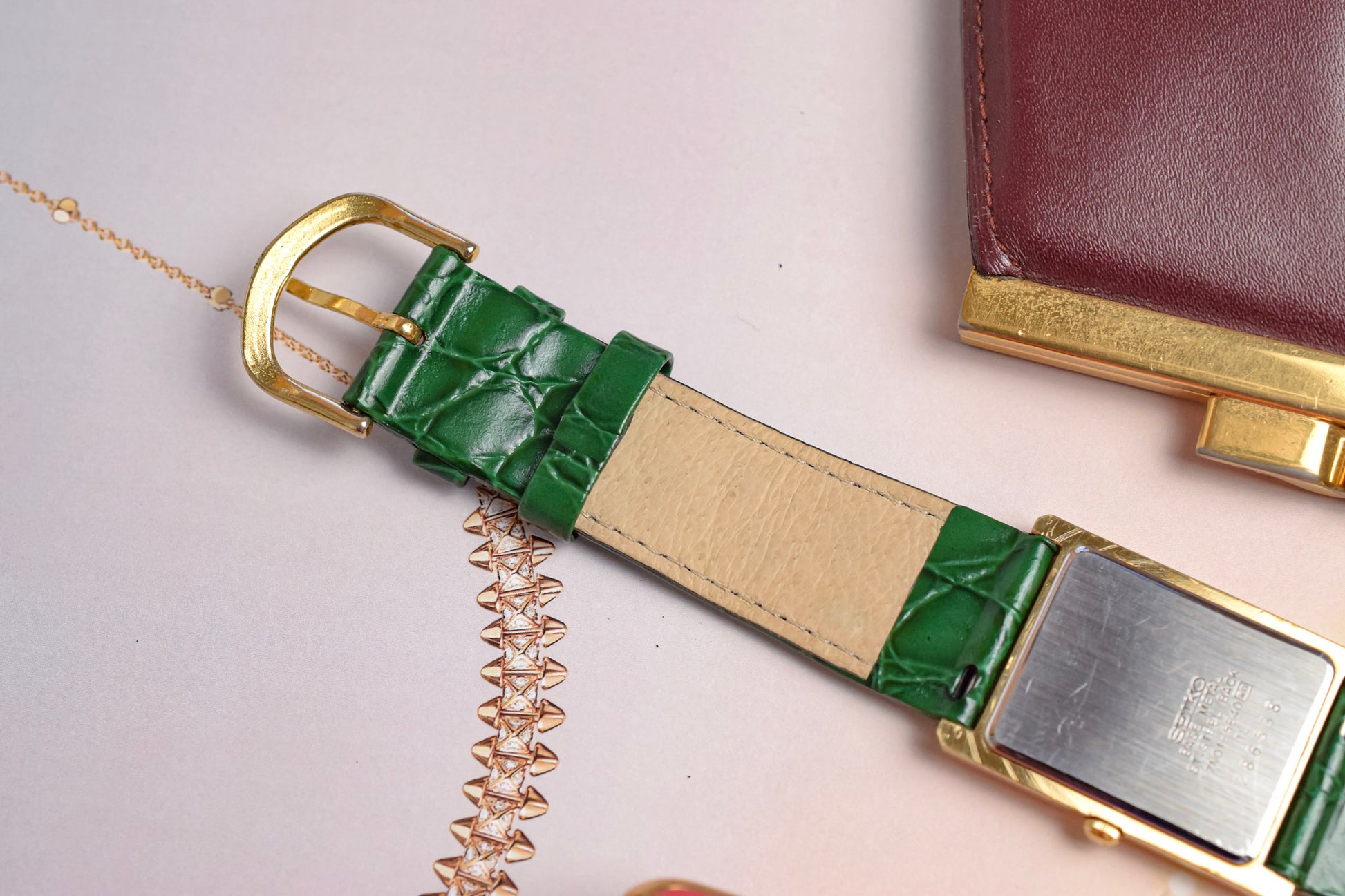 A classic Seiko Tank with a clean white roman dial, gold tone tank style case, elegant leaf hands, original crown, and aftermarket croc grain green leather strap by Hirsch. All inspired by the classic Cartier Tank design language for a fraction of the price.