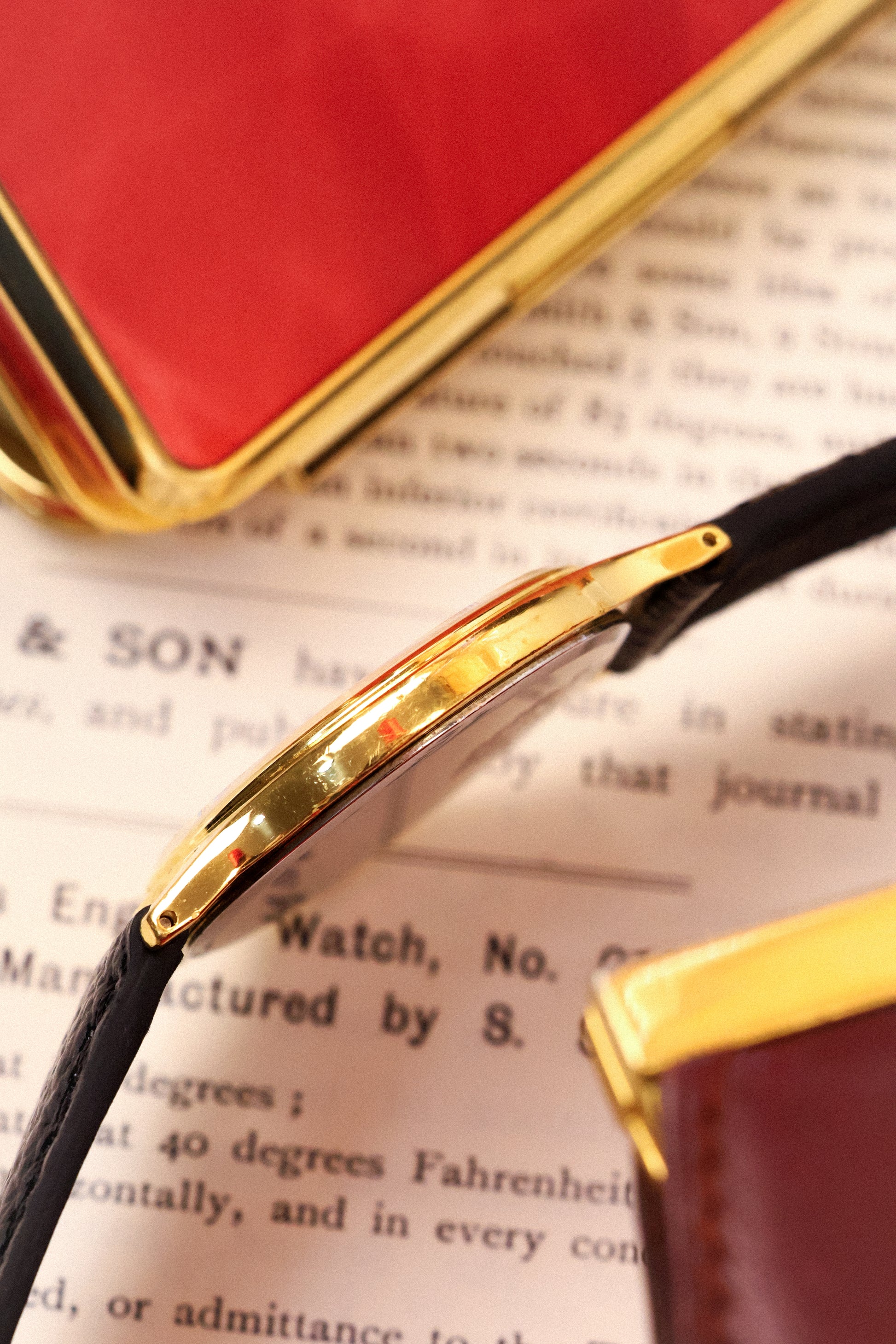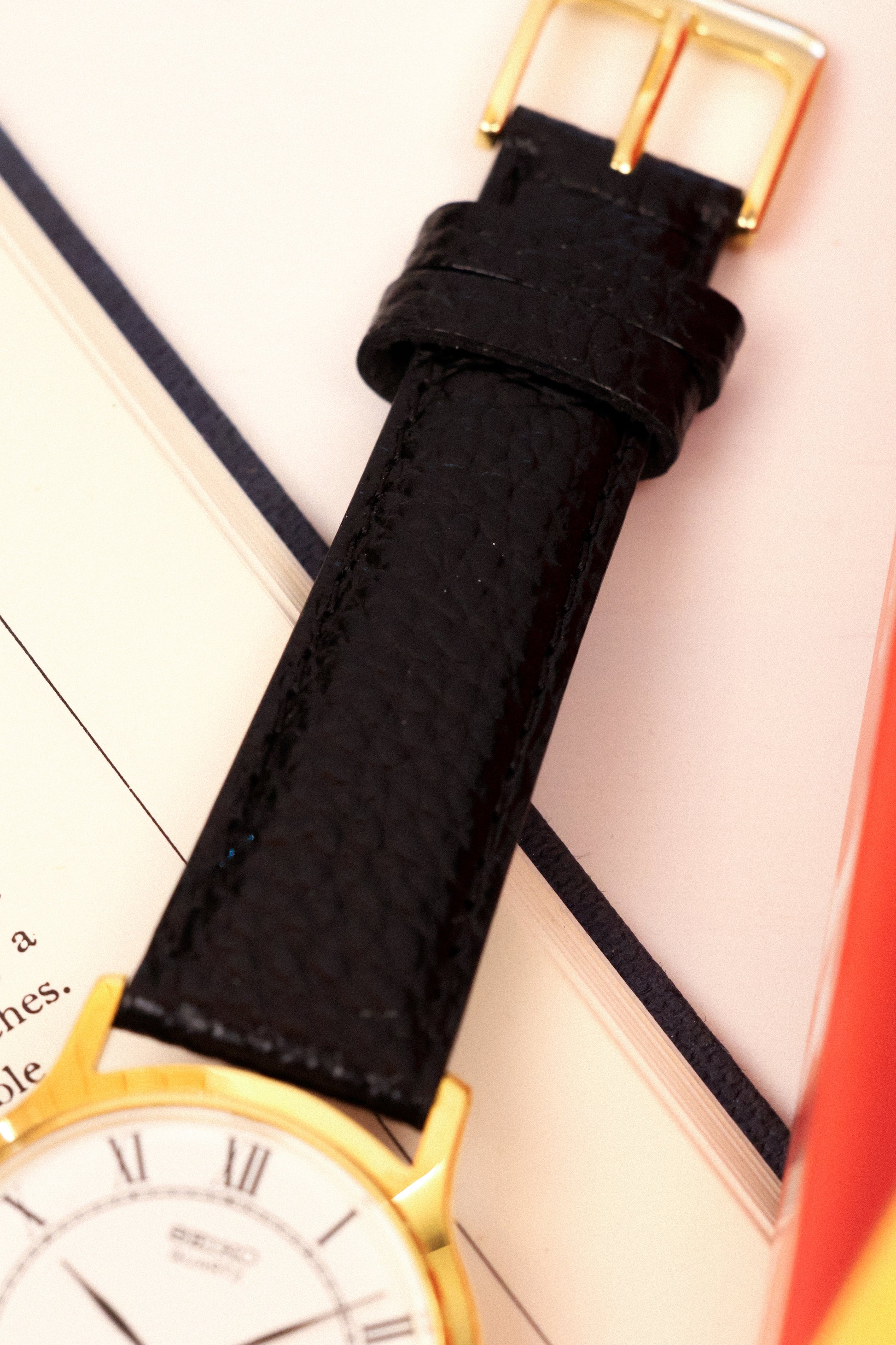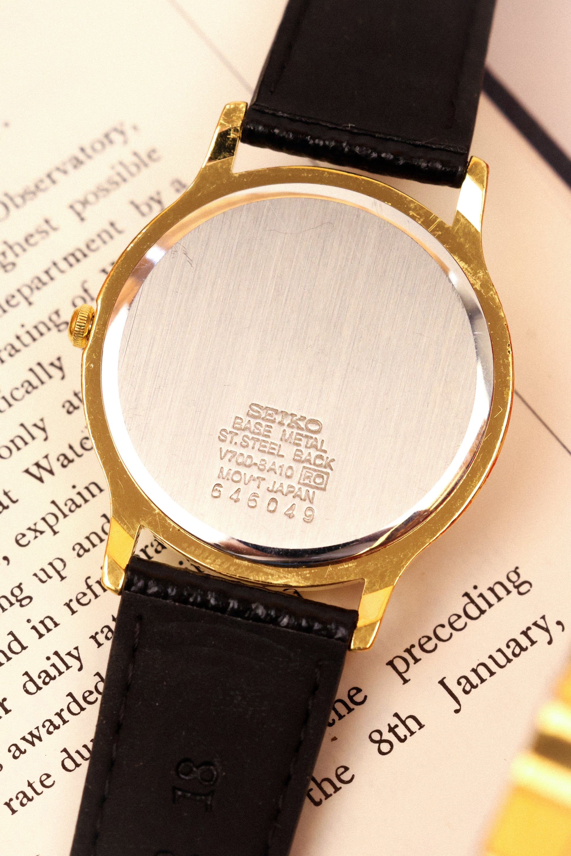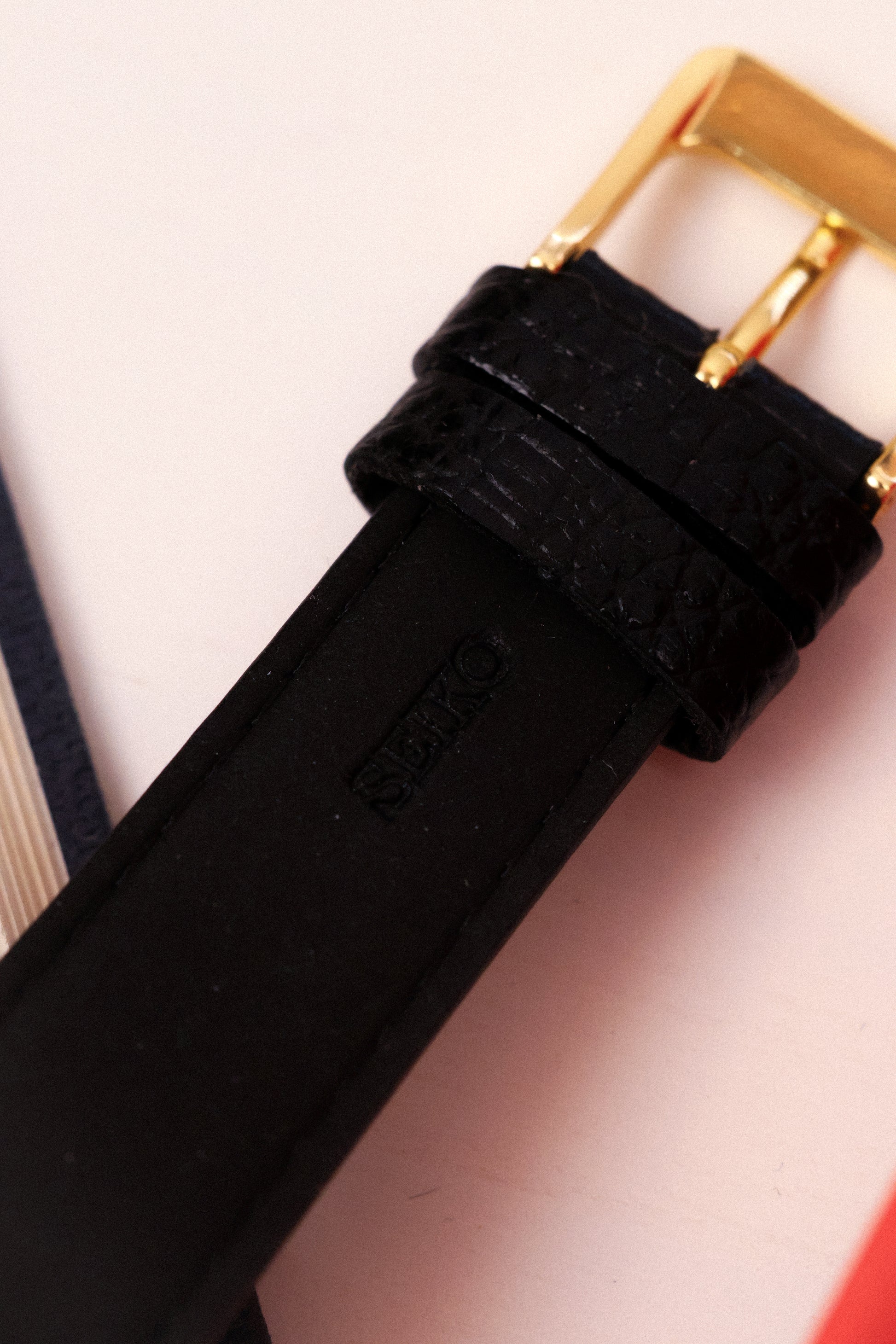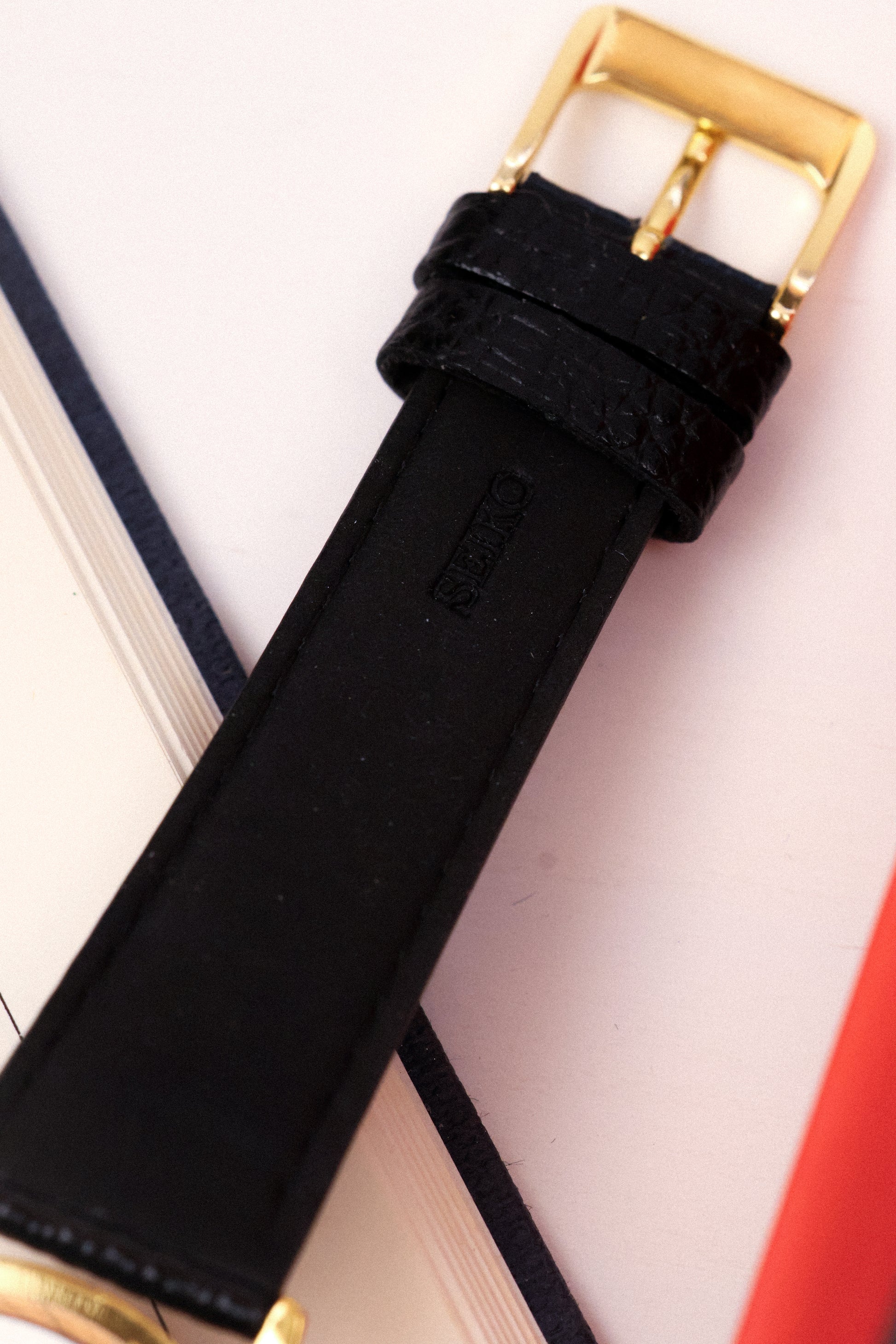 Absolutely stunning Seiko with gold tone case, thick lugs, white sector dial with printed Roman numerals, elegant leaf hands, and original crown. Comes with a new OEM genuine Seiko black leather strap.