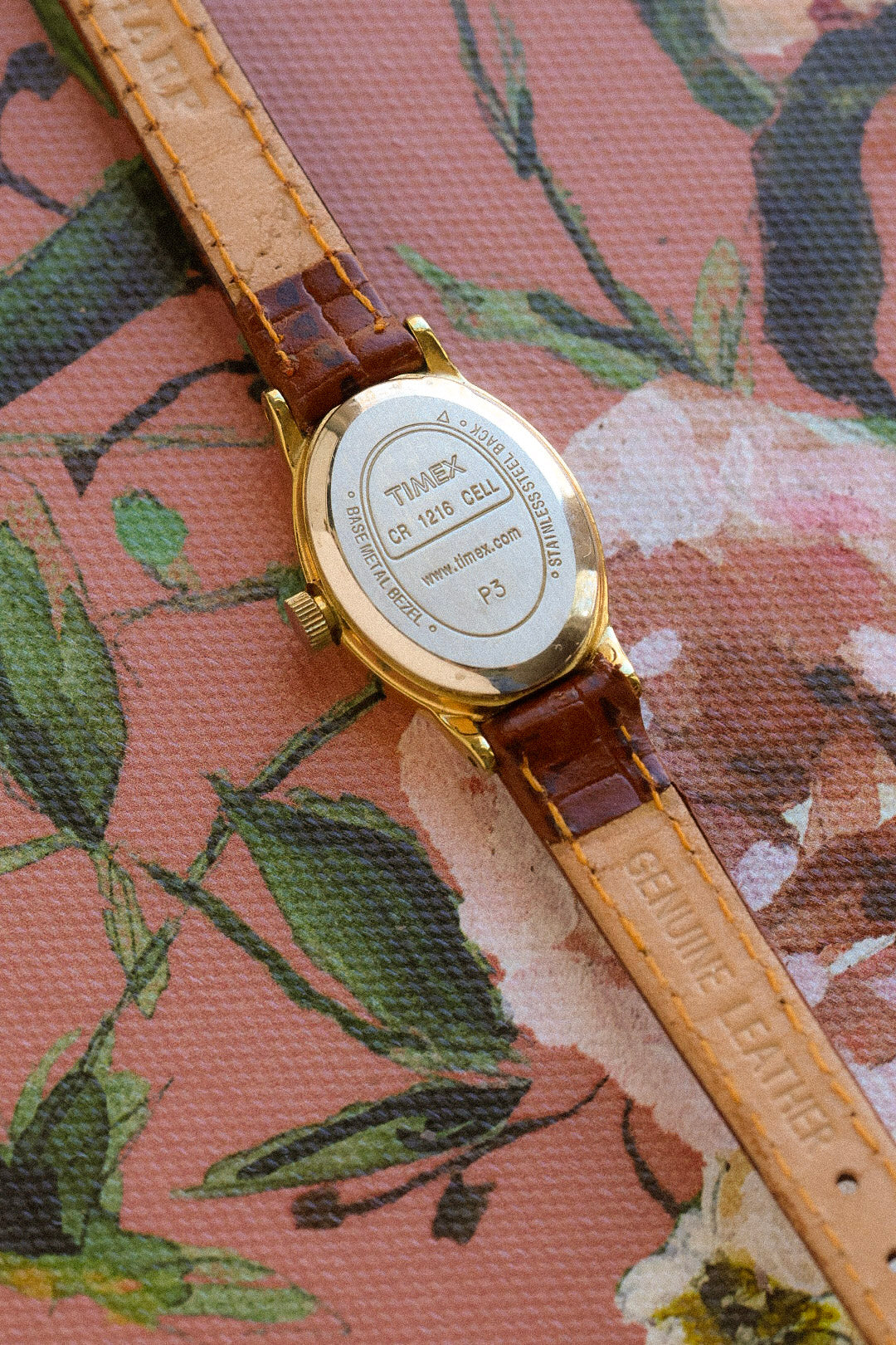 Beautiful Timex mini baignoire from 2006 - featuring a gold tone case, white dial, printed Arabic numerals, elegant pencil hands, and iconic logo. Comes with a new old stock aftermarket brown leather strap.