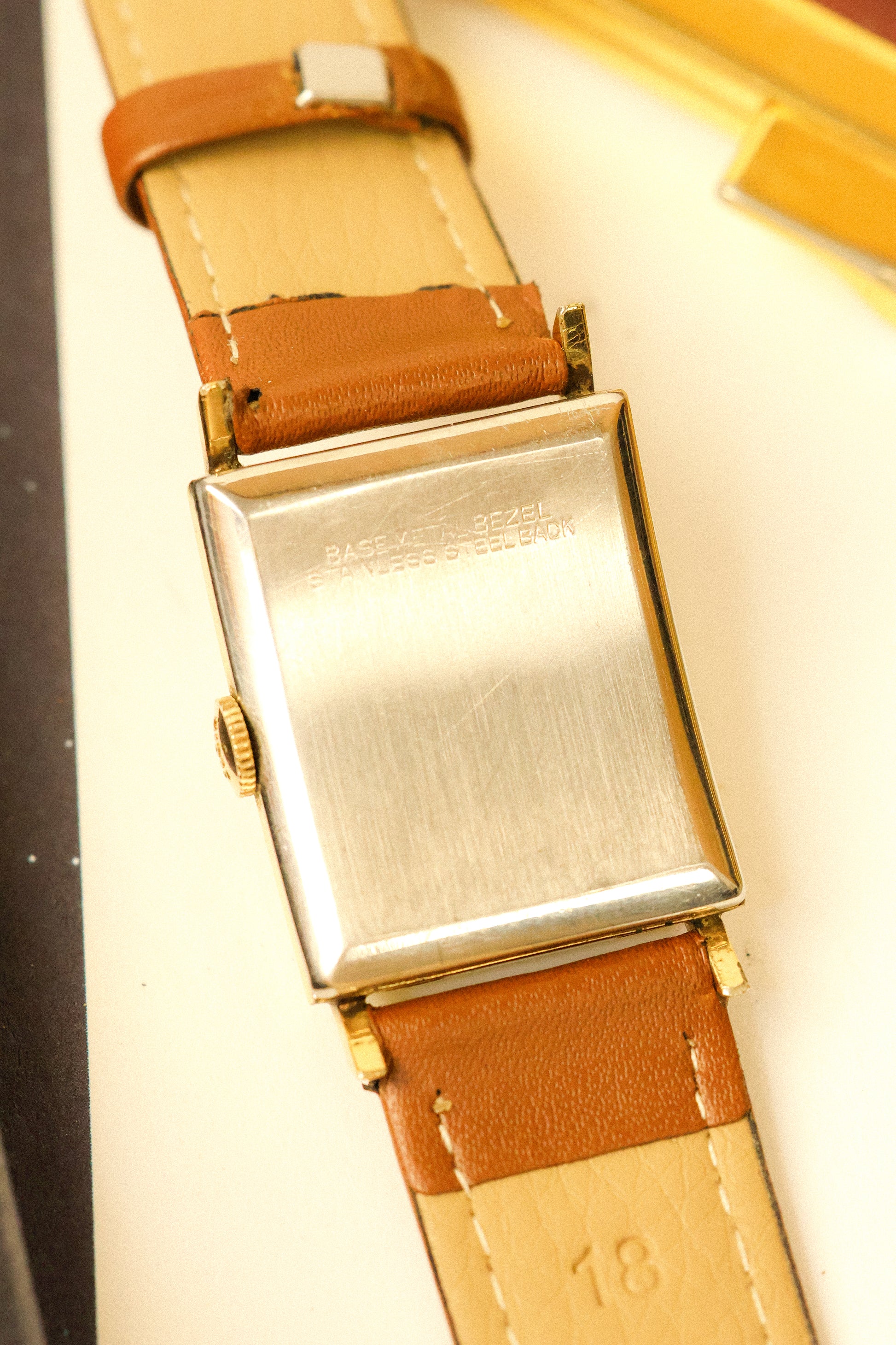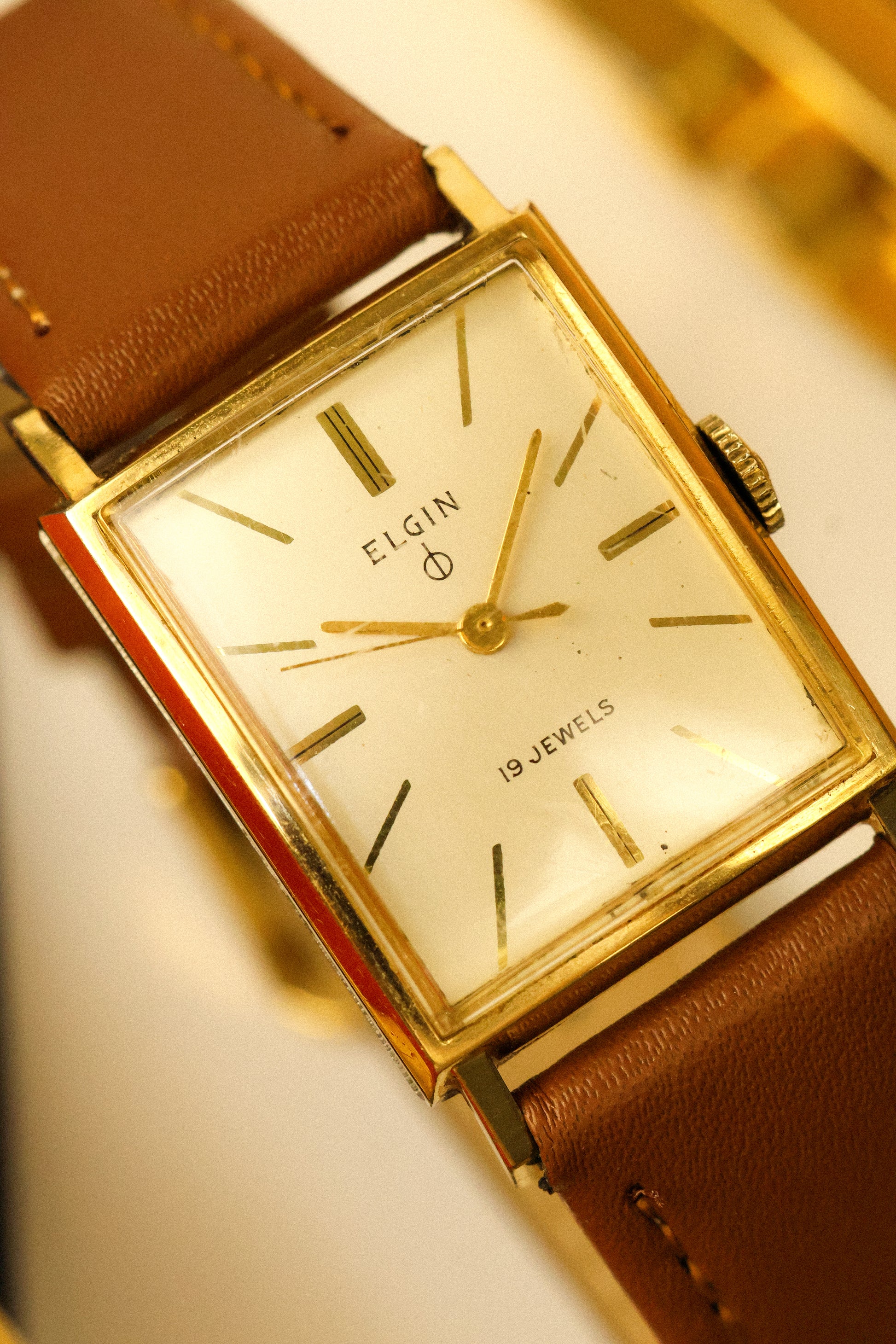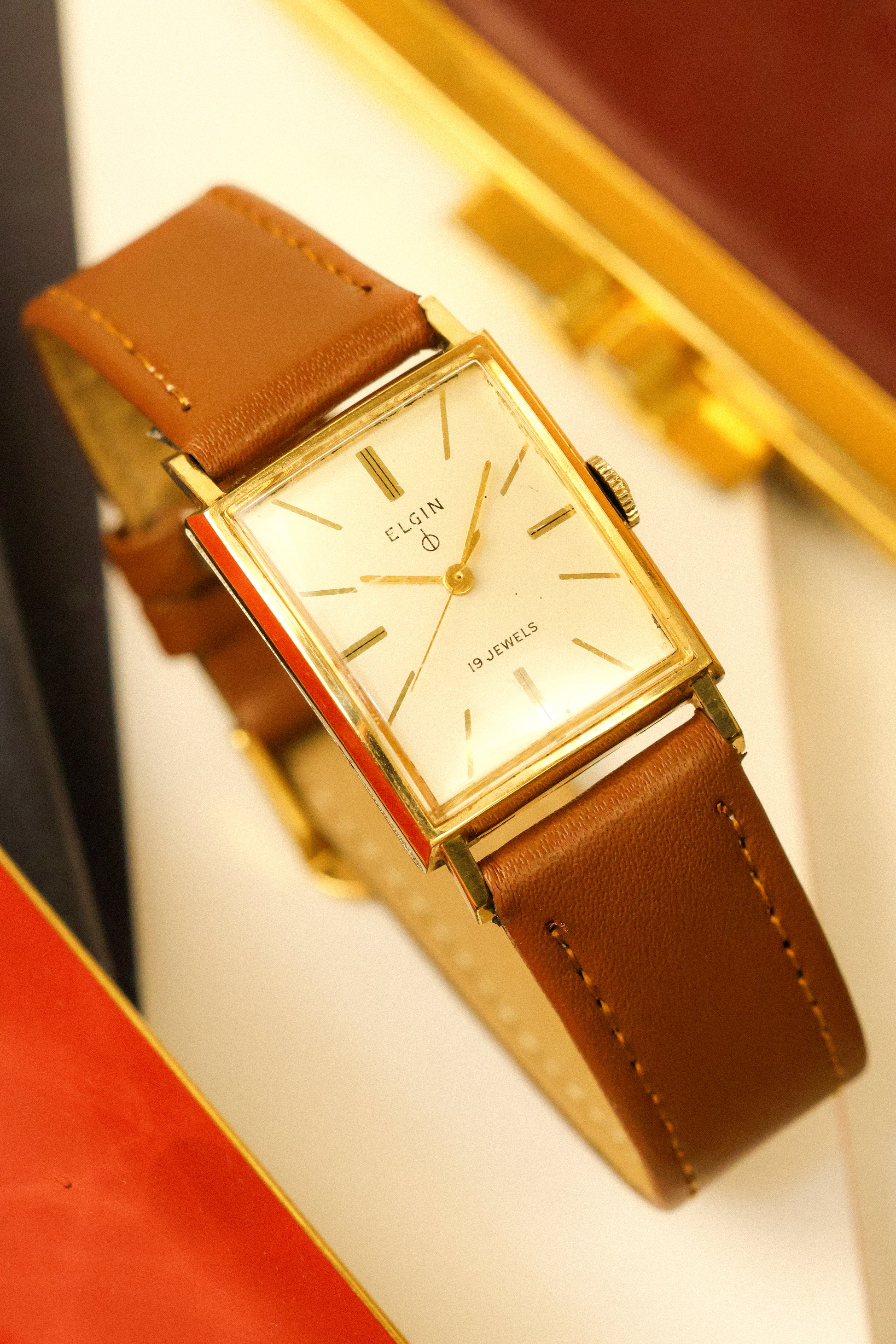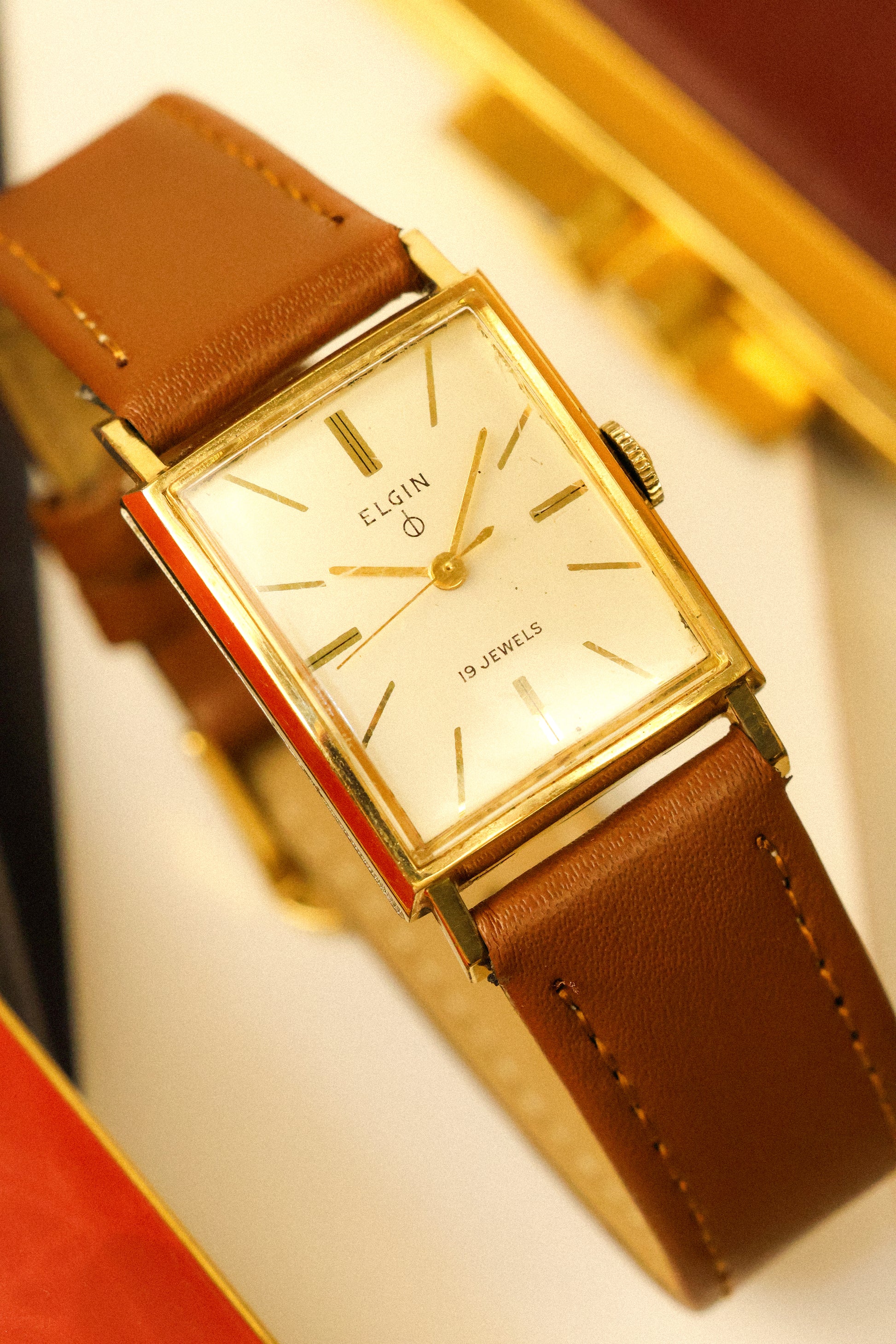 A marvelous piece of American watchmaking history! An original 1958 American made Elgin Tank with a gold tone case, silver dial, elegant pencil hands, applied indices, and original signed crown. Comes with a new aftermarket brown leather strap.