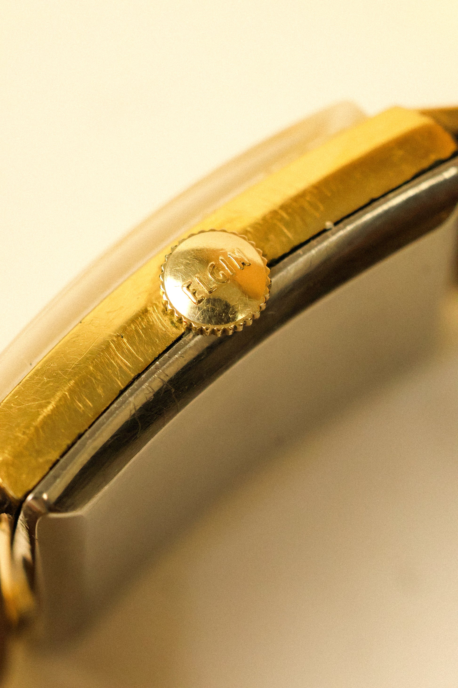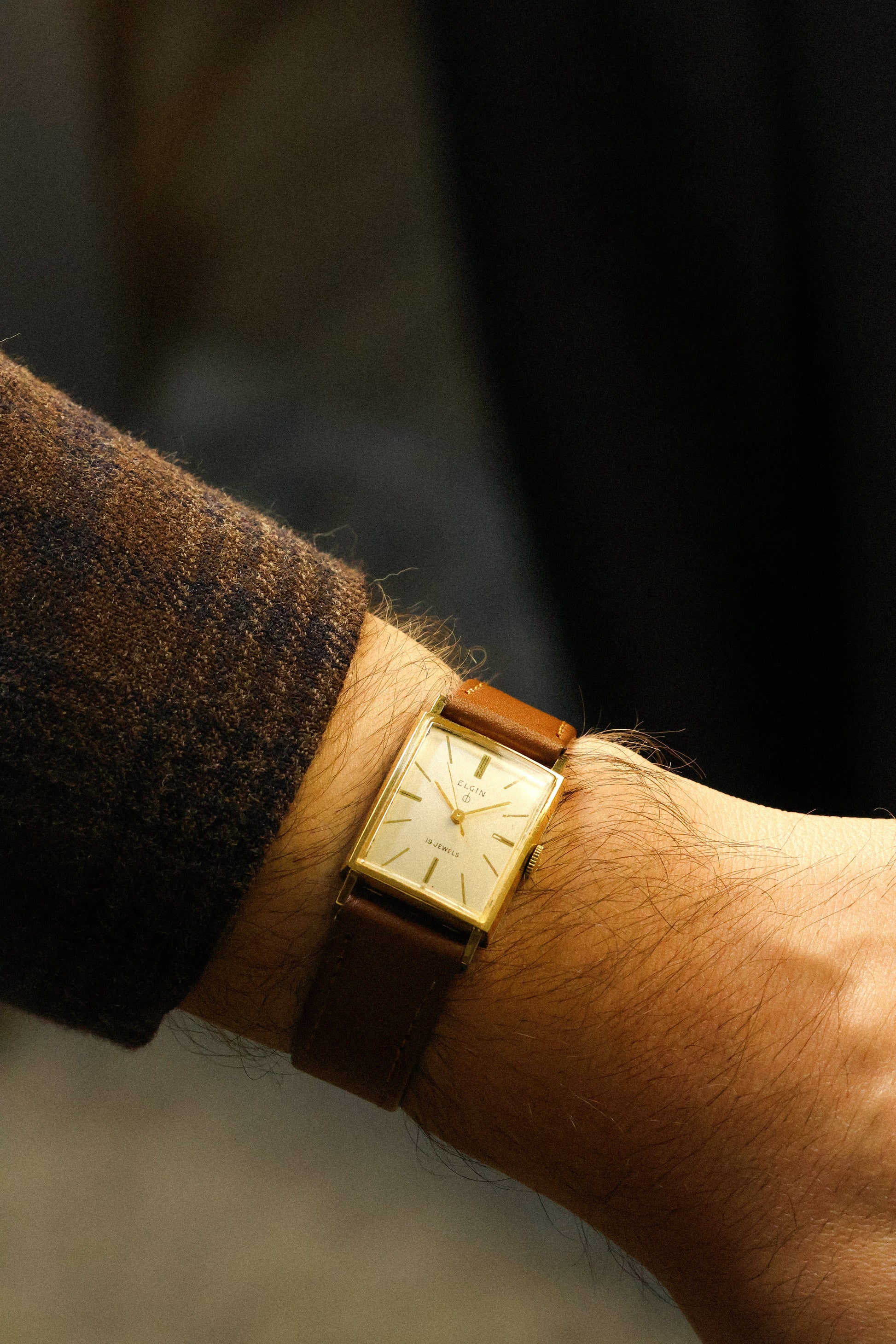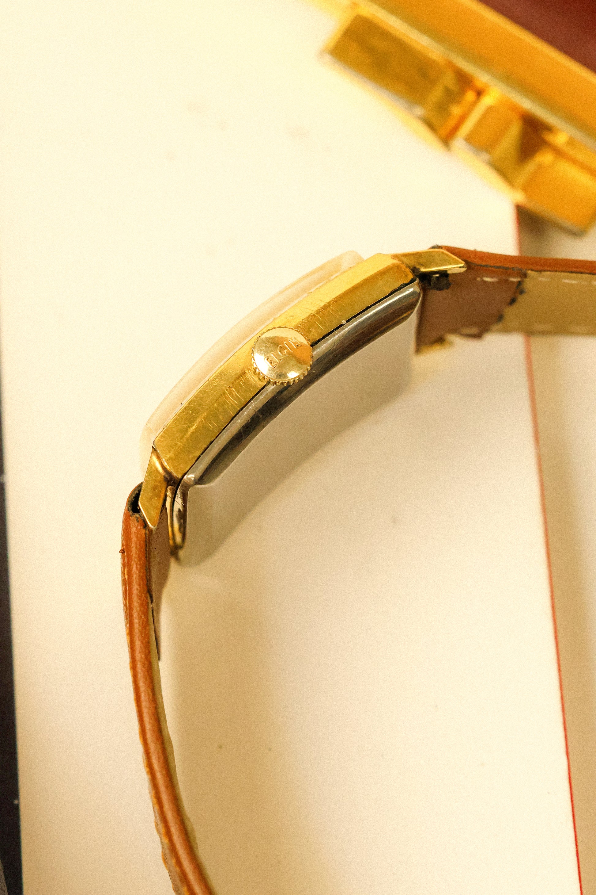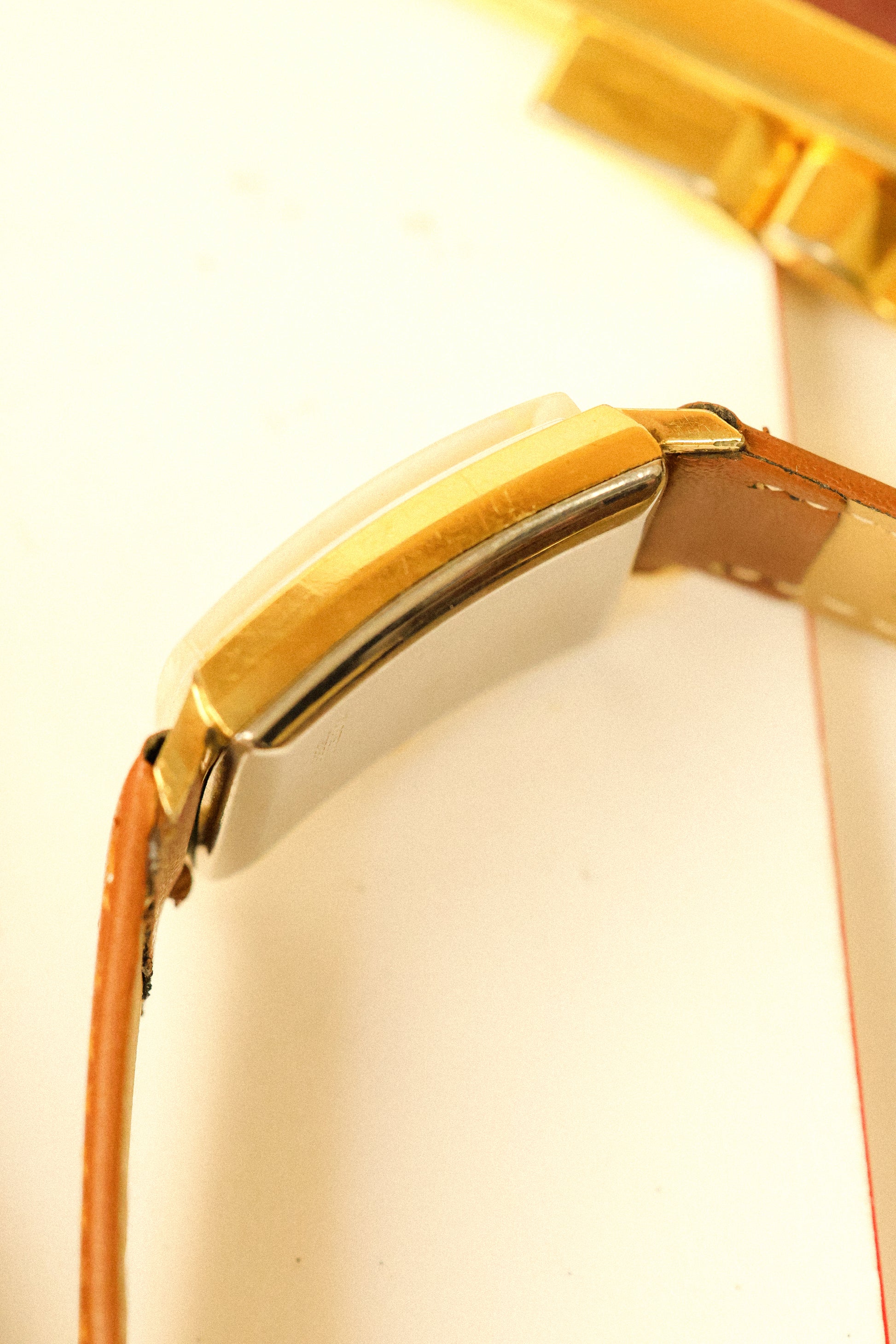 A marvelous piece of American watchmaking history! An original 1958 American made Elgin Tank with a gold tone case, silver dial, elegant pencil hands, applied indices, and original signed crown. Comes with a new aftermarket brown leather strap.